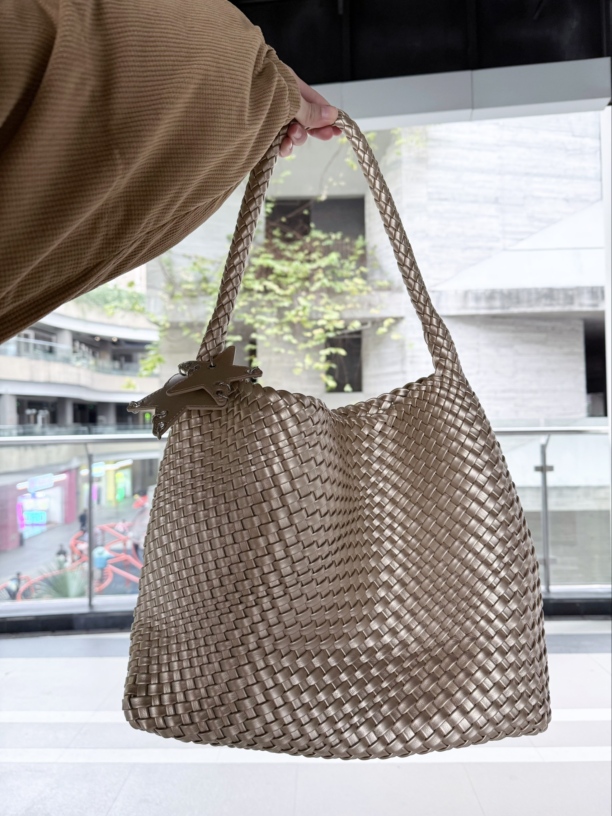 又能装又好看的托特包!这只的颜色是高级的香槟金,在光下会微微泛着光泽,低调又显贵。全身都是手工编织的纹理,看起来特别有质感,摸起来也软软的。包口的金属扣是亮点,是两个星星,增加了不少精致度,还能防止东西掉出来。 容量超大,笔记本电脑、化妆包、雨伞都能轻松装下,通勤或者短途出游背它都很合适。 👗 职场通勤穿搭方案 • 上装:米白色垂感衬衫 + 浅棕色西装马甲 • 下装:同色系西装阔腿裤 • ...