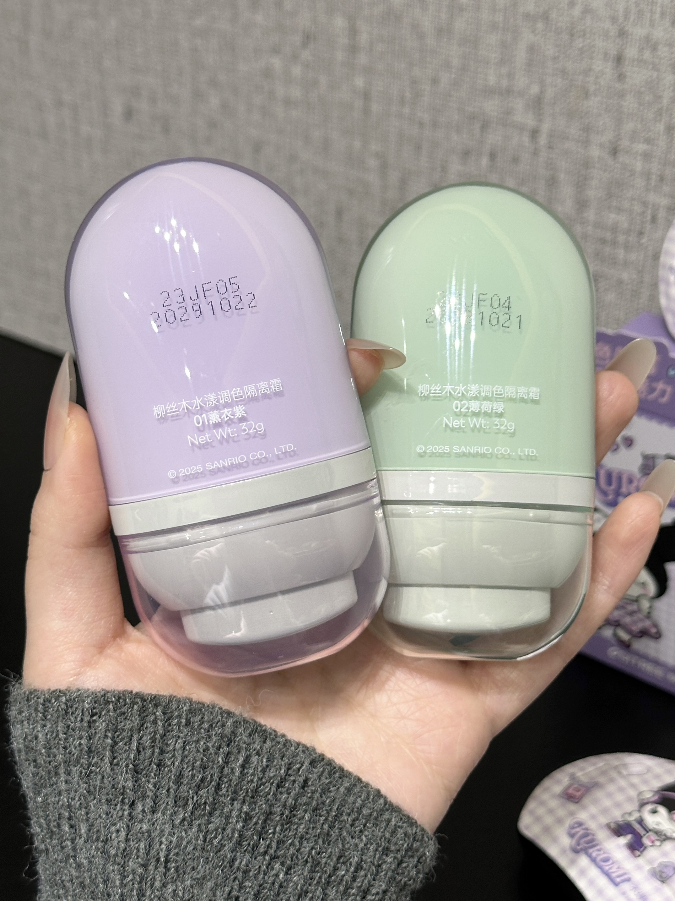 柳丝木你小汁 居然和酷洛米联名了! 就是介个联名款的隔离 包装好可爱哇 我选了薰衣紫和薄荷绿这两支 脸色蜡黄暗沉的时候涂紫色 脸皮泛红的时候涂绿色 我感觉这个质地蛮润的 上脸也不会干到卡纹 还送了软乎乎的棉花糖粉扑 现在每天都离不开它啦!