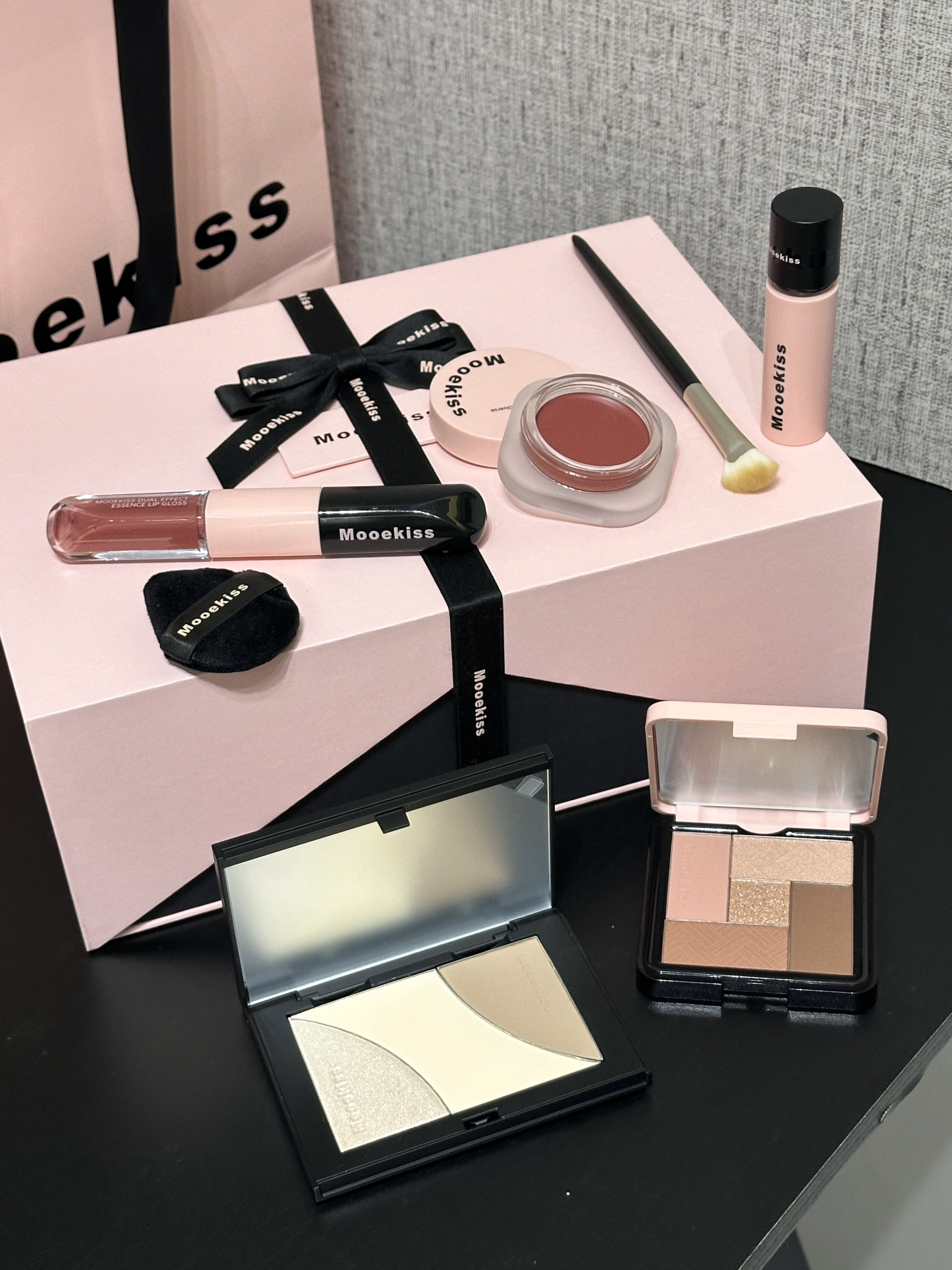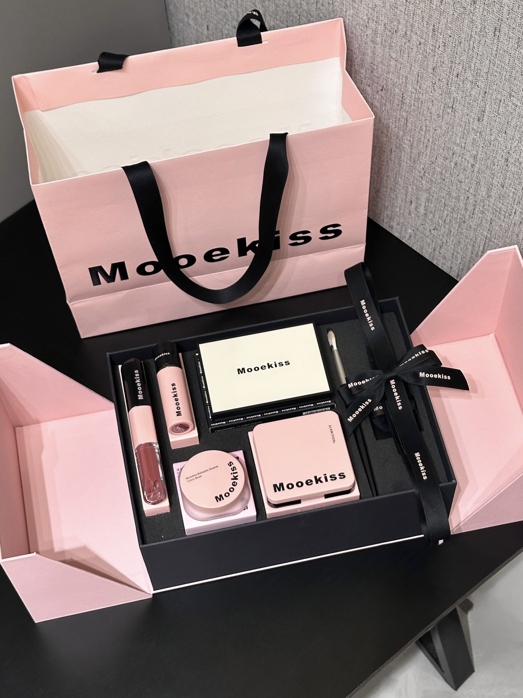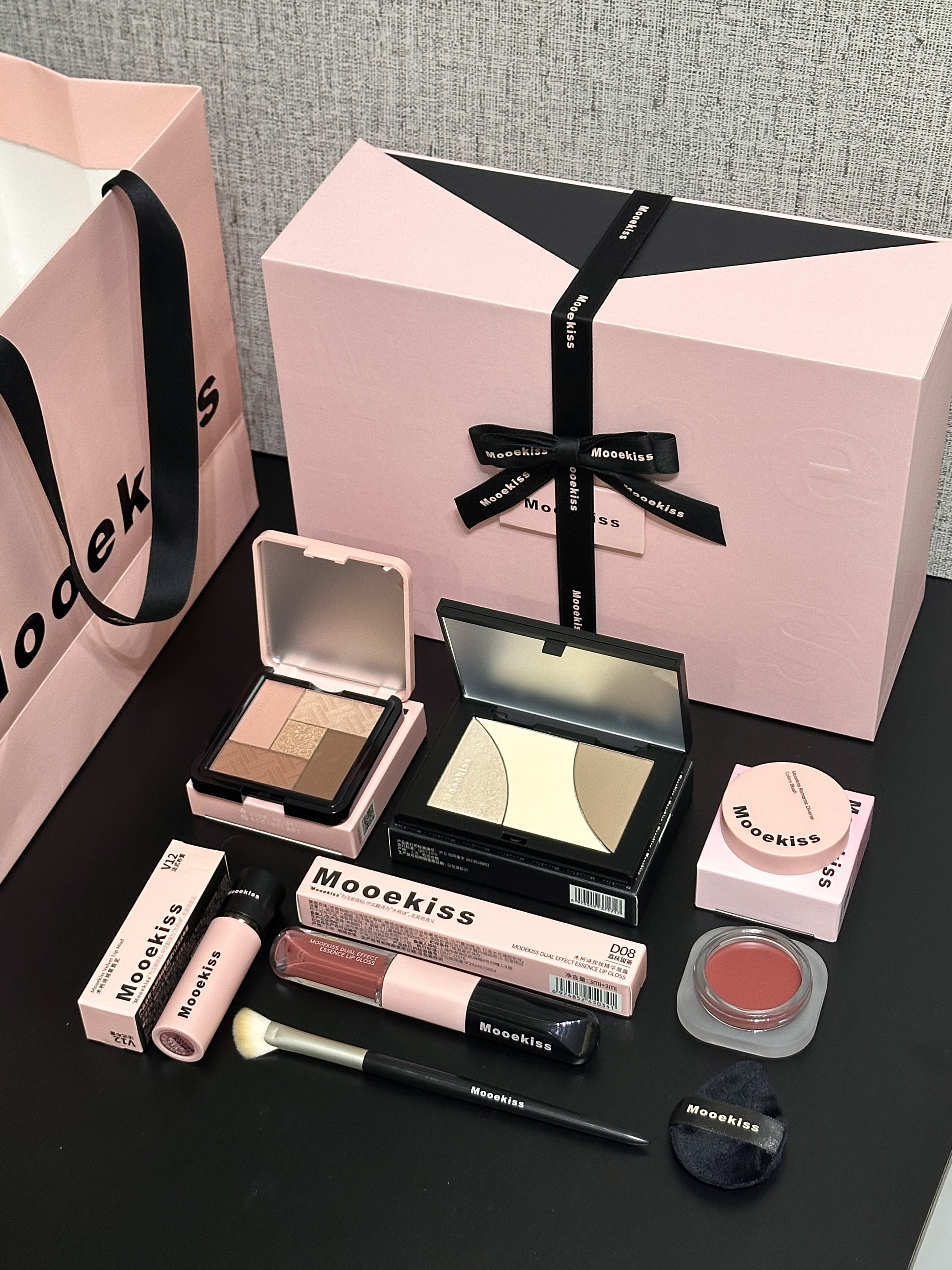 试问谁会拒绝这个黑粉配色的礼盒哇 礼盒包装 我感觉还挺大气的 打开之后里面有日常化妆能用到的彩妆:眼影、修容盘、双头唇釉、唇泥和腮红,还有化妆刷和拇指粉扑 眼影盘上眼挺好晕染的 化妆新手用它没问题 修容上脸蛮自然 不会显脏 两支唇釉也是我喜欢的色号 显的人气色很好 日常出门用这一套彩妆就够啦 我感觉它实用又貌美~