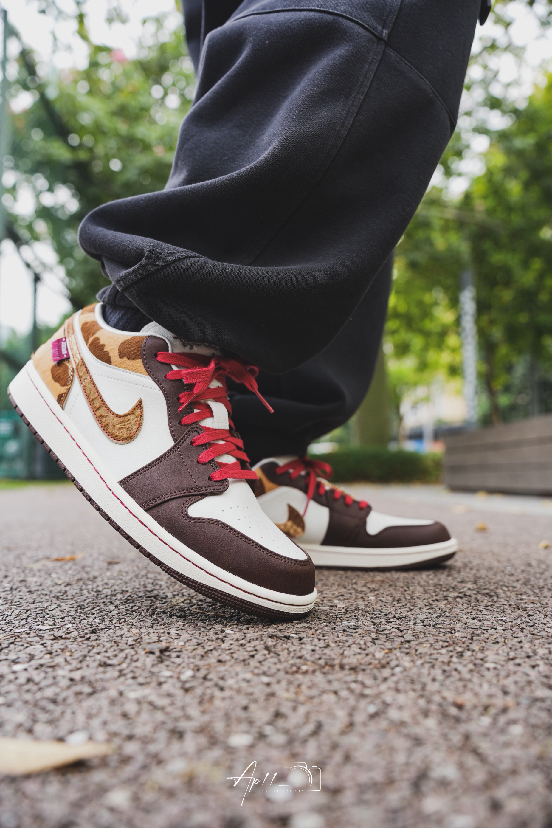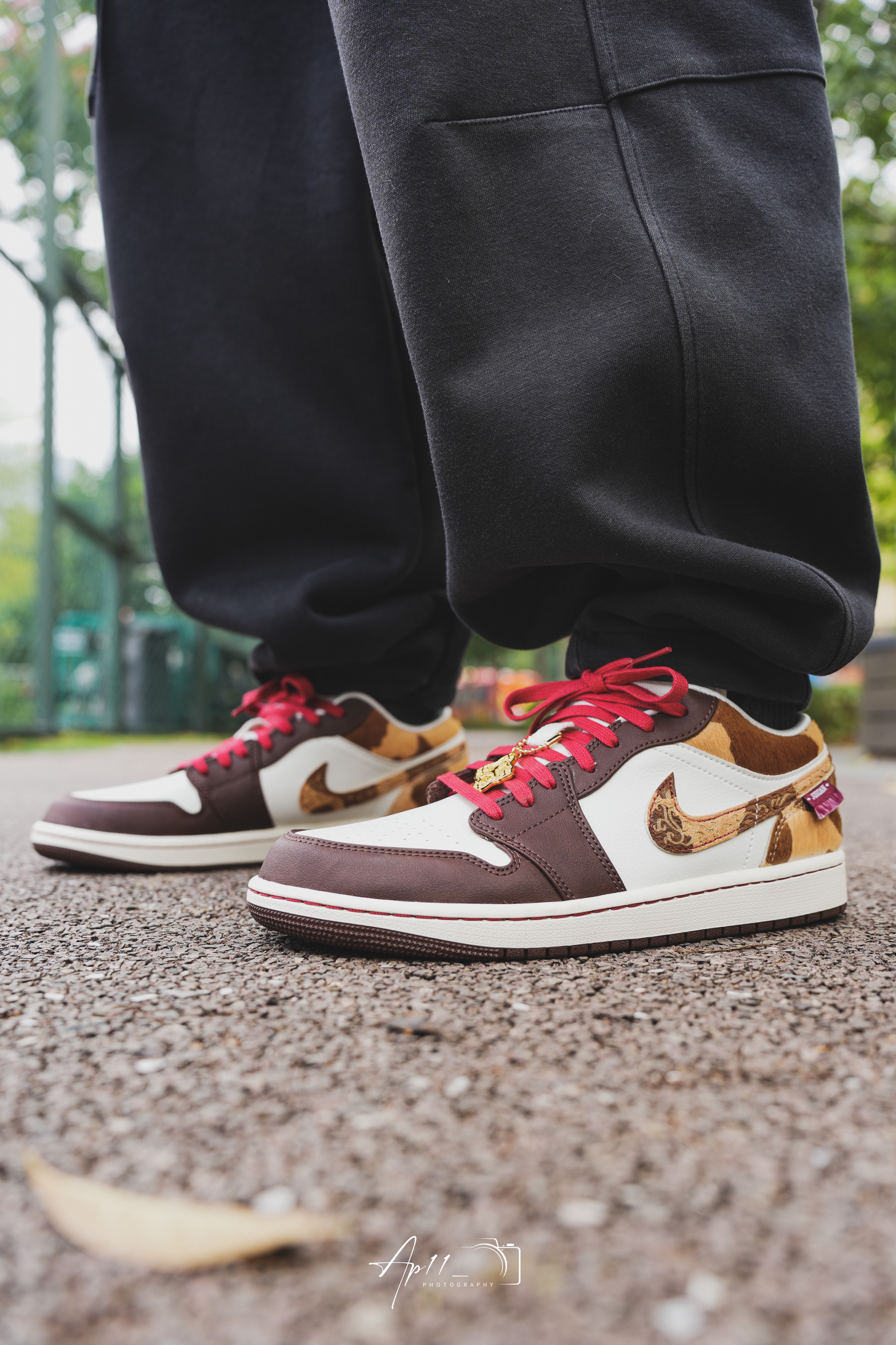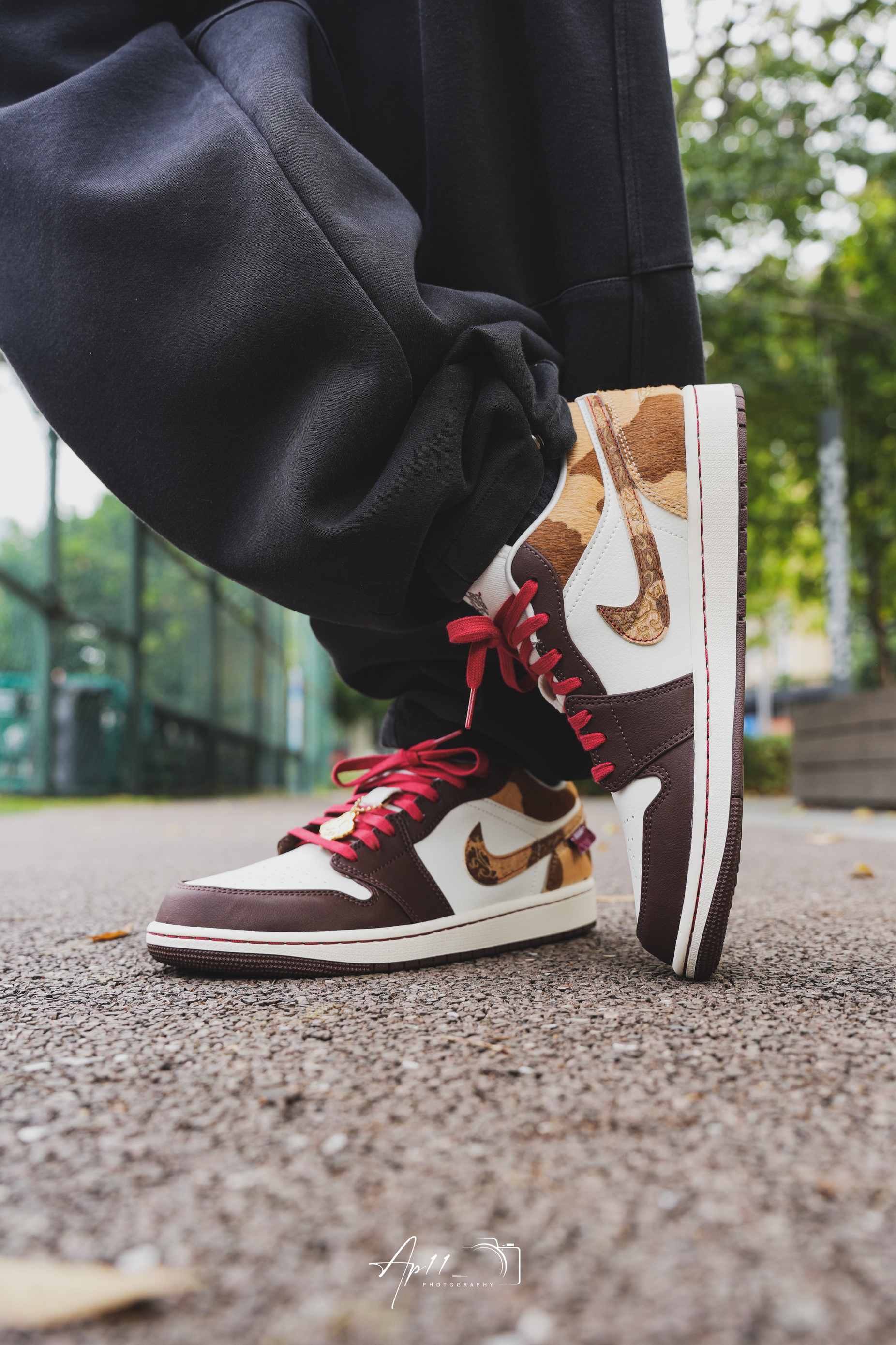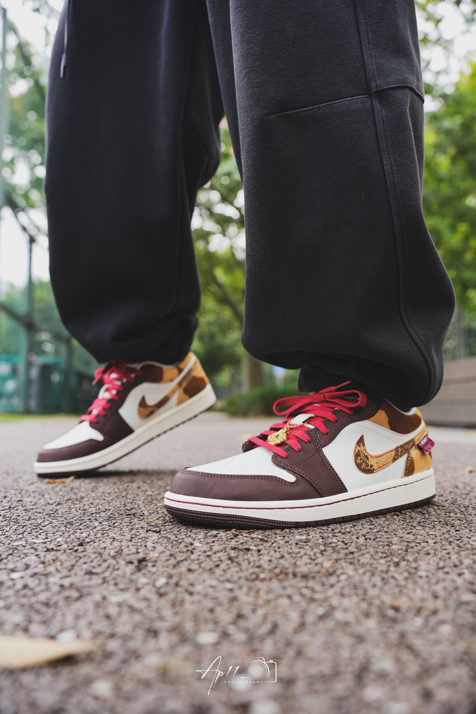 上脚这双马年AJ1,第一眼就被棕白撞红的配色戳中了。深棕的鞋头搭奶白鞋身,红鞋带像系了根新年红绳,马纹纹理的勾子还藏着生肖巧思。配黑裤子出门,配色在日常里透着点新年的暖意,走在路上都觉得这抹棕红把年味拉满了些。