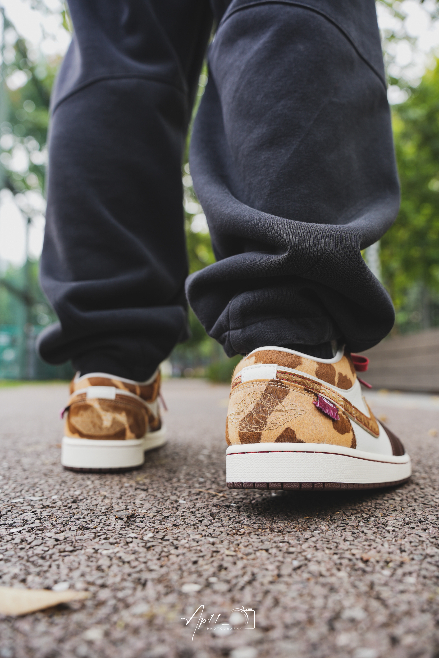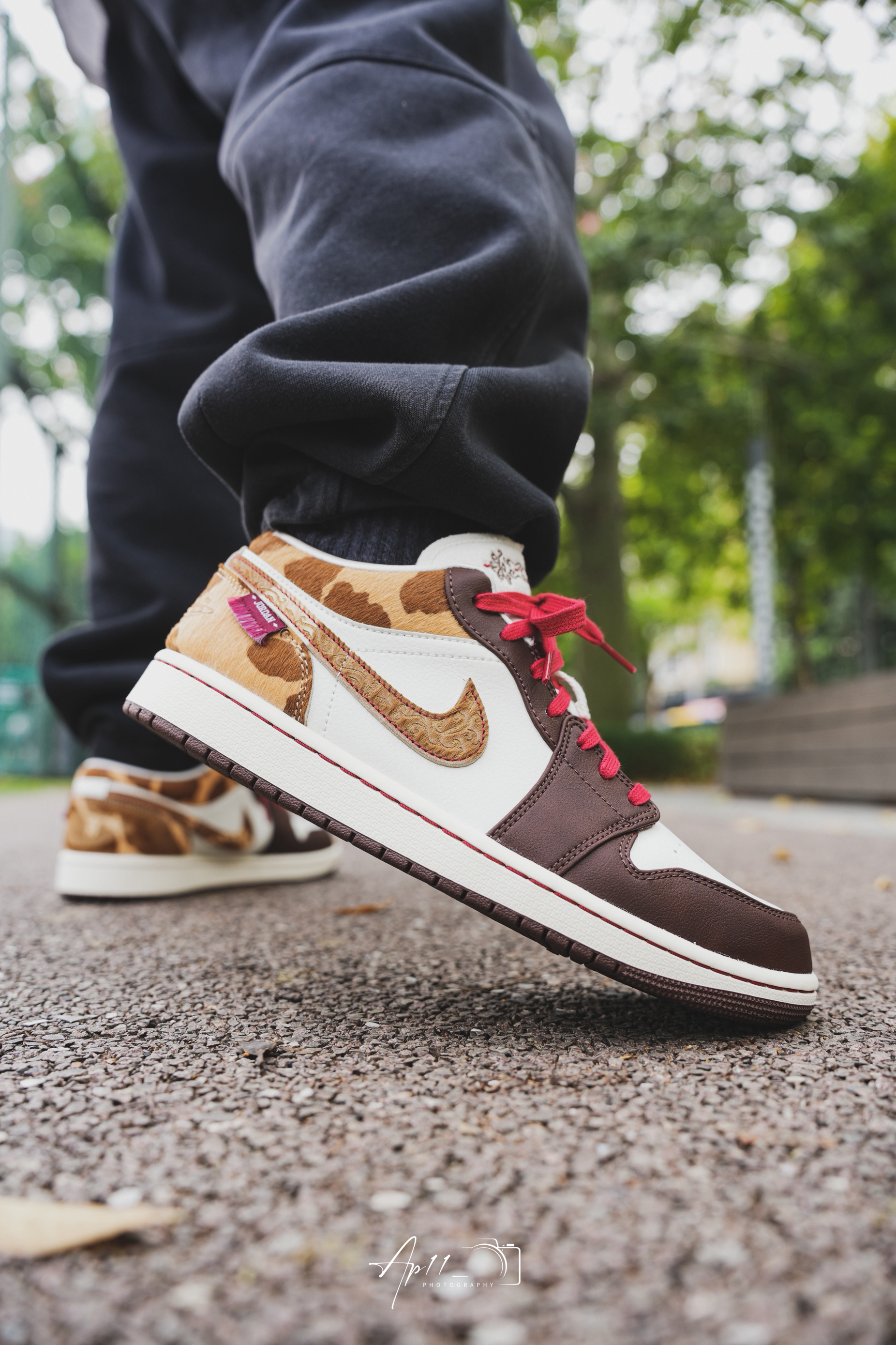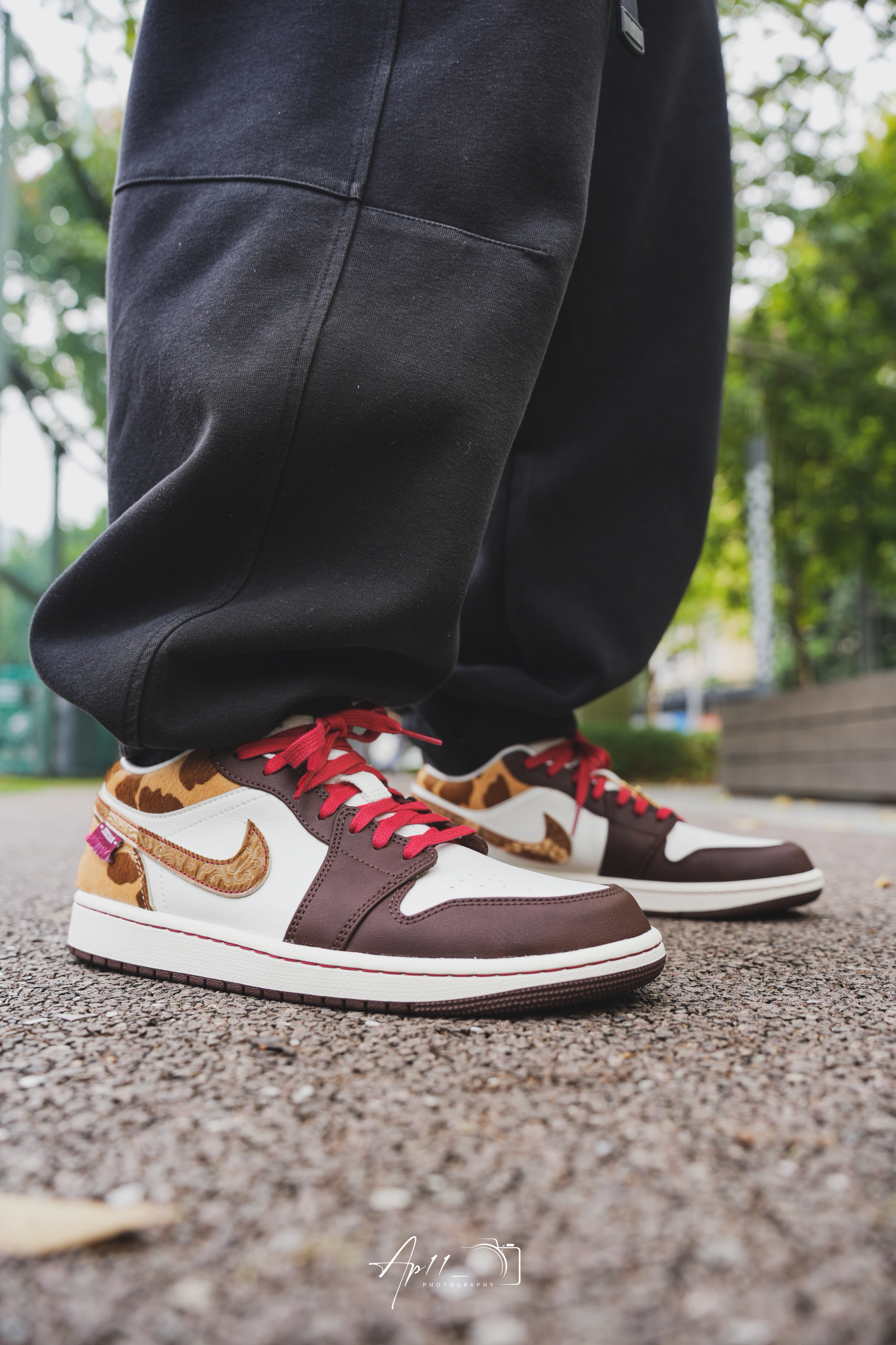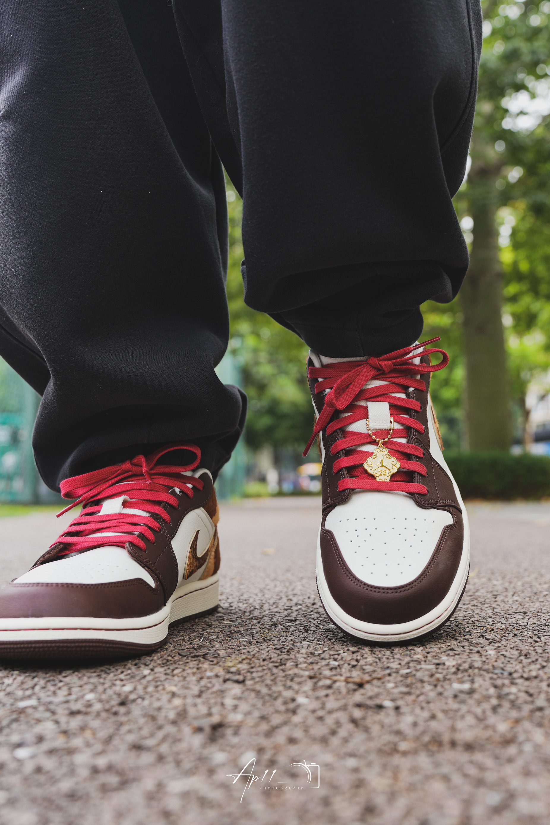 上脚这双马年AJ1,第一眼就被棕白撞红的配色戳中了。深棕的鞋头搭奶白鞋身,红鞋带像系了根新年红绳,马纹纹理的勾子还藏着生肖巧思。配黑裤子出门,配色在日常里透着点新年的暖意,走在路上都觉得这抹棕红把年味拉满了些。