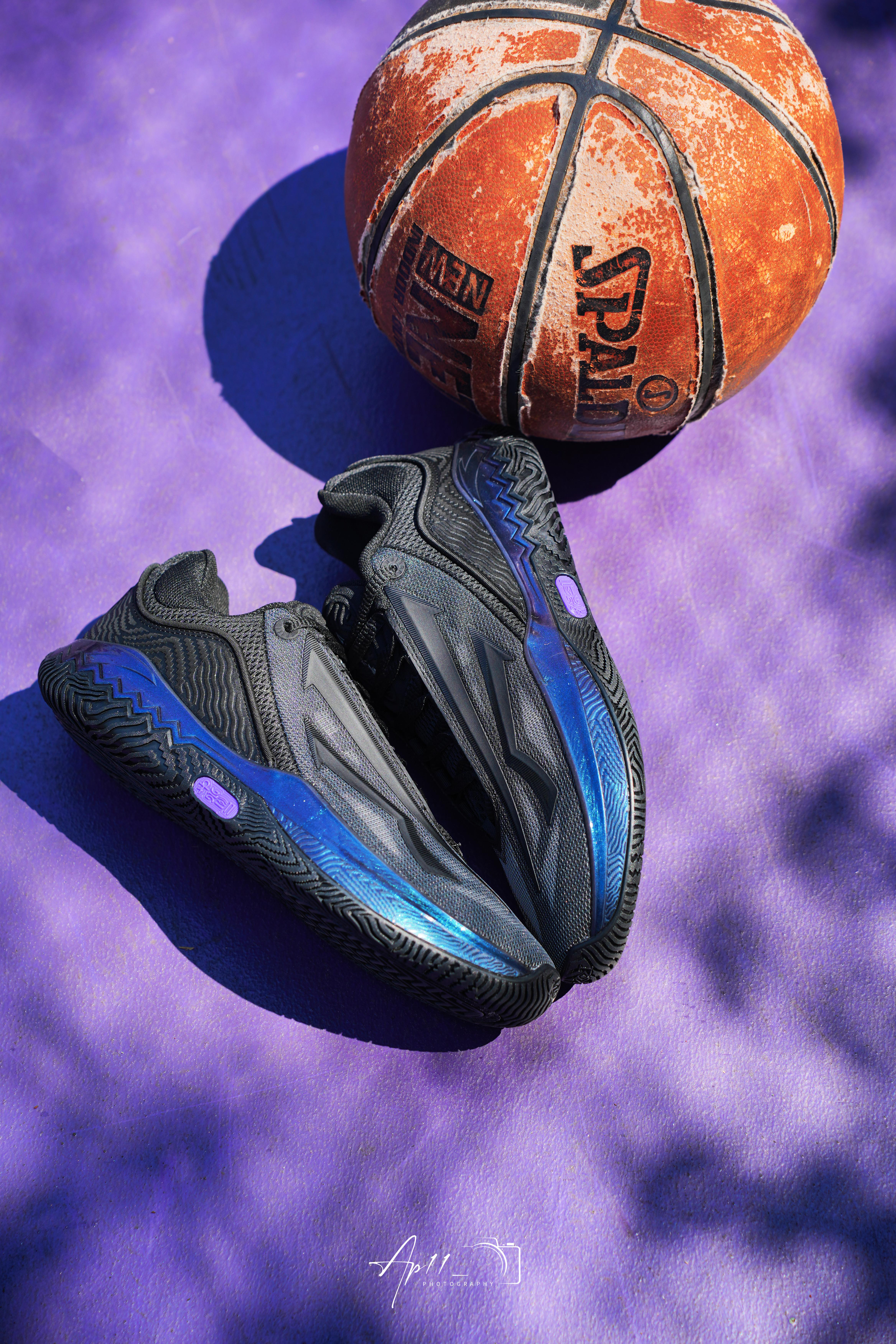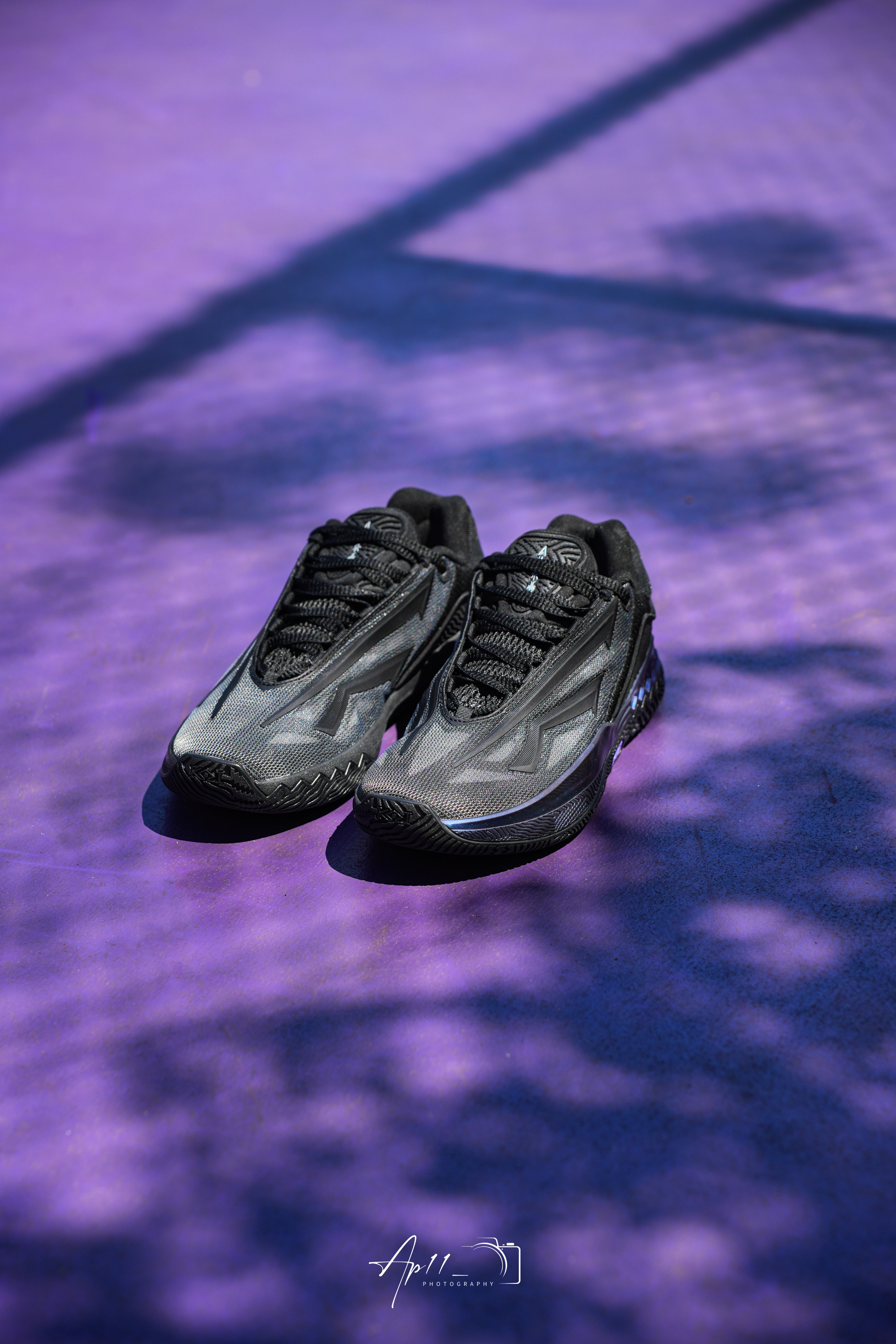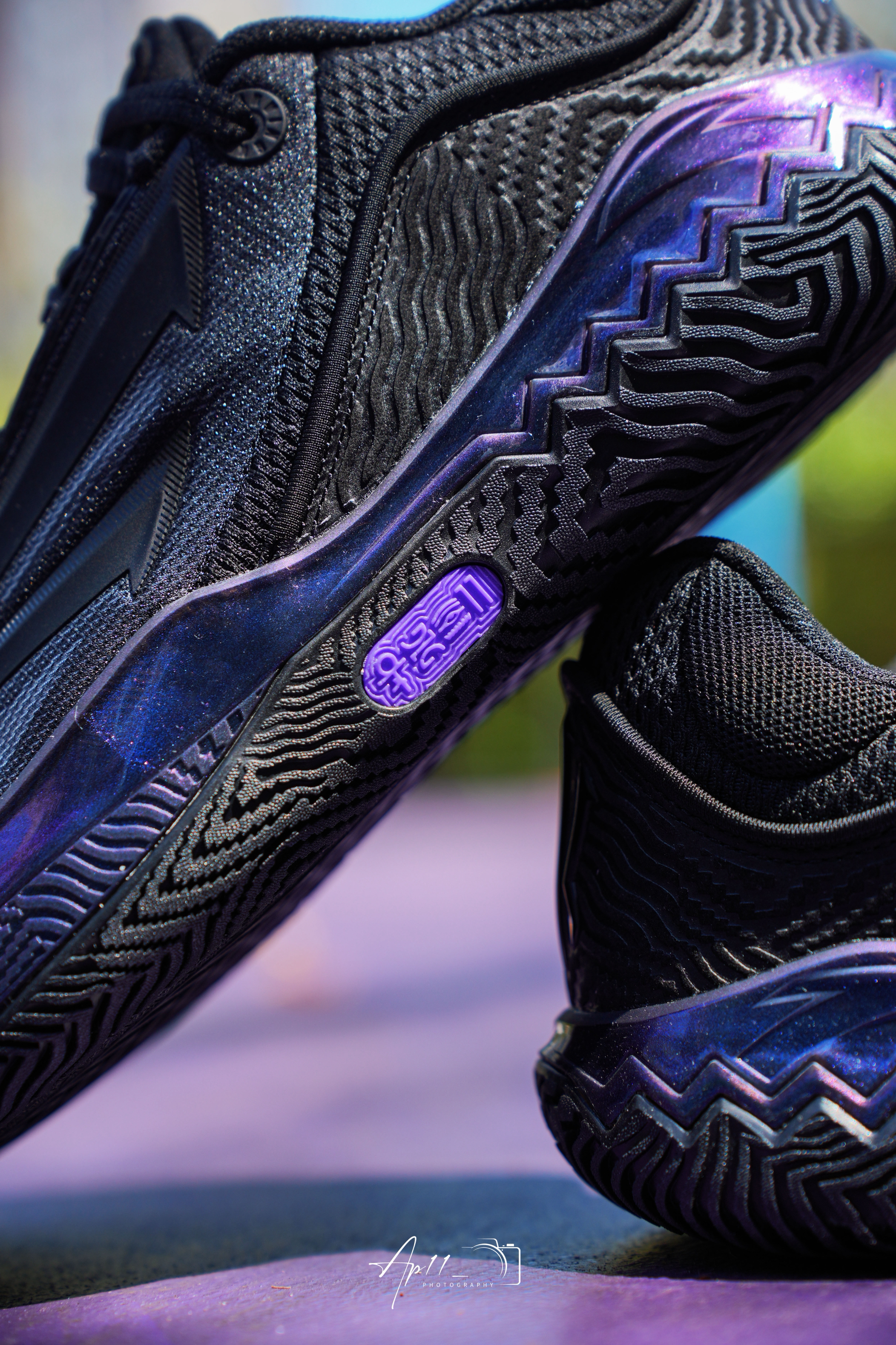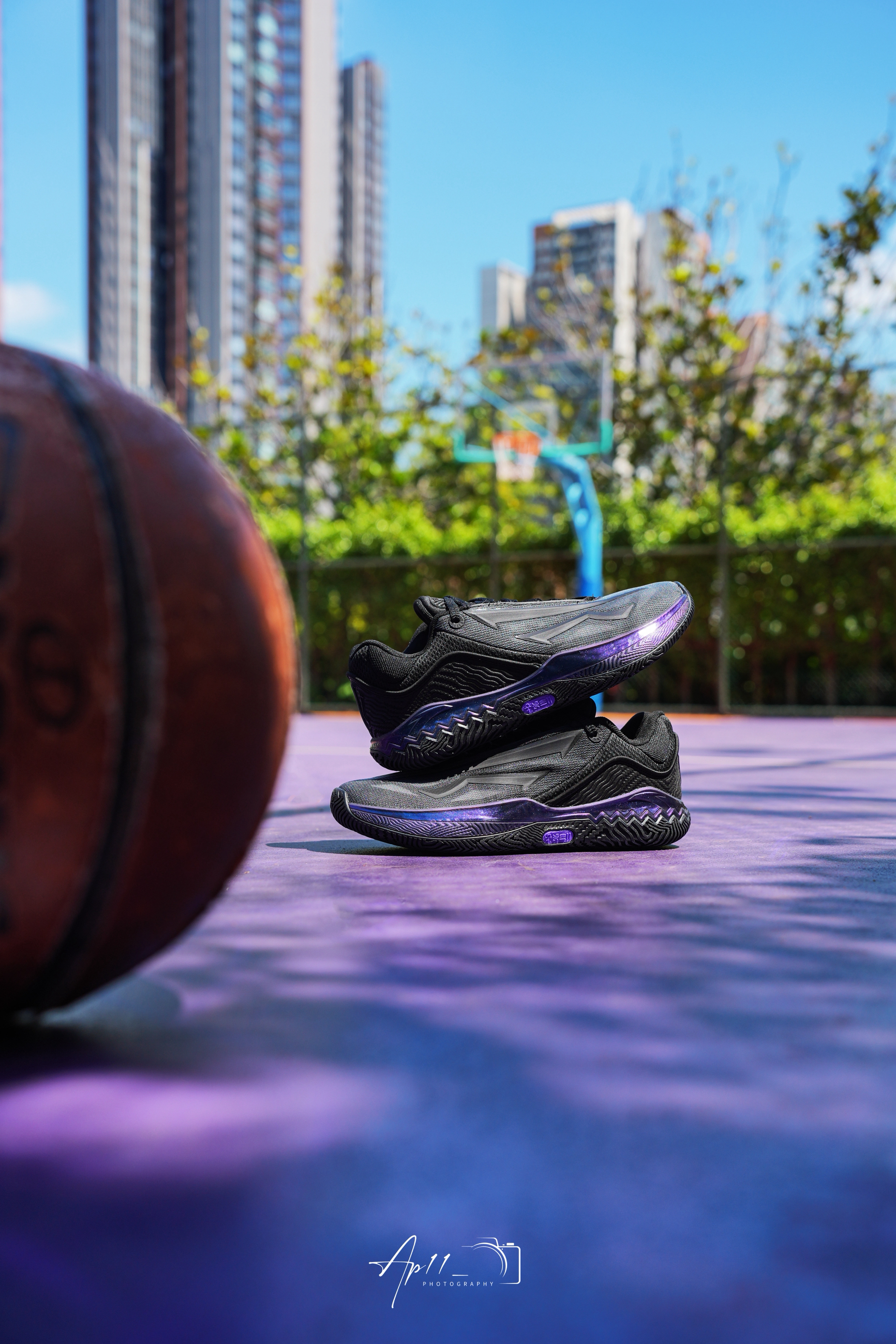 上脚Kai Speed 2黑紫配色的实战鞋,在紫调球场上拍出来的效果超惊艳。全黑鞋身搭着紫蓝渐变的中底,低调里藏着细节感。实战时脚感很稳,抓地也扎实,打完球日常穿也不违和,黑紫配色配运动装或休闲裤都能搭出酷感,是近期打球常穿的一双。