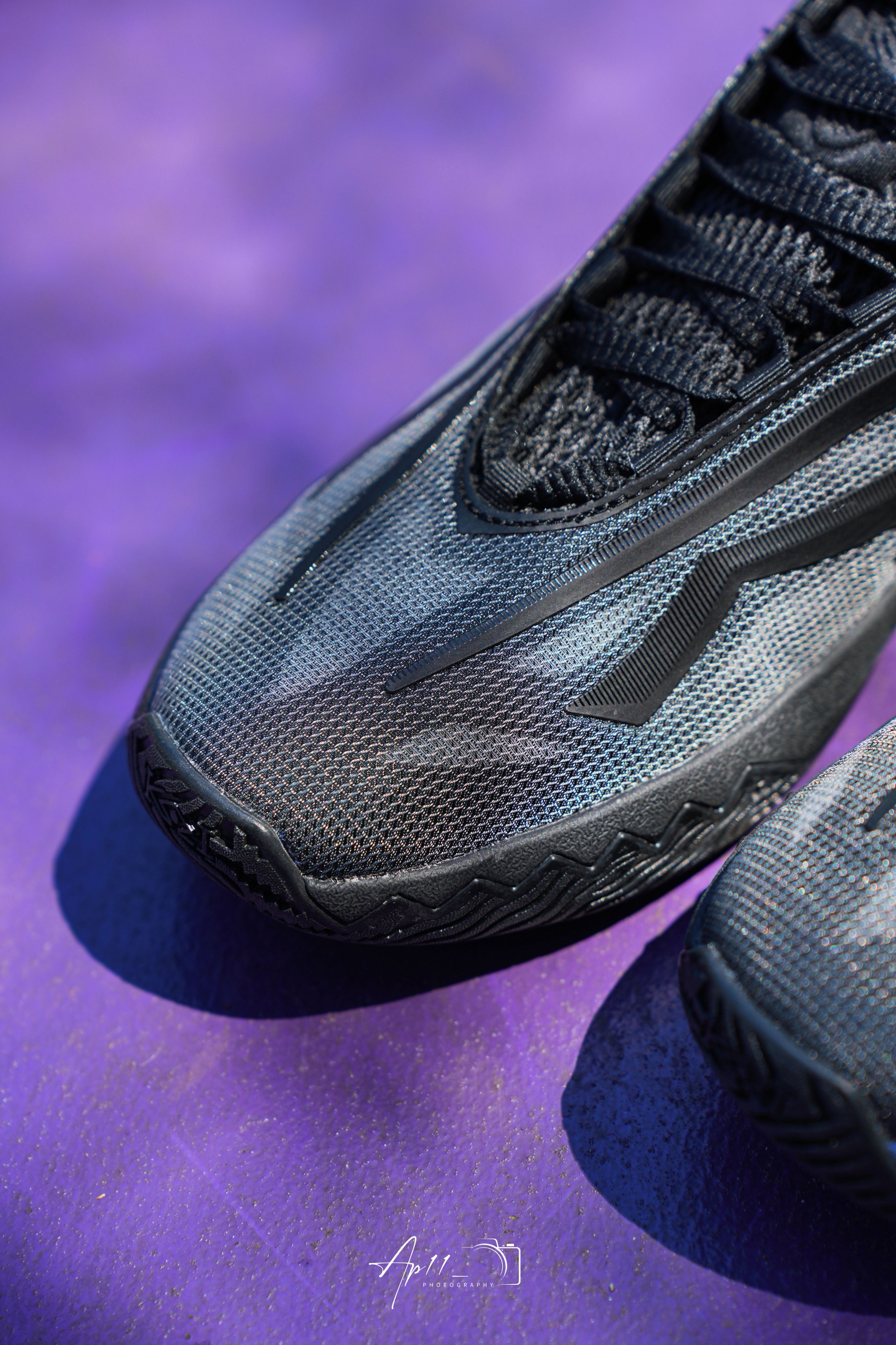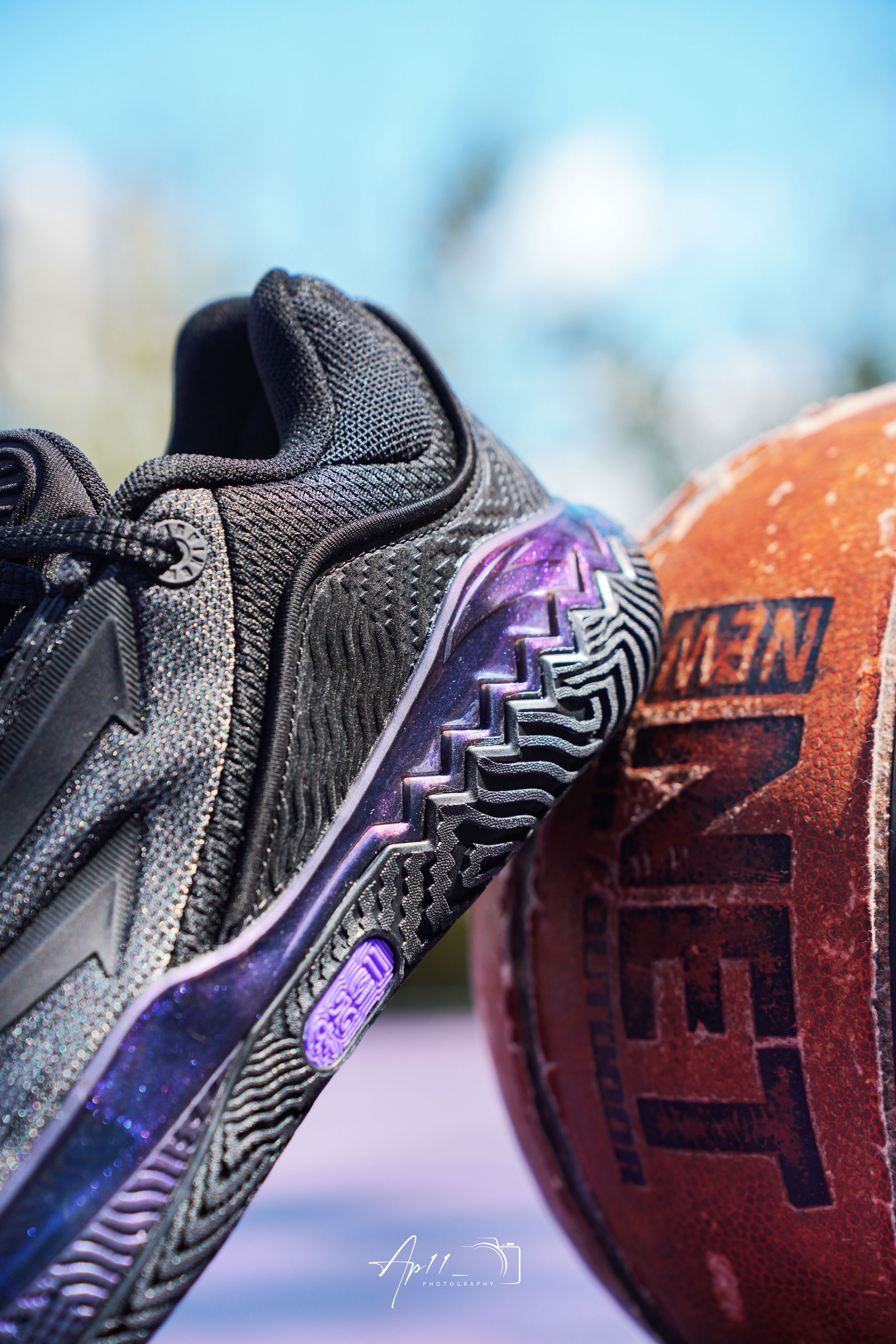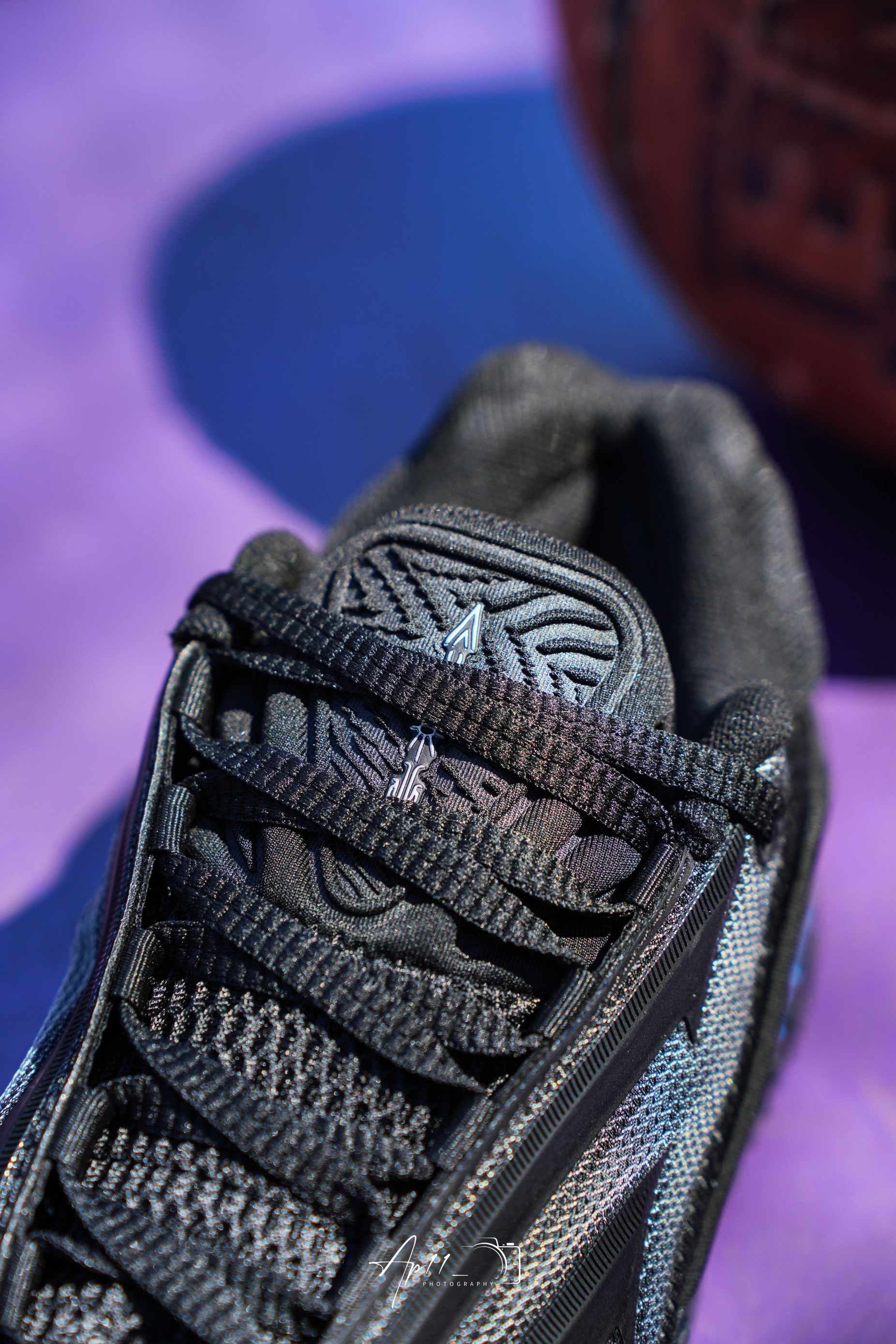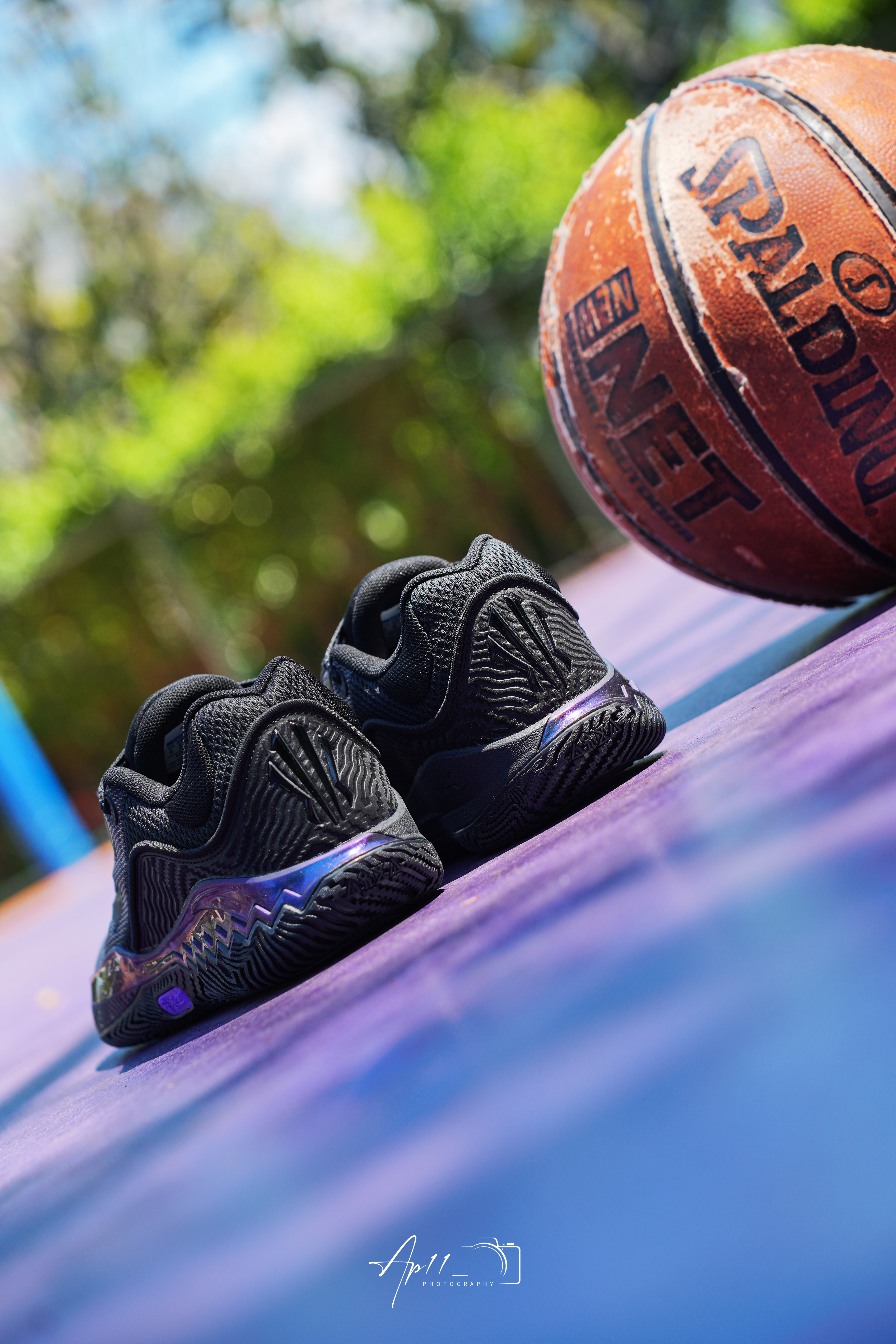 上脚Kai Speed 2黑紫配色的实战鞋,在紫调球场上拍出来的效果超惊艳。全黑鞋身搭着紫蓝渐变的中底,低调里藏着细节感。实战时脚感很稳,抓地也扎实,打完球日常穿也不违和,黑紫配色配运动装或休闲裤都能搭出酷感,是近期打球常穿的一双。