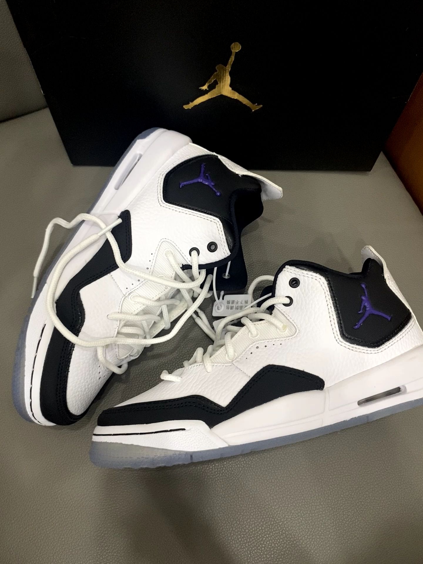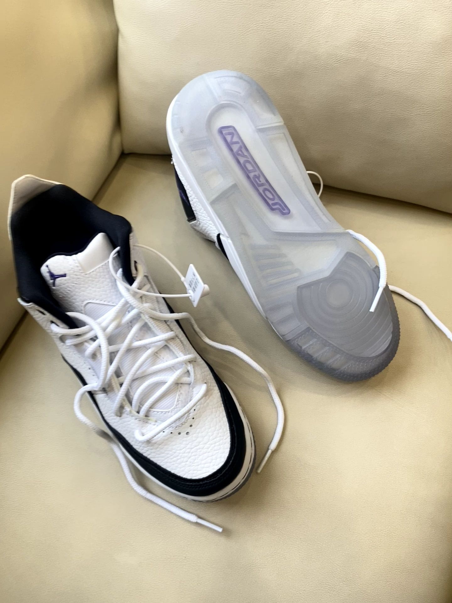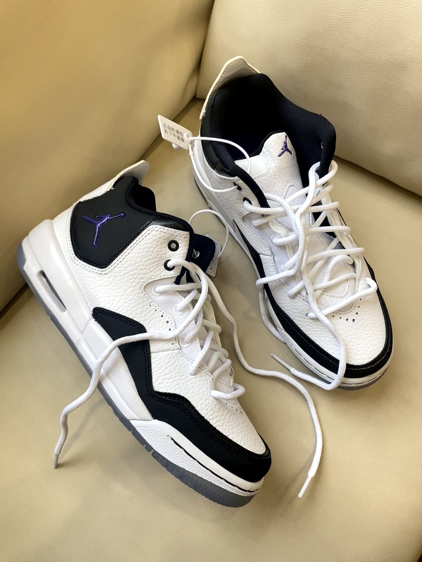 经典黑白配永不出错✅ 亮点是那抹紫色飞人标➕透明水晶底里的"JORDAN"字样 上脚意外轻软 日常压马路完全不板脚 鞋型是真百搭 配牛仔裤是街头感 搭运动裤就是cleanfit 随手拍都自带高级感📸 总结:一双能穿四季的百搭王 不知道穿啥时闭眼踩它!