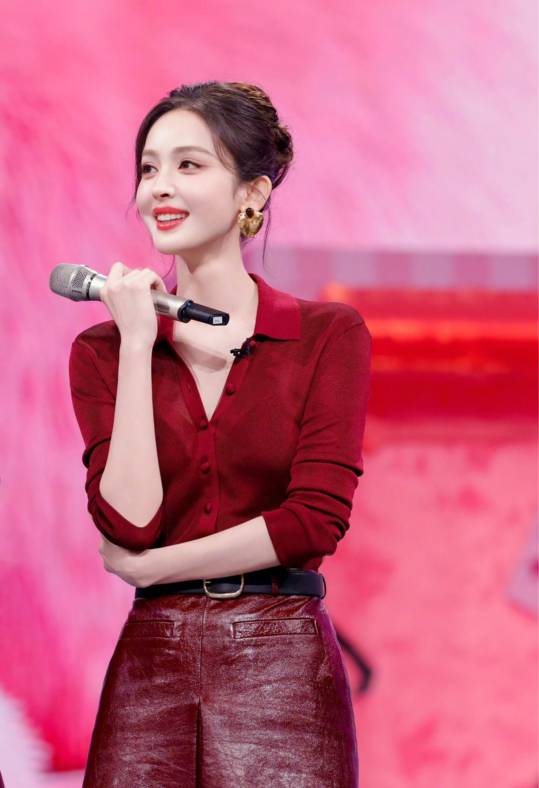 这套酒红色针织连体衣搭配同色系亮面皮裙的穿搭,非常有新年氛围。 它既保留了红色的喜庆热烈,又通过浓郁的酒红调和皮质的高级光泽感,摆脱了俗气,显得优雅又时髦。再配上金色心形耳环,华丽又精致,特别适合在新年聚会或跨年时穿着。