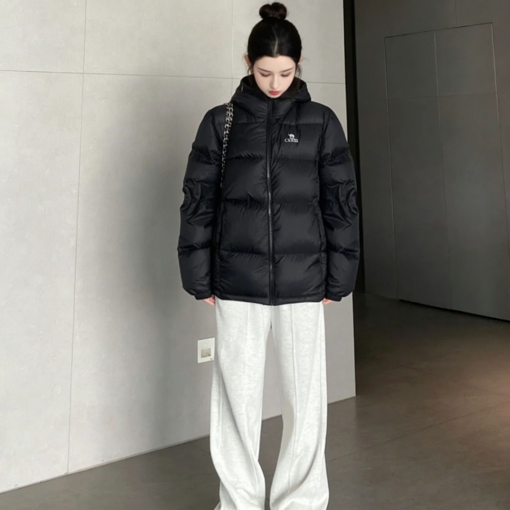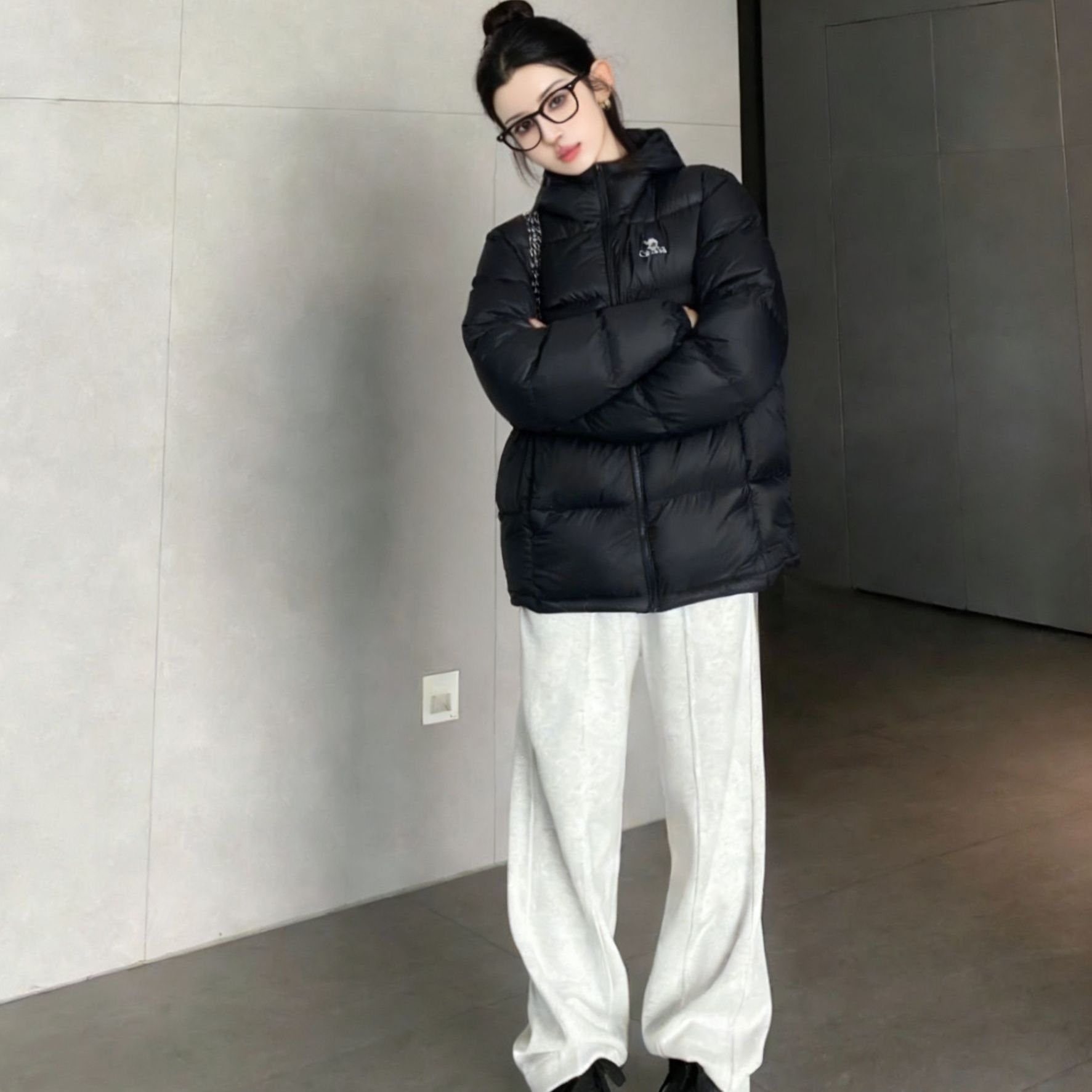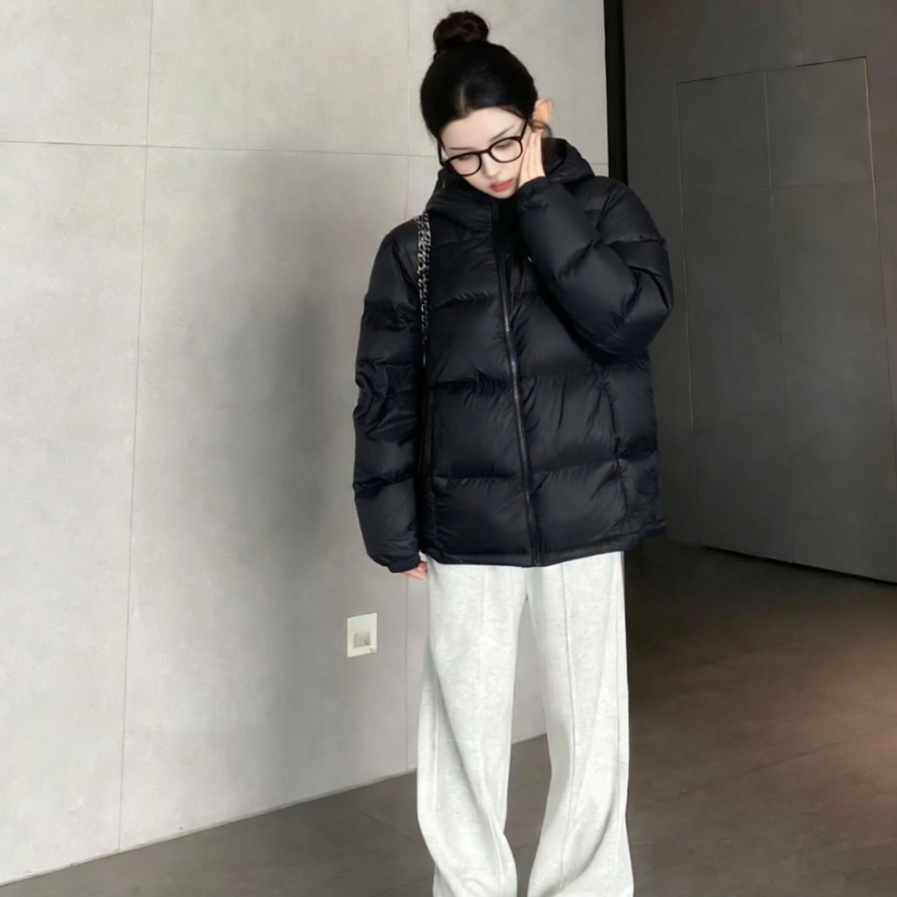 谁懂啊家人们😱这件黑色连帽羽绒服直接把冬日穿搭的慵懒氛围感拉满了! ☁️羽绒服选款精髓 这件黑泡芙羽绒服版型超正💯,宽松但不压个子,连帽设计还能偷偷藏住没打理的头发~小logo刺绣低调又精致,简约的黑色系百搭到能和衣柜里所有下装锁死🔒,填充饱满却不臃肿,保暖度和时髦度双在线! 👖下装搭配小心机 选了浅灰色卫裤来中和黑色的厚重感⚖️,垂坠感满分的阔腿版型直接藏肉又显腿长,黑白灰的经典配色永远...
