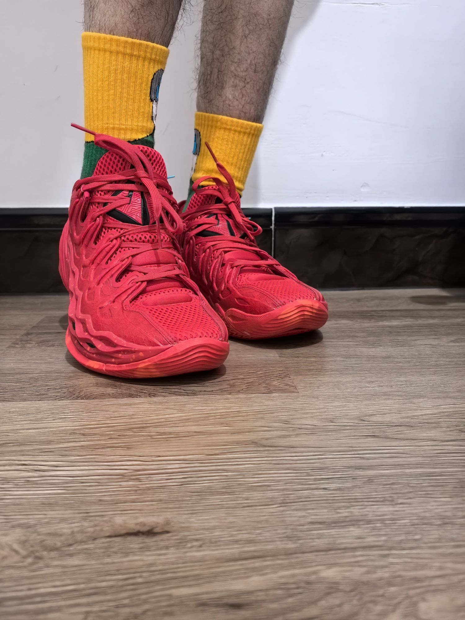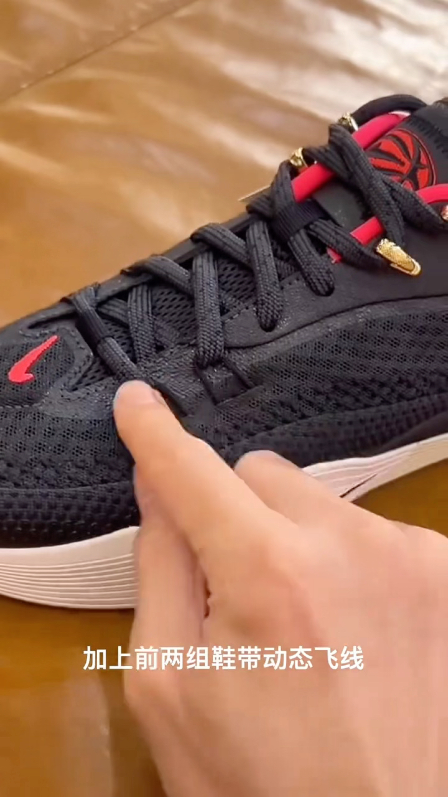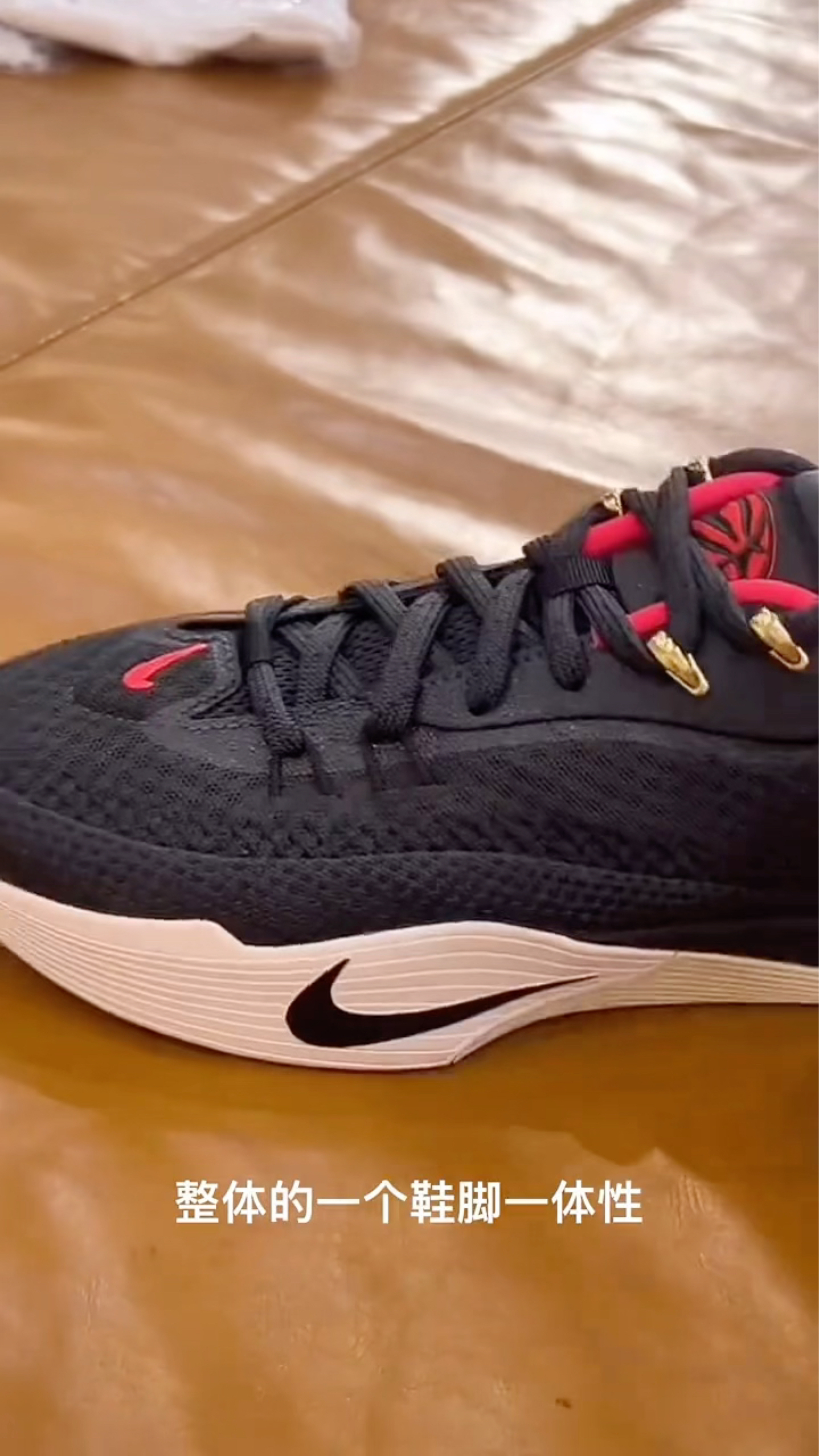 鞋面采用的编织材质贴合度很高,能快速和脚型磨合,包裹感紧致但不压脚,突破、变向时不会有鞋面晃荡的情况,鞋脚一体性确实是这双鞋的亮点。 黑红金的配色搭配简约的Nike Swoosh,质感很足,金色鞋带扣的小细节提升了辨识度,日常穿搭也能和运动风、休闲风搭配。 这双鞋从外观和细节来看,鞋脚一体性表现亮眼,鞋面材质贴合脚型,能带来不错的包裹感;黑金红的配色搭配精致的金属鞋带扣,颜值和质感在线;中底的...