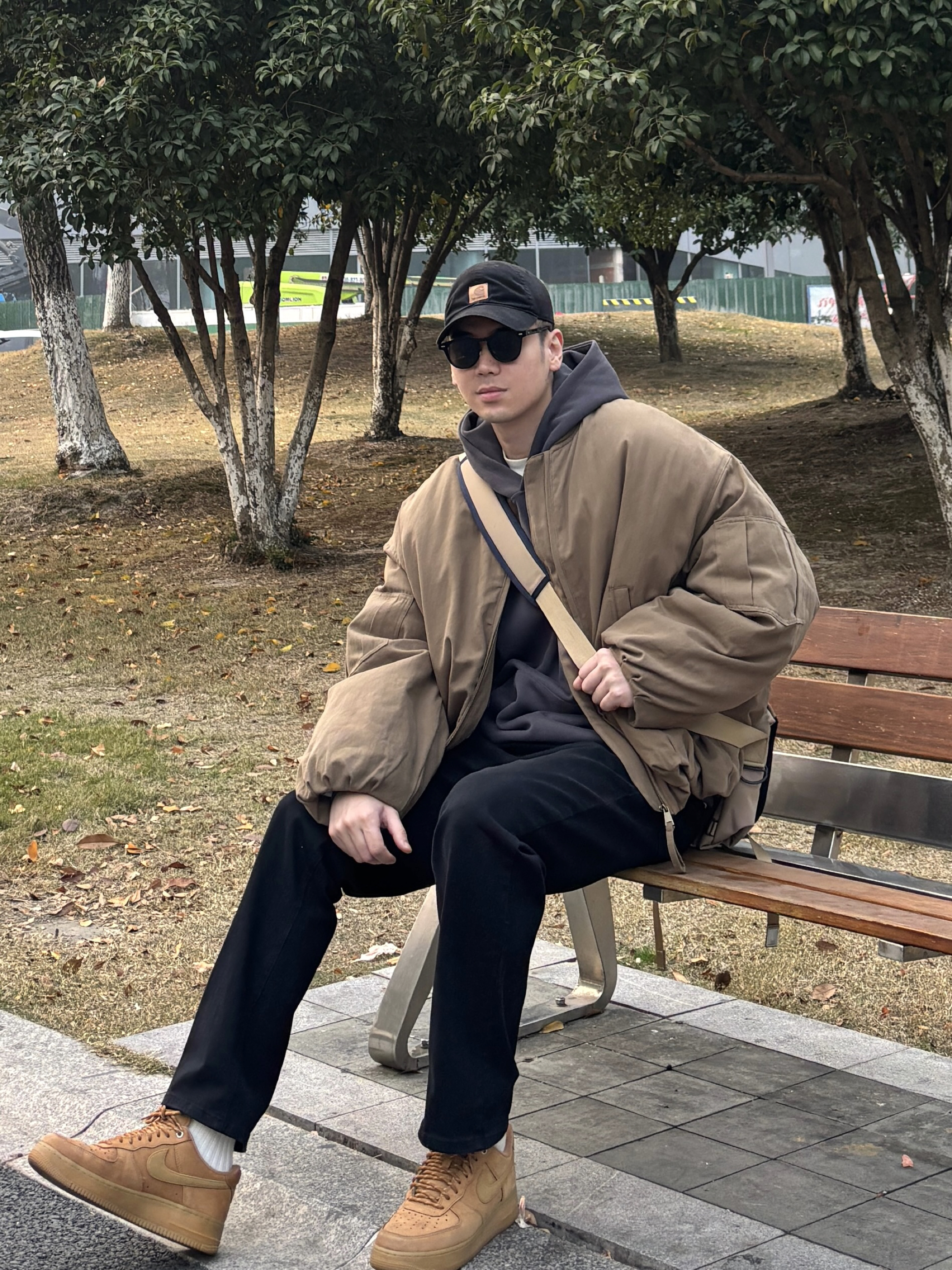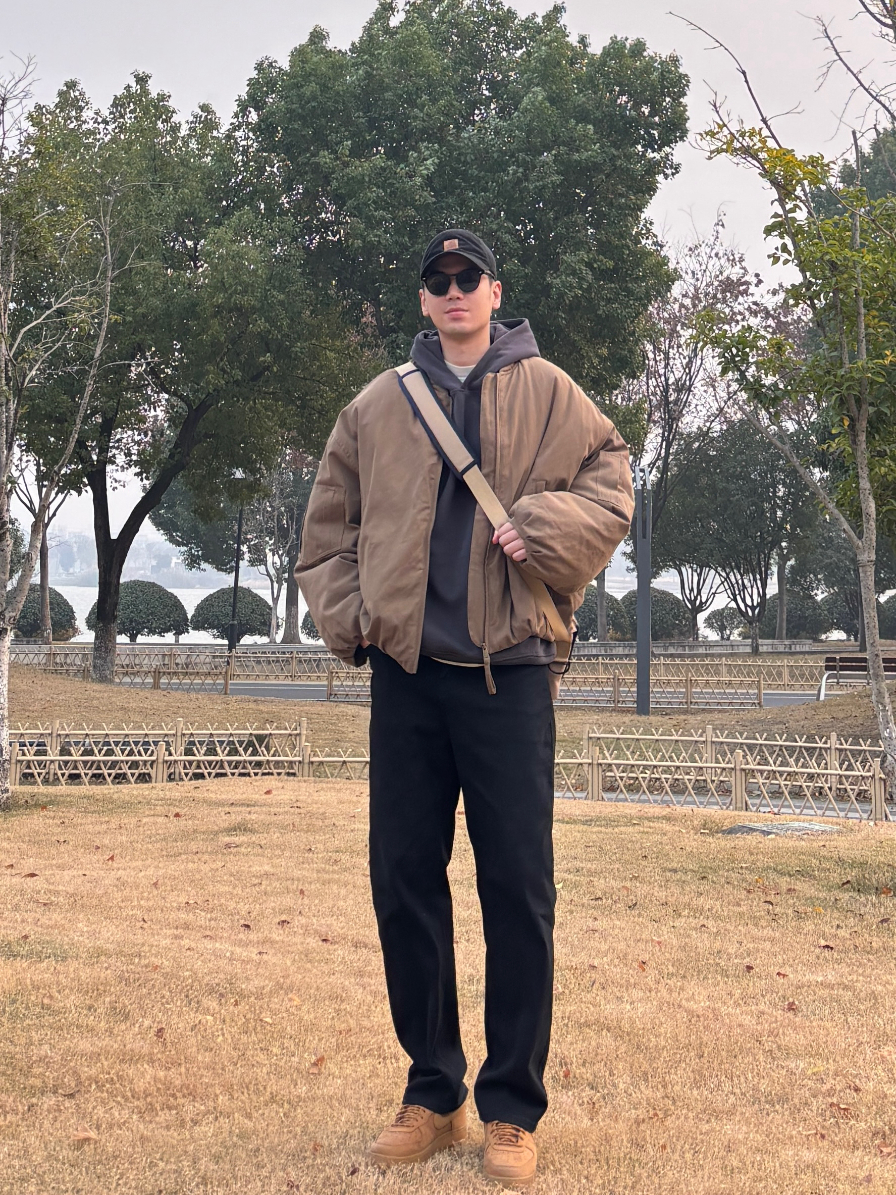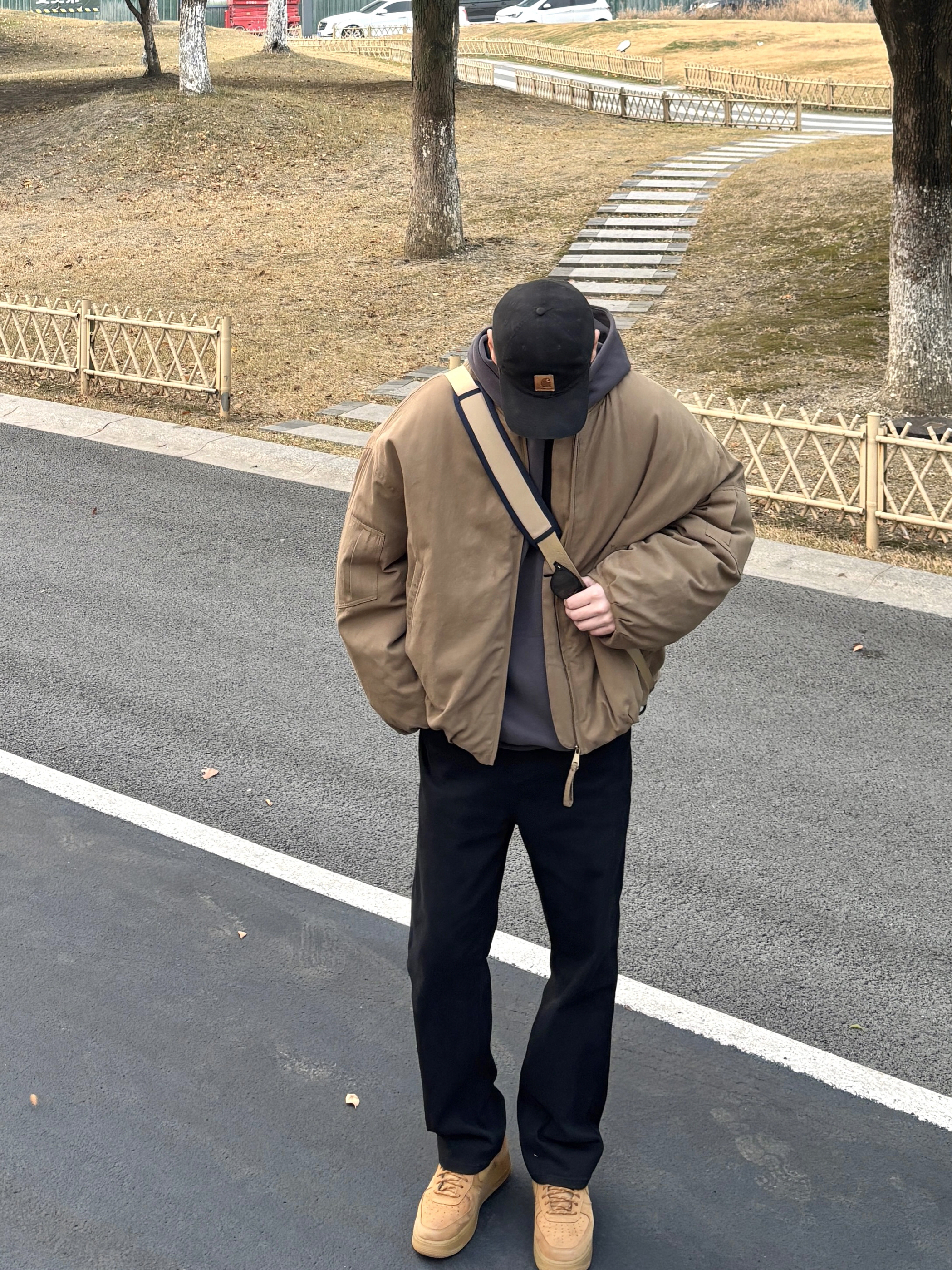 男生穿搭不用复杂,简单配色就很有味道。 卡其棒球领工装空军棉服上身,美式复古那味儿立马出来,内搭深灰连帽卫衣,叠穿不臃肿还显少年感。黑色水洗直筒牛仔裤版型超正,不挑腿型,小麦色低帮板鞋踩出随性范儿。最后卡其色邮差斜挎包一背,不仅能装东西还能凹造型😎 整套look简约不简单,不管是约会还是日常通勤,都能让人眼前一亮✌️ - 今日搭配 衣服裤子:NICE LILI 鞋子:AF1小麦