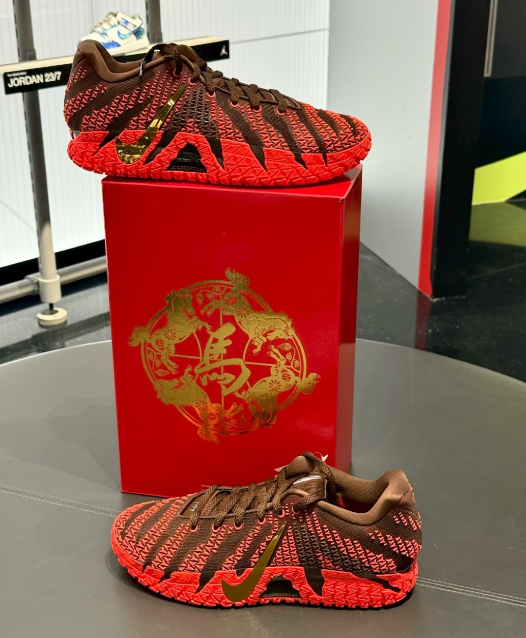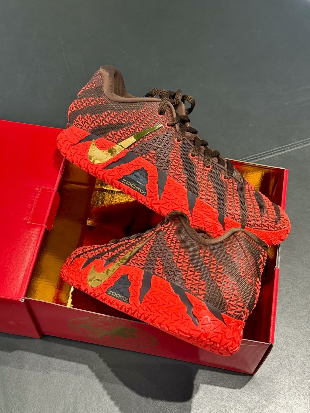 hello 宝子们!万众瞩目的🔥马年限定款新年赤兔配色🔥JA3终于终于来噜❗️❗️❗️今日开箱这双Nike新年款球鞋时,直接被鞋盒和鞋的细节惊艳到啦!这次的新年款还是仪式感满满的🫡 红盒上烫金骏马剪纸+“馬”字,年味直接拉满;鞋身棕红撞色像把新春烟火穿在脚上,编织纹理里藏着骏马纹路,金色钩钩在光下bulingbuling,连衬纸都是红剪纸小马,仪式感直接焊死!🤌上脚试了下,包裹感巨好,鞋底回弹像...