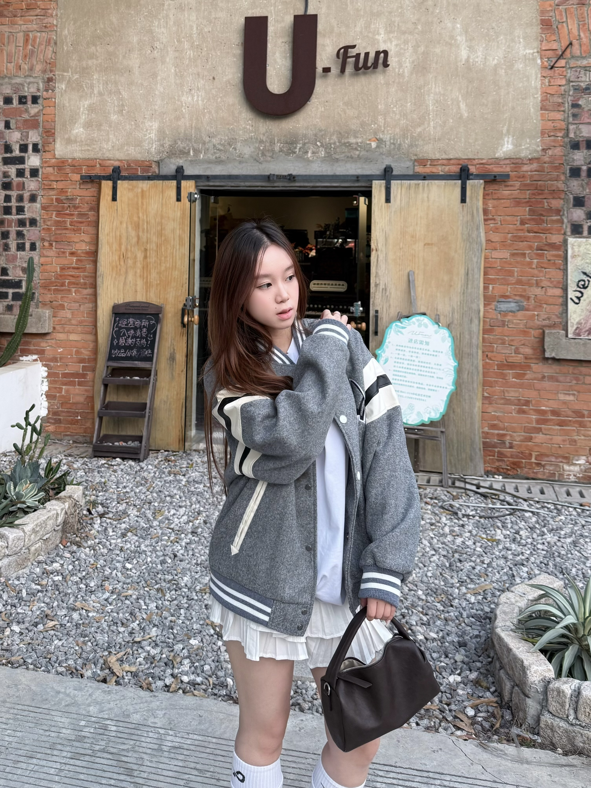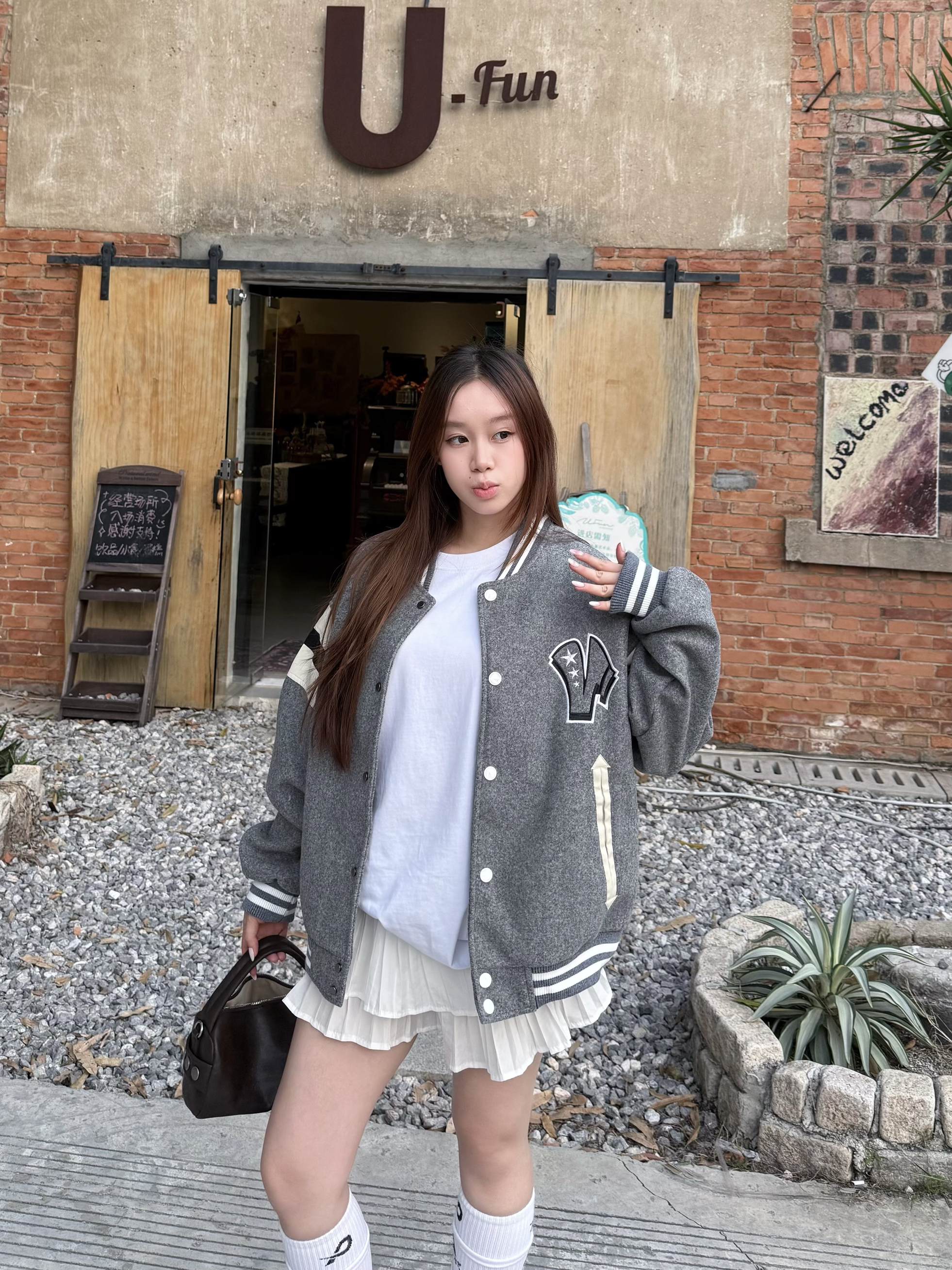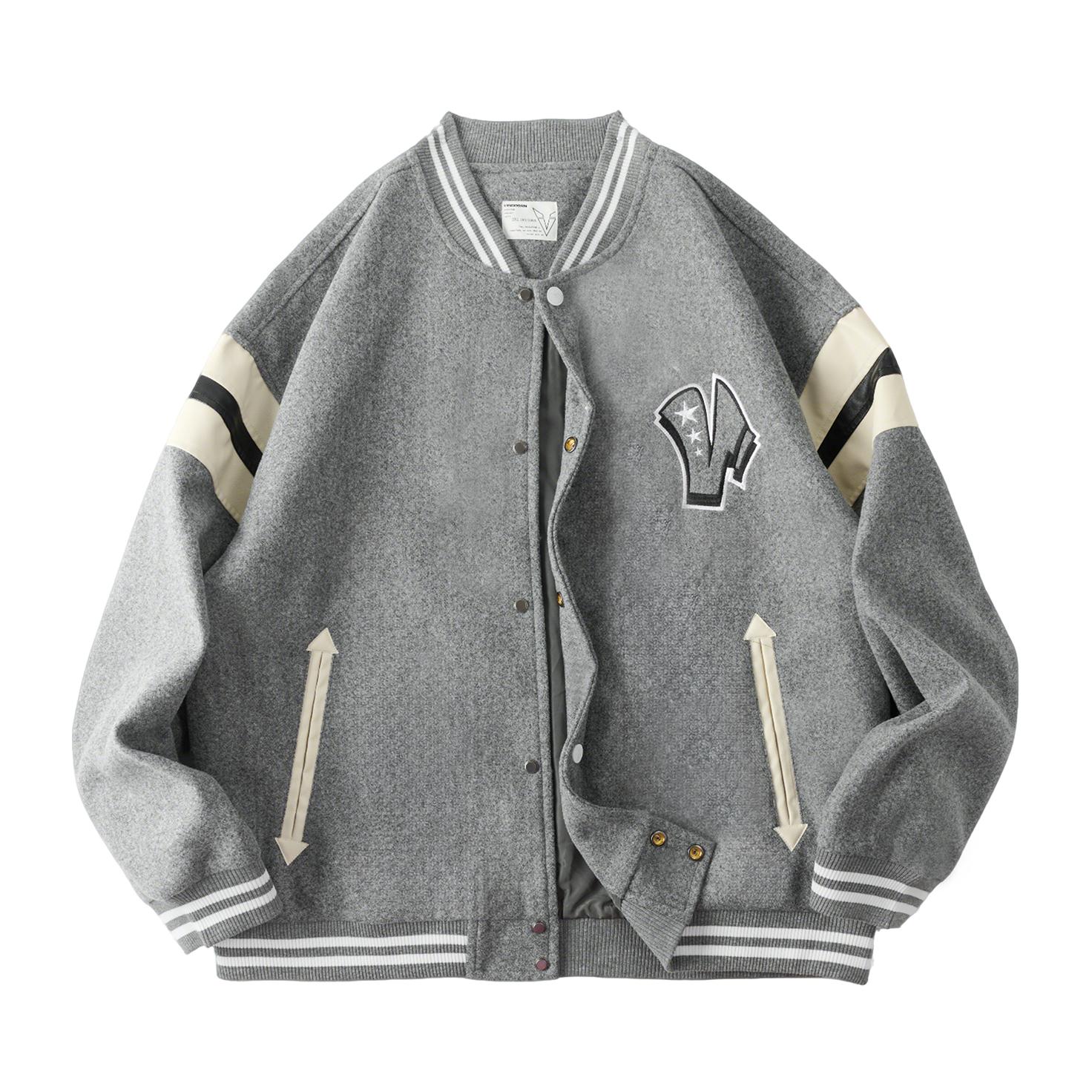 这件灰色棒球服 我最近穿得挺多 条纹和字母刺绣有点学院味 但整体不显乖 宽松版型对身材要求不高 里面搭白T或薄卫衣都行 下装配牛仔裤 工装裤都稳 10℃—18℃左右穿刚好 属于不需要多想 随手套上就能出门的一件