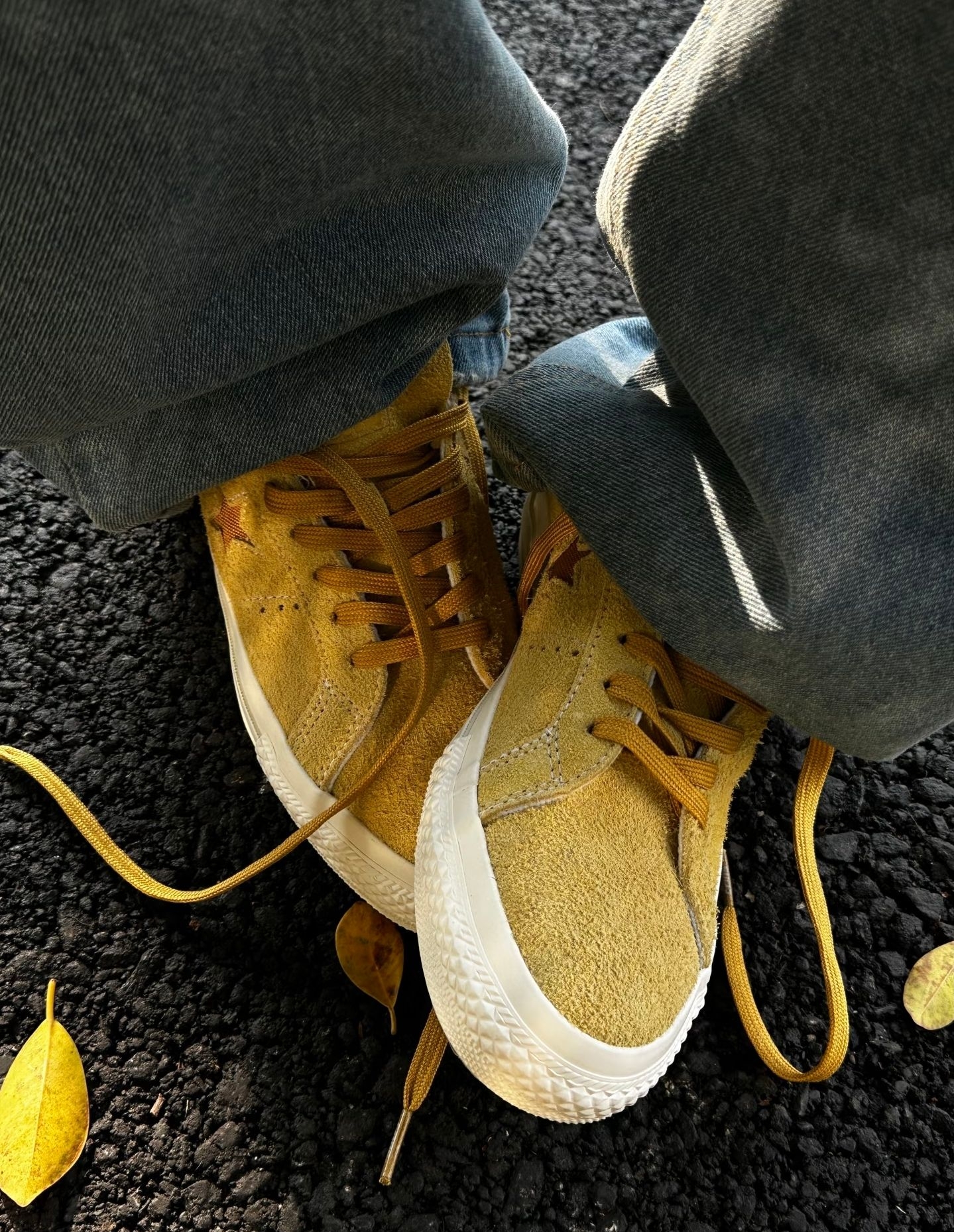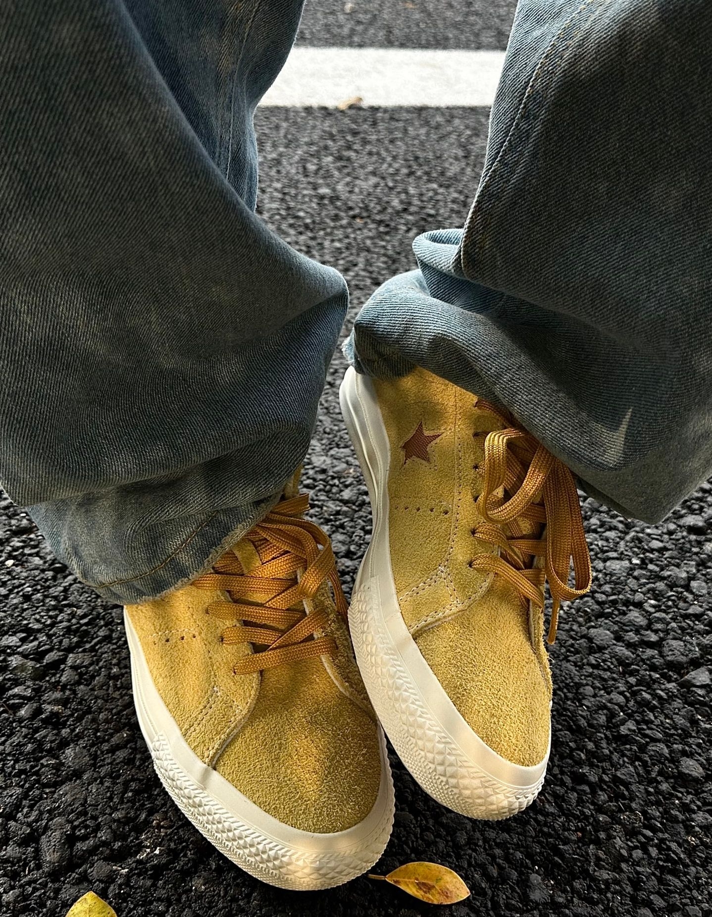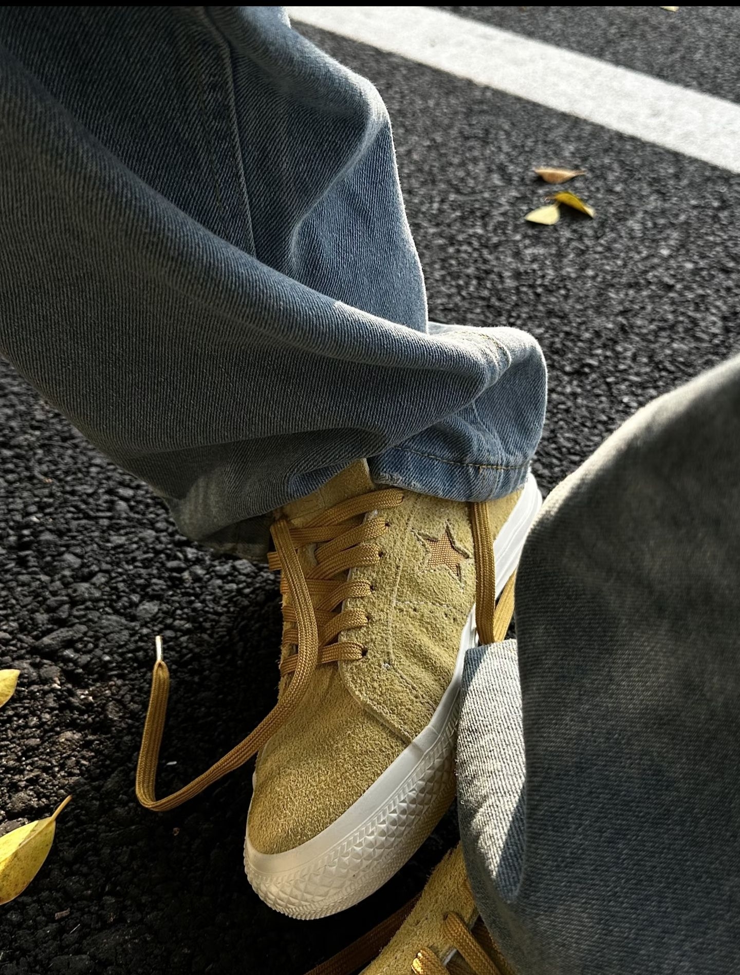 谁懂啊!这双匡威One Star Pro芥末黄翻毛款真的长在我的审美点上了💛 翻毛皮的质感摸起来软乎乎的,芥末黄调调复古又不挑穿搭,配牛仔裤直接拉满美式街头感。作为滑板鞋款,脚感比普通匡威更软弹,鞋垫的缓震性对日常党也超友好,暴走一天都不磨脚。 星星标低调又有辨识度,细节处的做旧感还自带复古滤镜,不管是搭工装裤还是阔腿裤都贼出片,妥妥的穿搭氛围感神器~