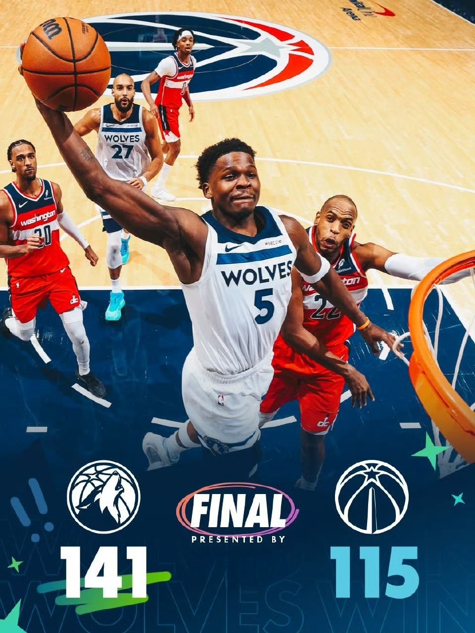 安东尼·爱德华兹今日 (2026-01-05)NBA常规赛数据:35分6篮板3助攻4抢断,投篮21中14(66.7%),三分10中6 (60%),罚球4中1,出场30分钟(三节打卡),正负值+29. 上脚:Anthony Edwards x adidas AE2马年