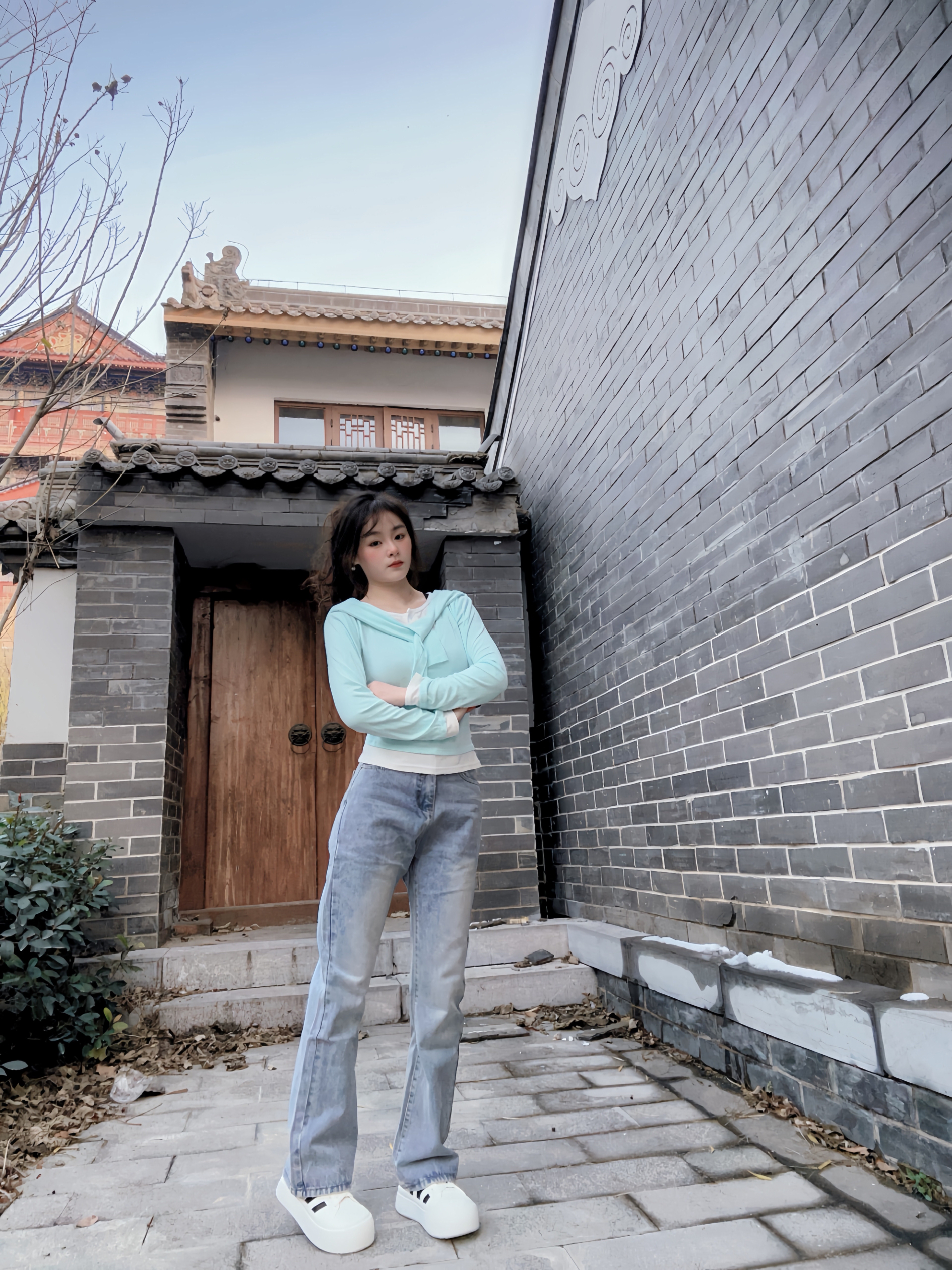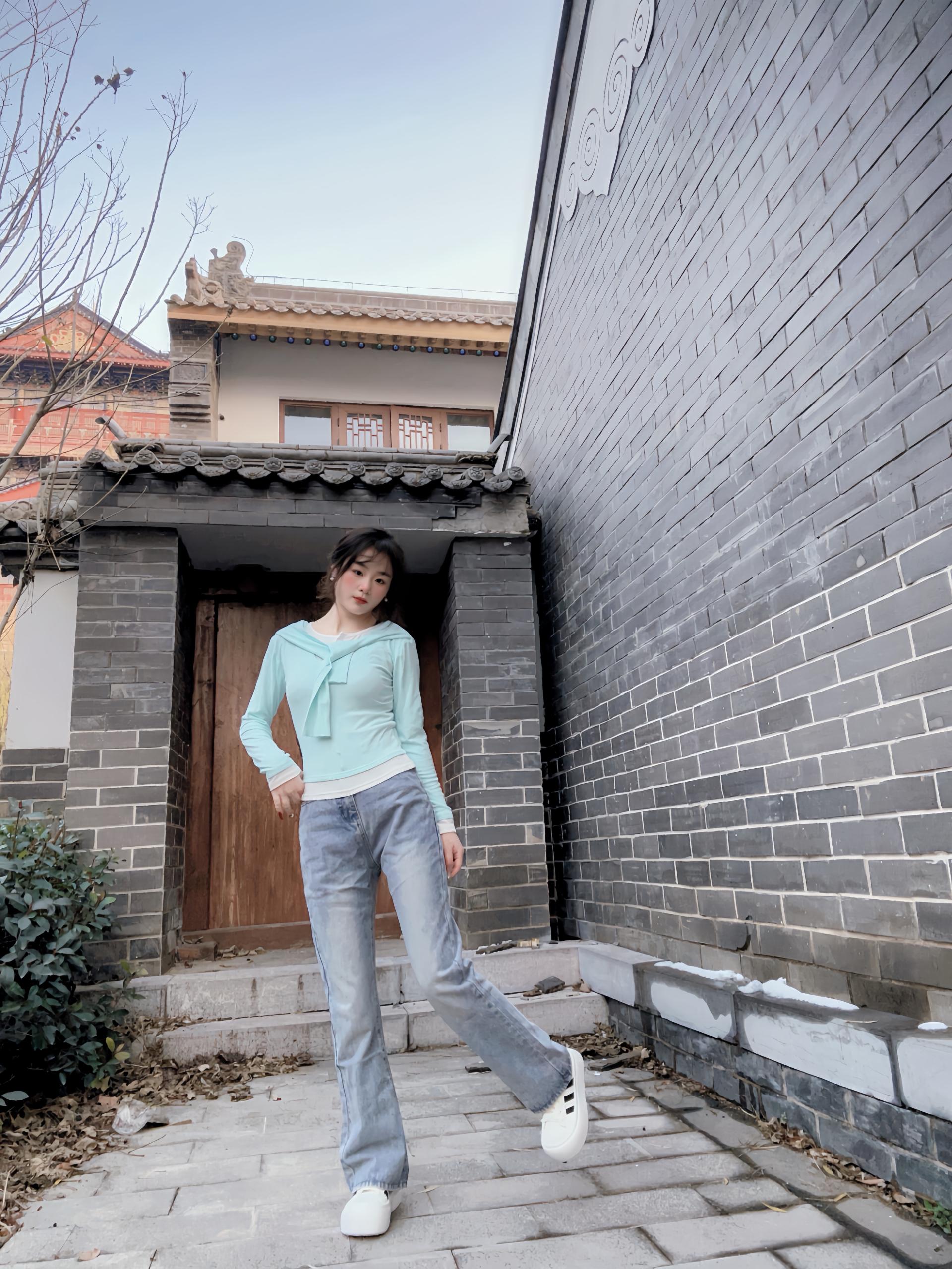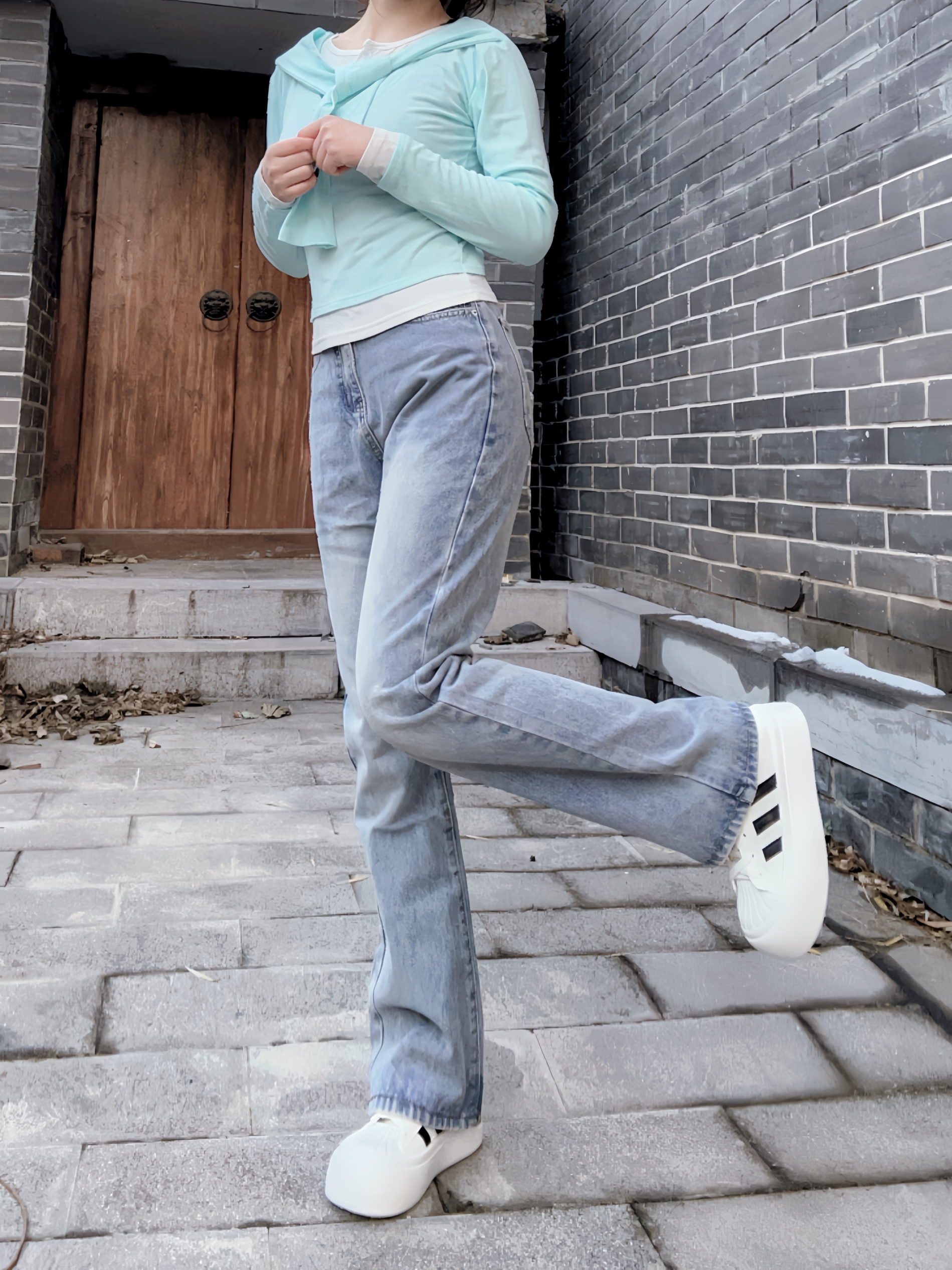 简简单单的牛仔裤穿搭分享~ 浅蓝色微喇叭📣牛仔裤👖 搭配青色系上衣 很和谐的一身 版型上身是我喜欢的宽松感 软硬适中的料子 很有版型耶✌️ 是有一定厚度滴 冬季穿也不会冷 而且浅色也蛮百搭的呢😻 是不管怎么搭配都不会出错的一条