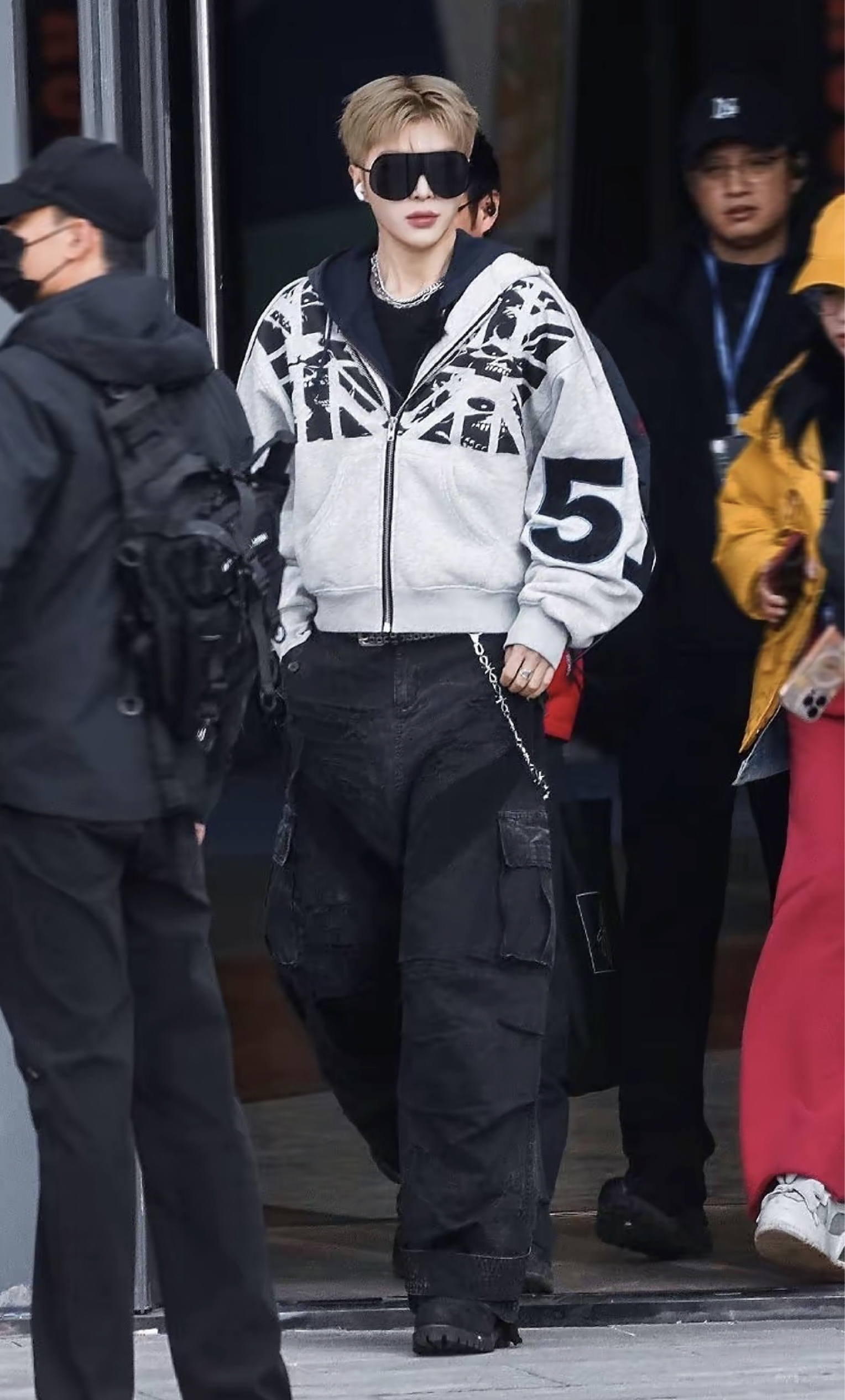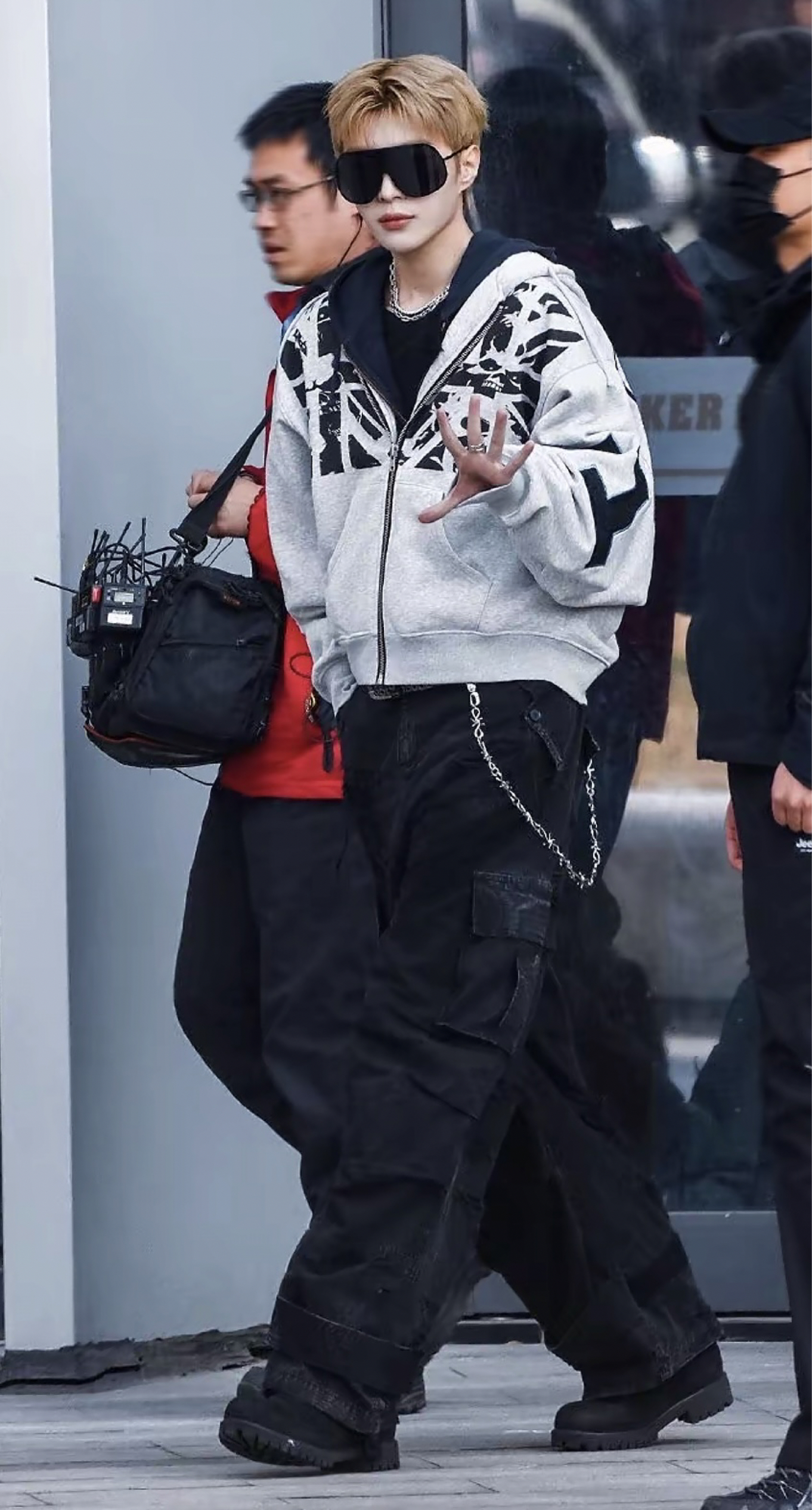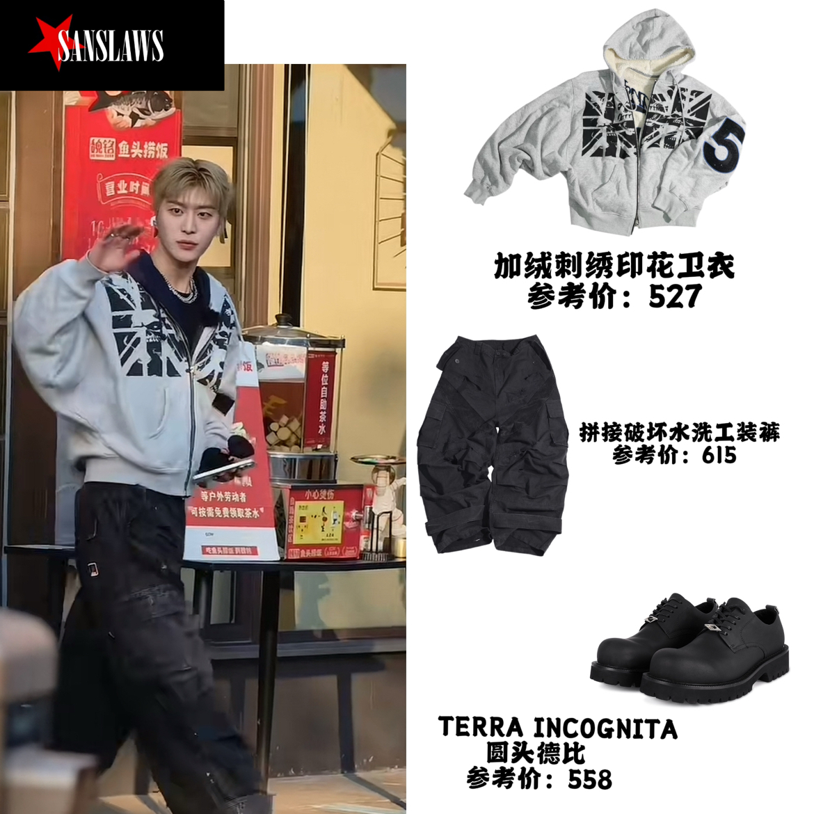 谁懂啊!刷到范丞丞这身穿搭直接被戳中,酷帅街头风拉满,从配饰到鞋服的选品都太有品味了,赶紧扒了同款来给大家! 上衣选的是SANSLAWS加绒刺绣印花卫衣,浅灰底色搭配个性印花,视觉上超有层次,加绒款冬天穿保暖又舒服,宽松的版型对身材包容度超高,随便穿都有慵懒随性的范儿,妥妥的日常出街神器。 下装搭配的SANSLAWS拼接破坏水洗工装裤更是亮点,黑色工装裤的破坏和拼接设计把街头感拉满,面料挺括还不闷...