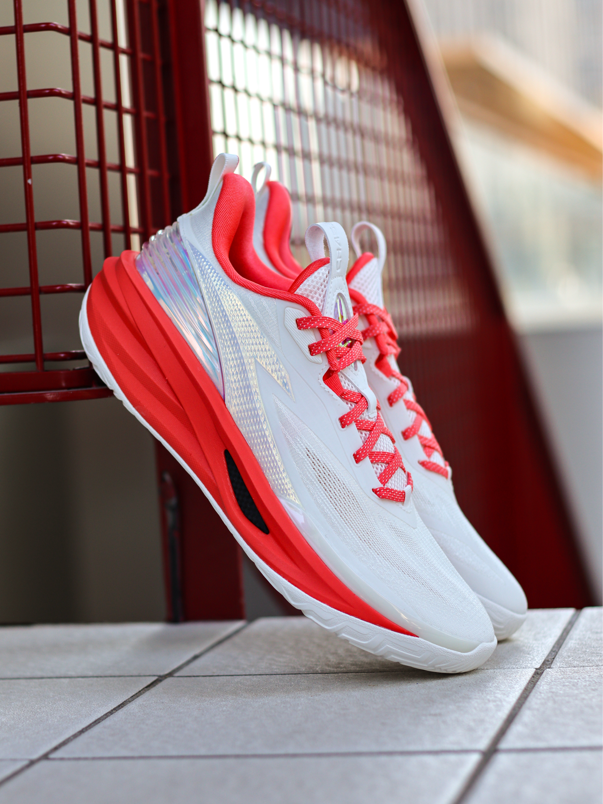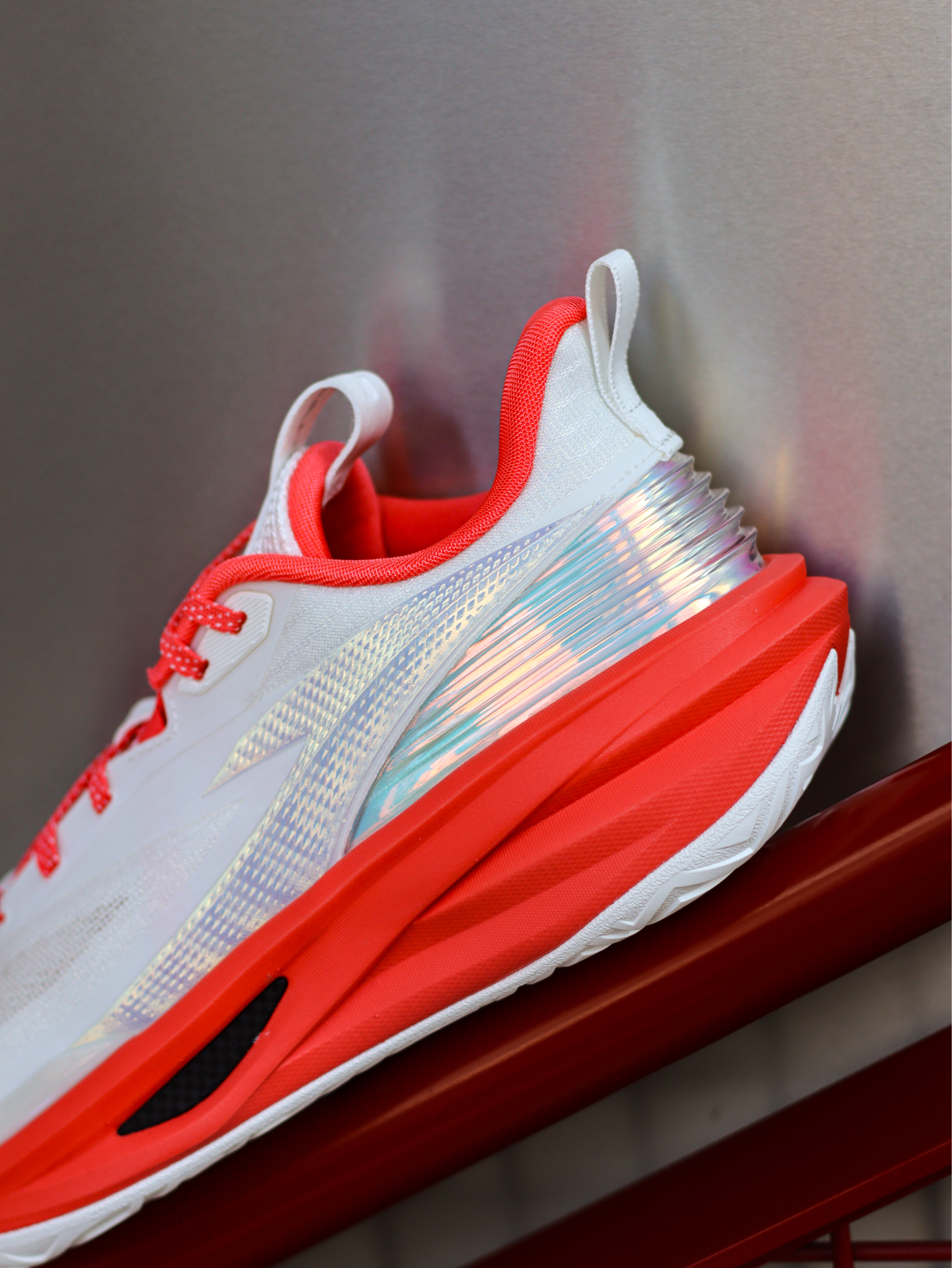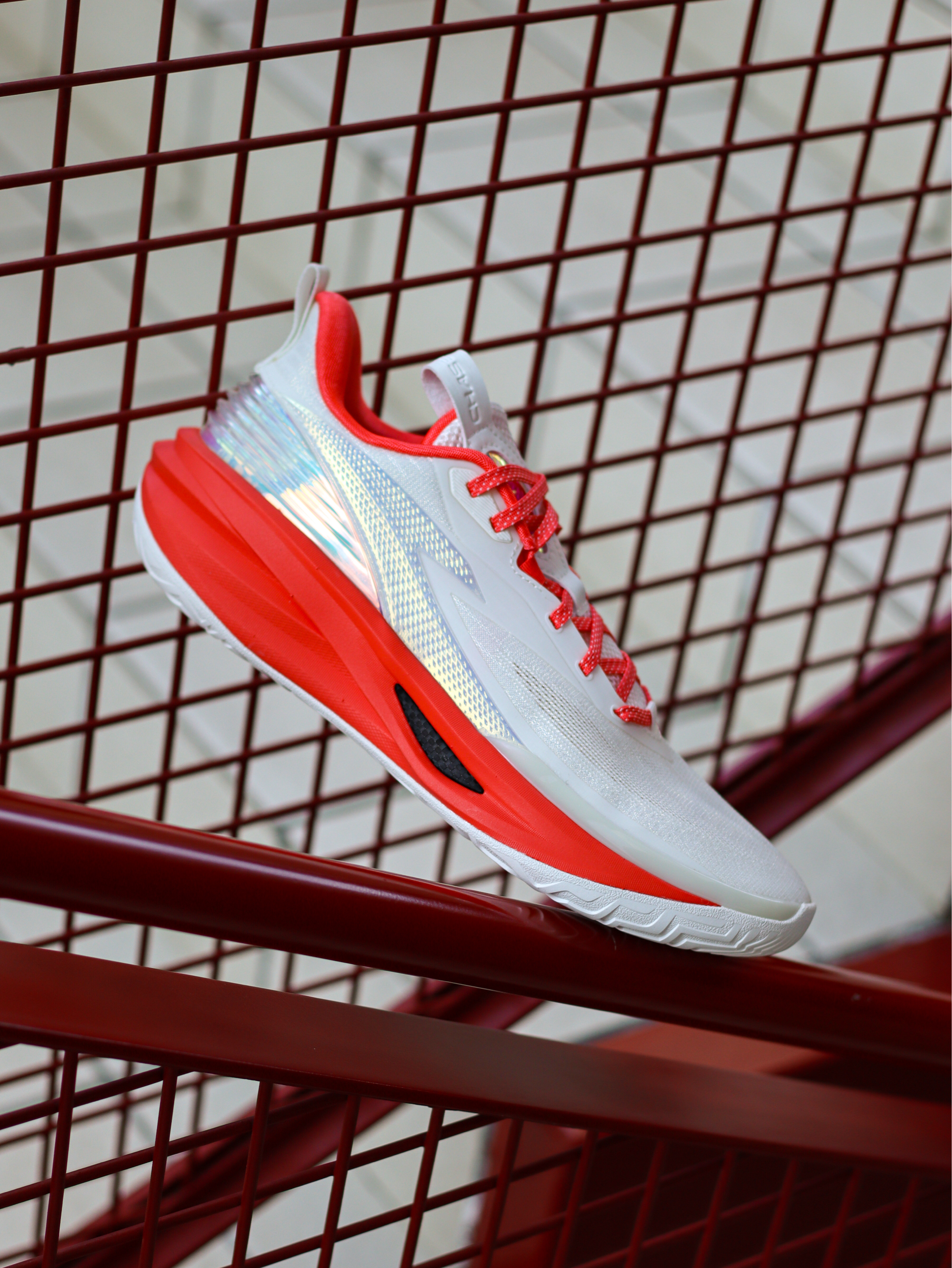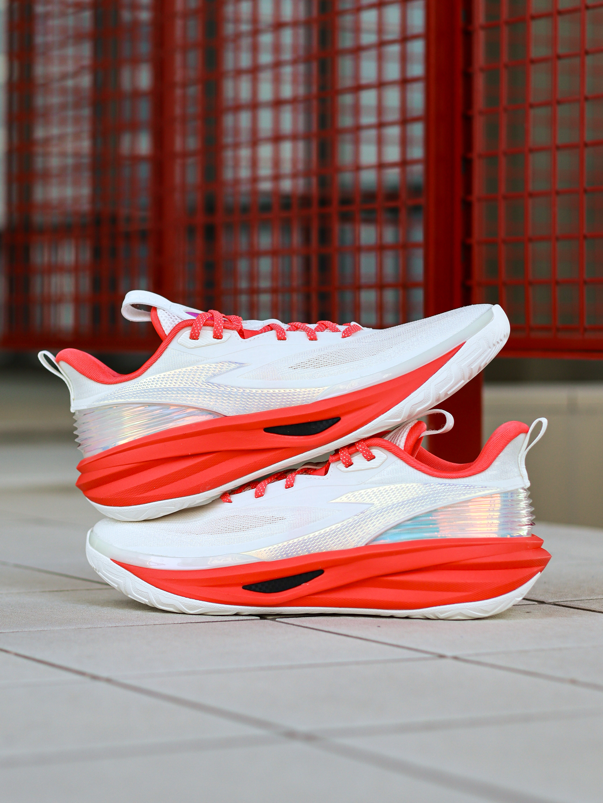 新年战靴当然首选白红配色了!安踏新出的这个追光1代「红外线」配色来的太及时了~ 白红搭配简约又很有新年氛围感~鞋侧logo和后跟都有点珠光炫彩的感觉,上脚很吸睛! 整个鞋型很有速度感,原来这次采用了ASHOCK-PRO框架+全掌氮80,篮球鞋融入了跑鞋黑科技,既能抗撕裂,又有高回弹!确实是为突破爆发而生~ 中足还有一块X型的柔性碳片,增强抗扭性的同时又比较容易驾驭~磨合起来还挺顺畅!橡胶大底搭...