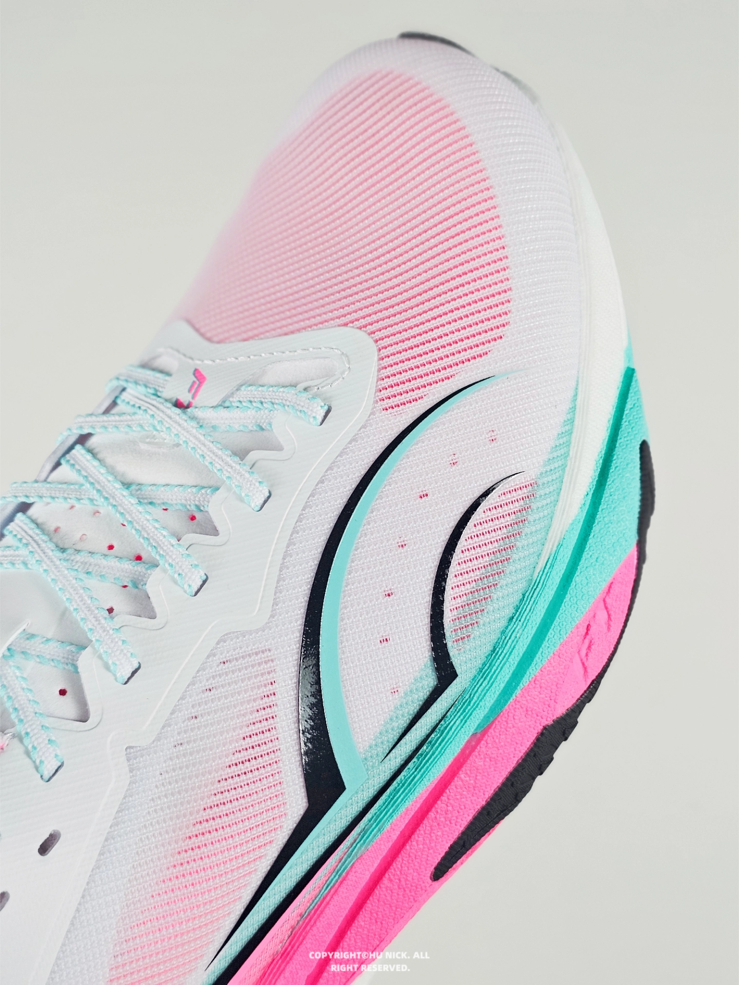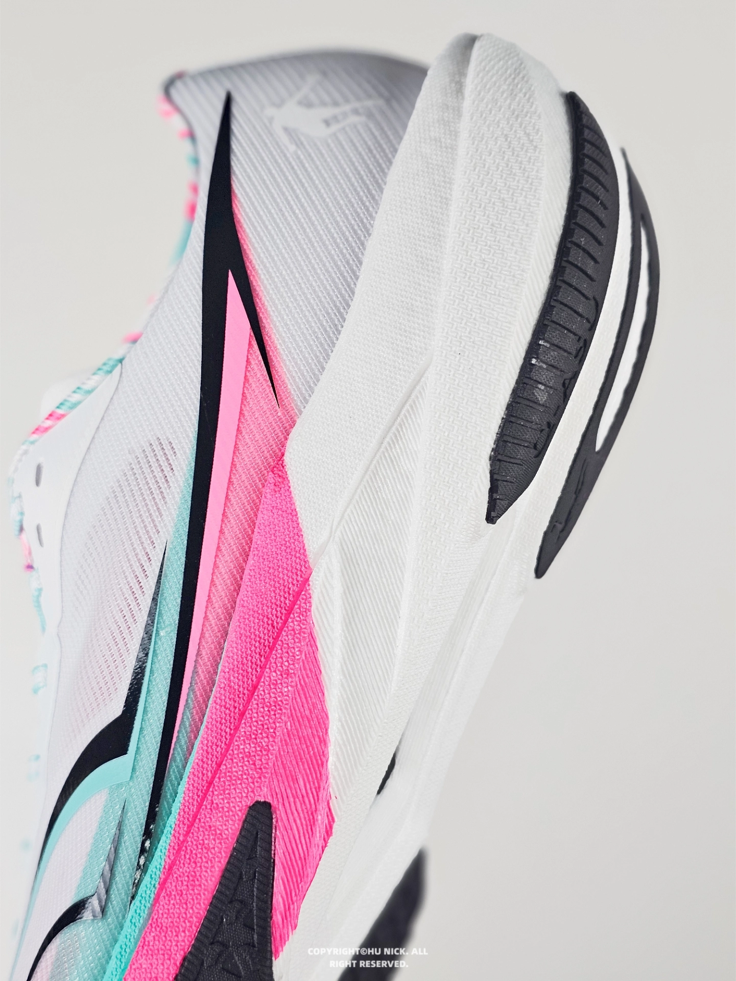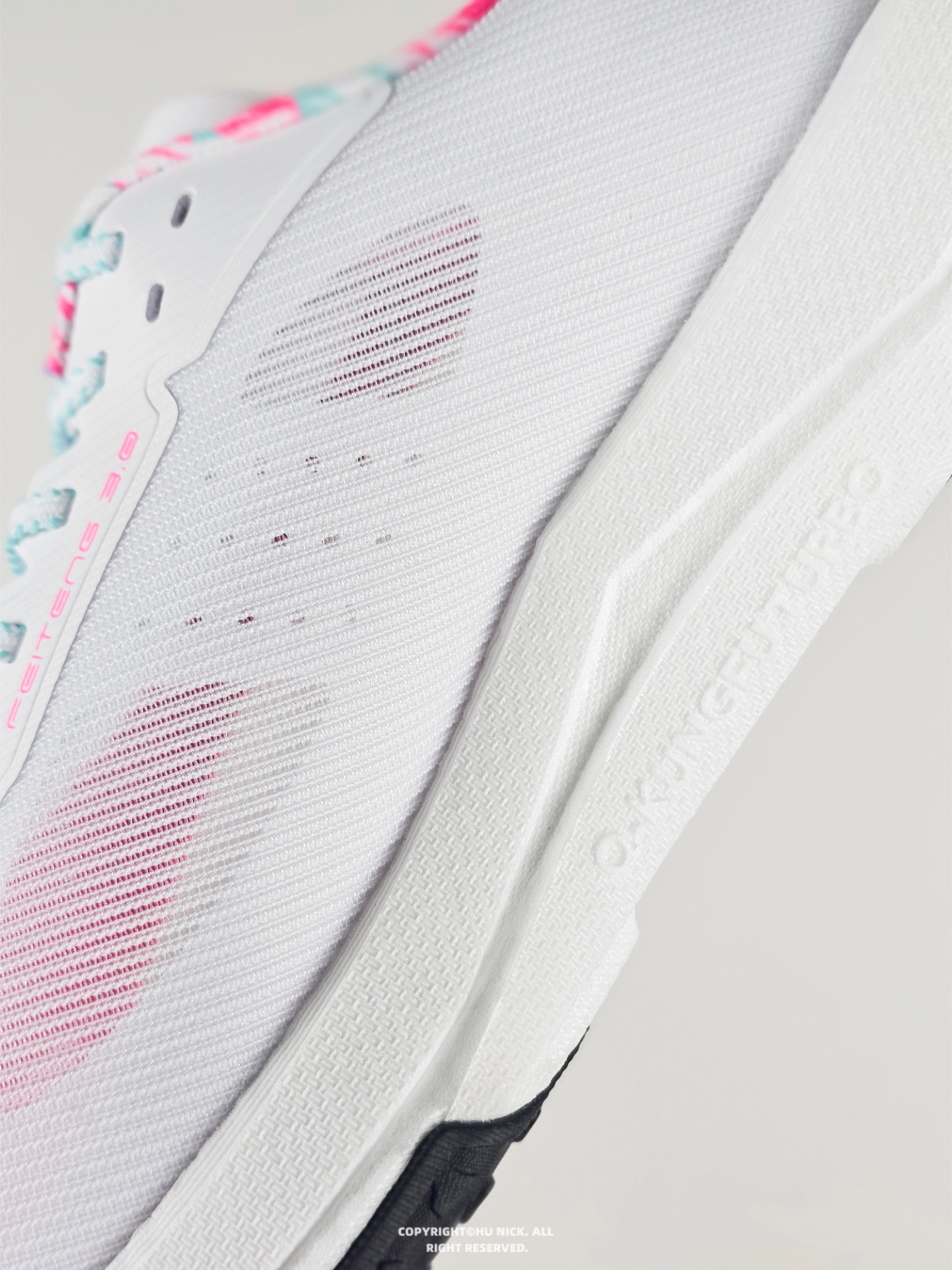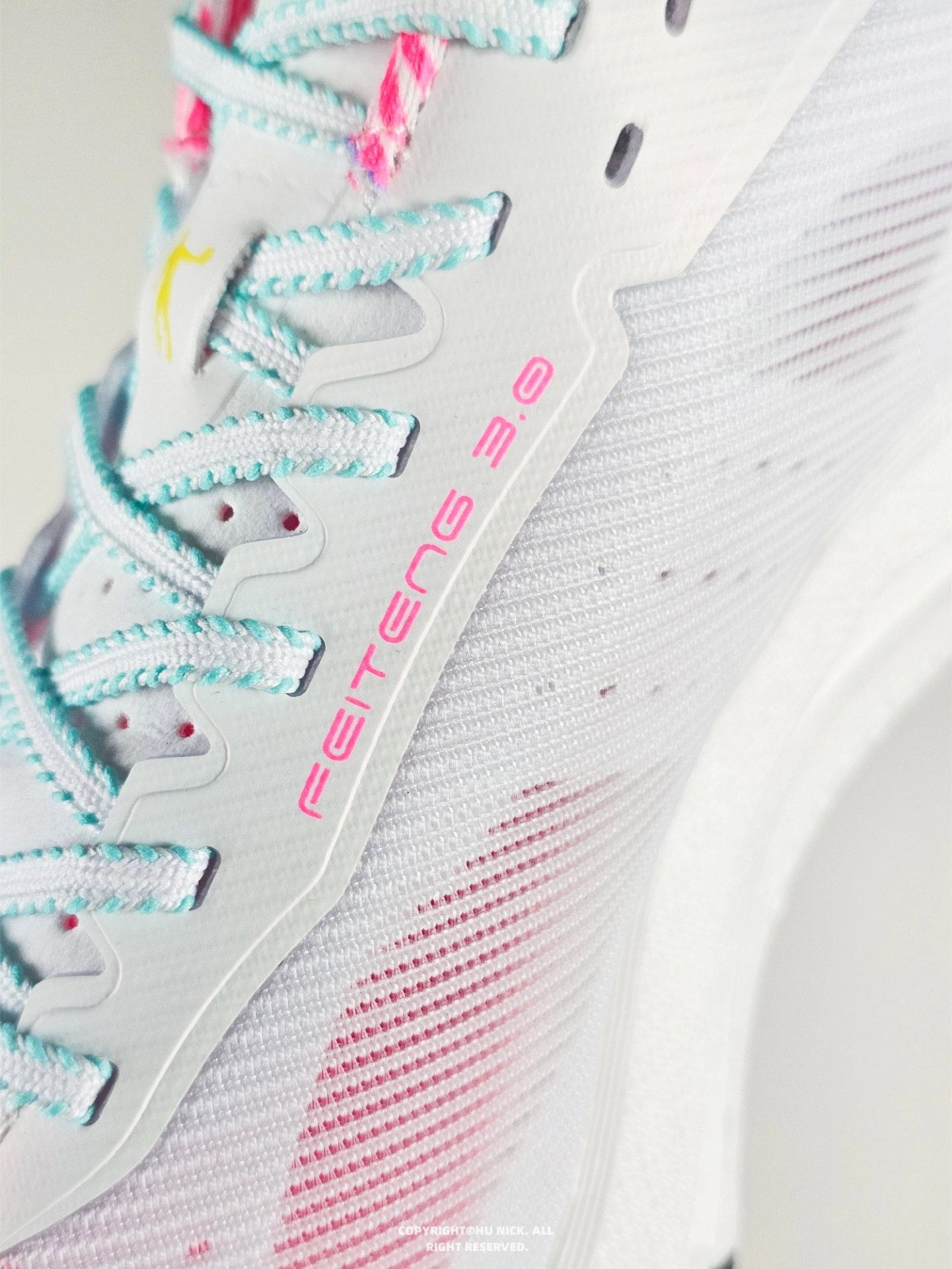 今天给大家分享的是中乔即将发售的飞腾 3.0。 这双「彩虹斑马」还是有够帅的,白色鞋身搭配粉蓝相间的中底一直延伸到鞋面的LOGO处看起来很有速度感,内衬也做成了彩虹色的斑马纹,颜值还是很棒的! 作为一双偏薄底的竞训跑鞋整体的脚感偏韧弹,前掌的反馈也很迅速,全掌尼龙板和内外上翻的外底设计也让这双鞋有着很不错的稳定性,在过弯的时过度会更流畅。 #飞腾3稳过弯超在前 #飞腾3.0弯道超车 #飞腾3 #...