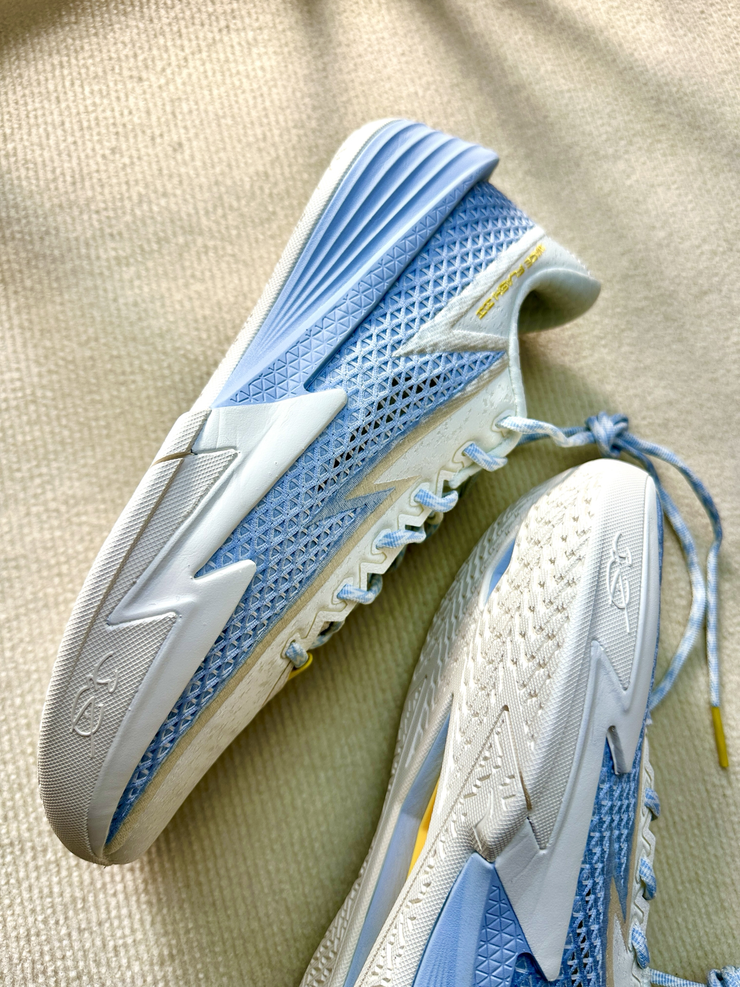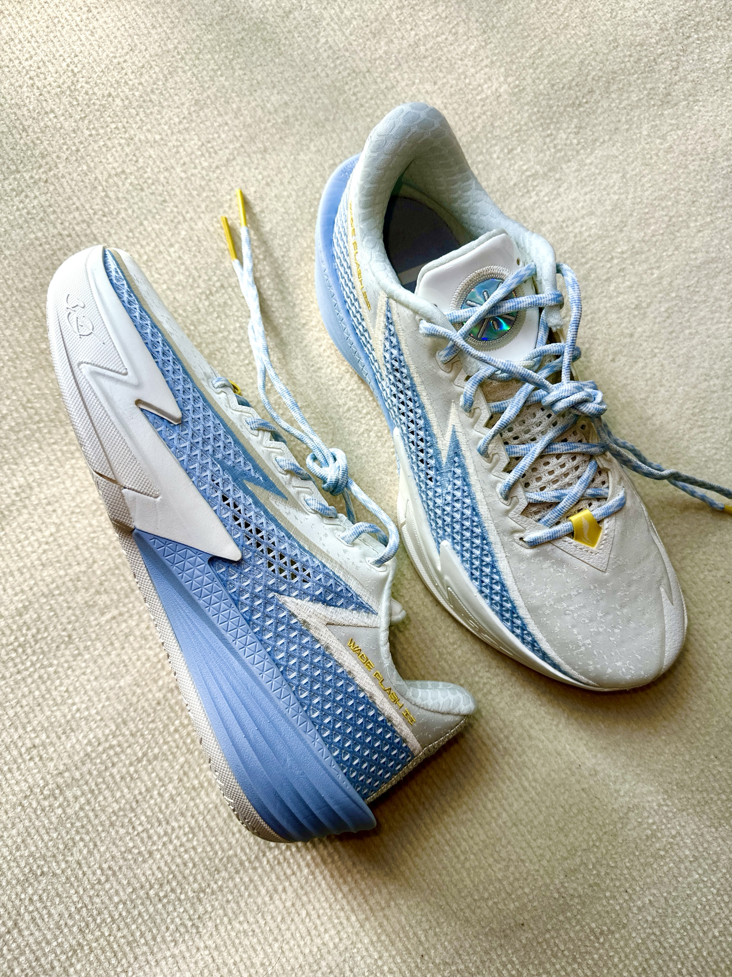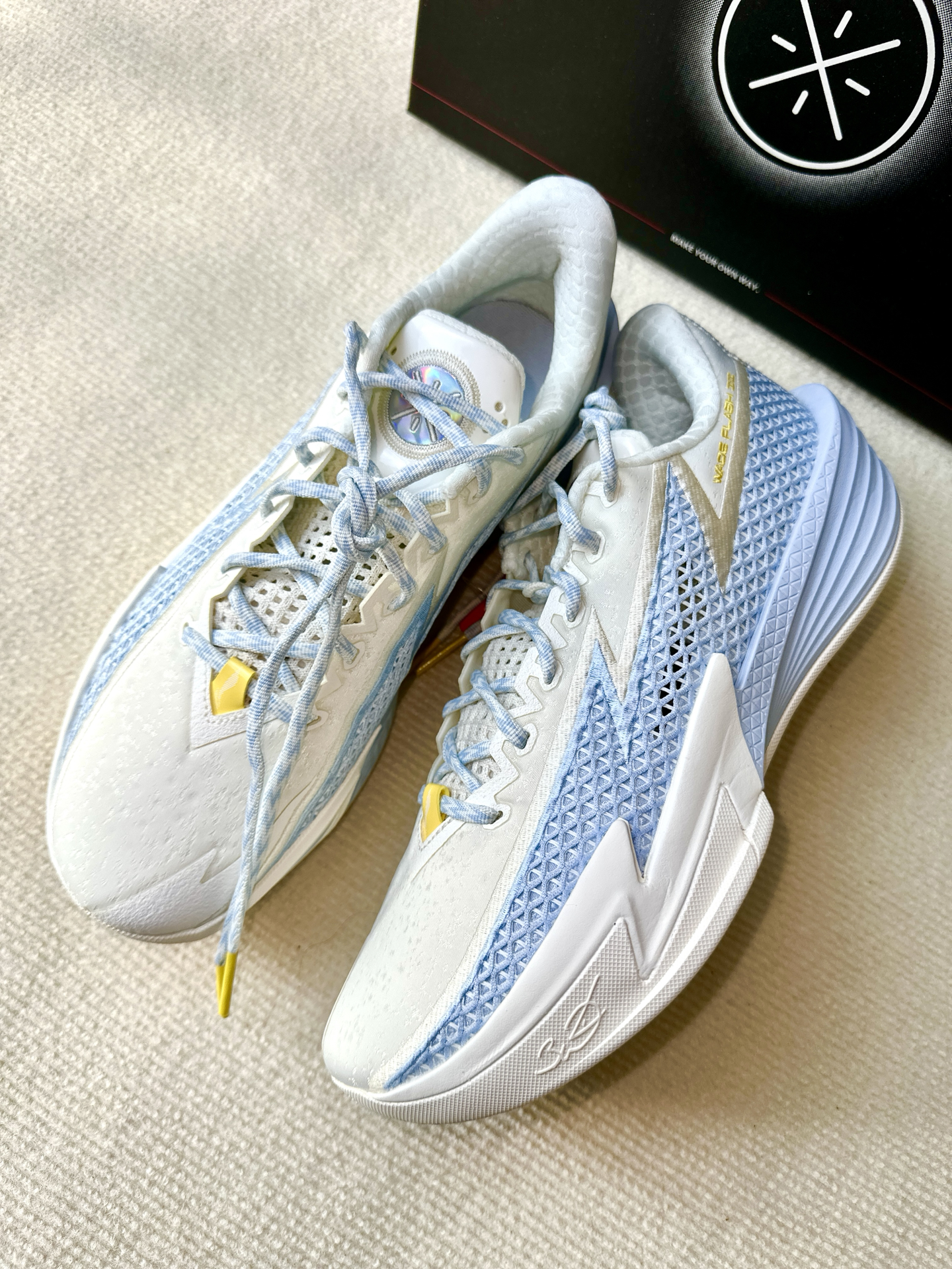 最近我开箱了李宁韦德闪电2,上手感觉比较轻,42码单只305克,没有什么负担感,仔细端详可见球鞋设计的细节也比较多,大底纹路细密印有logo。这次配置上用的是lightfoam ultra➕全掌四雷,既要稳定性又要回弹感,我是130斤完全还踩不透,虽名为闪电像是一个适合小体重的球鞋,但是我感觉160斤完全能够。后跟细节设计和gt心有灵犀,颜值更加流线感了一些,我是略高脚背正常脚,穿上去没有感觉压脚...