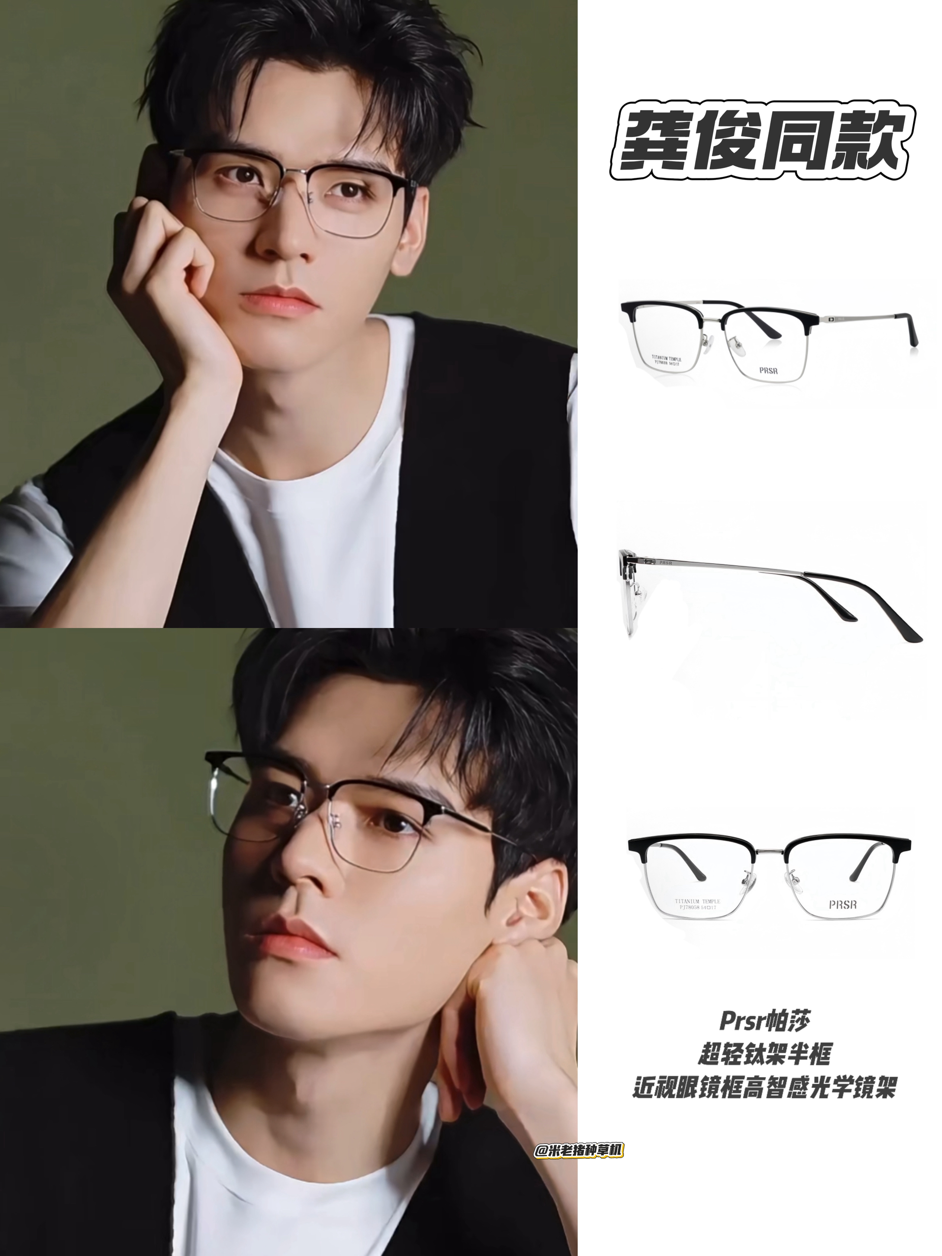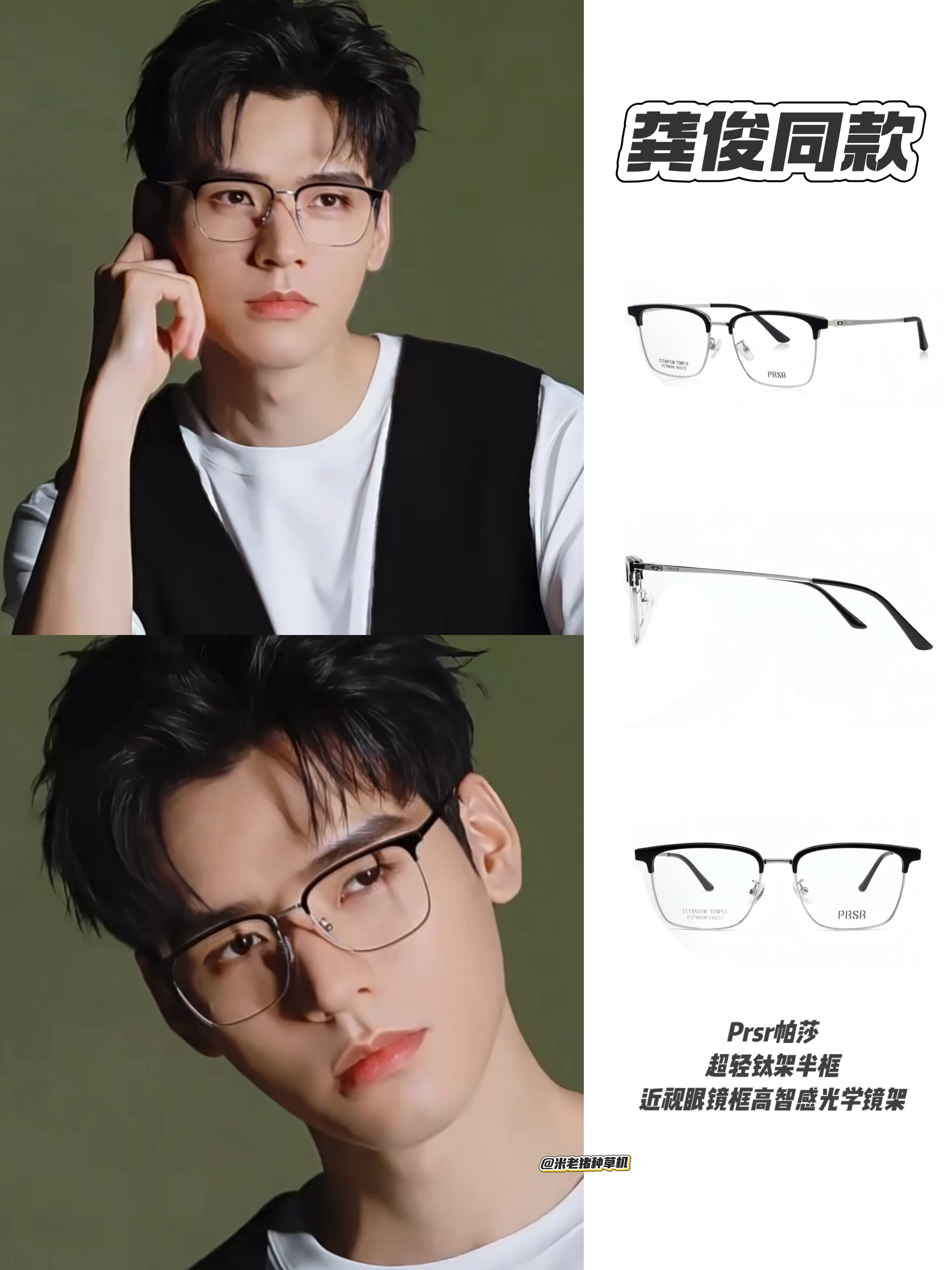 戴上秒变学霸!这款眼镜框把龚俊儒雅气质直接拉满~ 帕莎这款金属边框与透明镜片的组合,营造出一种儒雅的精英感。利落的线条和黑银配色,能瞬间提升气场,让佩戴者看起来既学识渊博又深不可测,是打造"斯文败类"风格的绝佳单品。