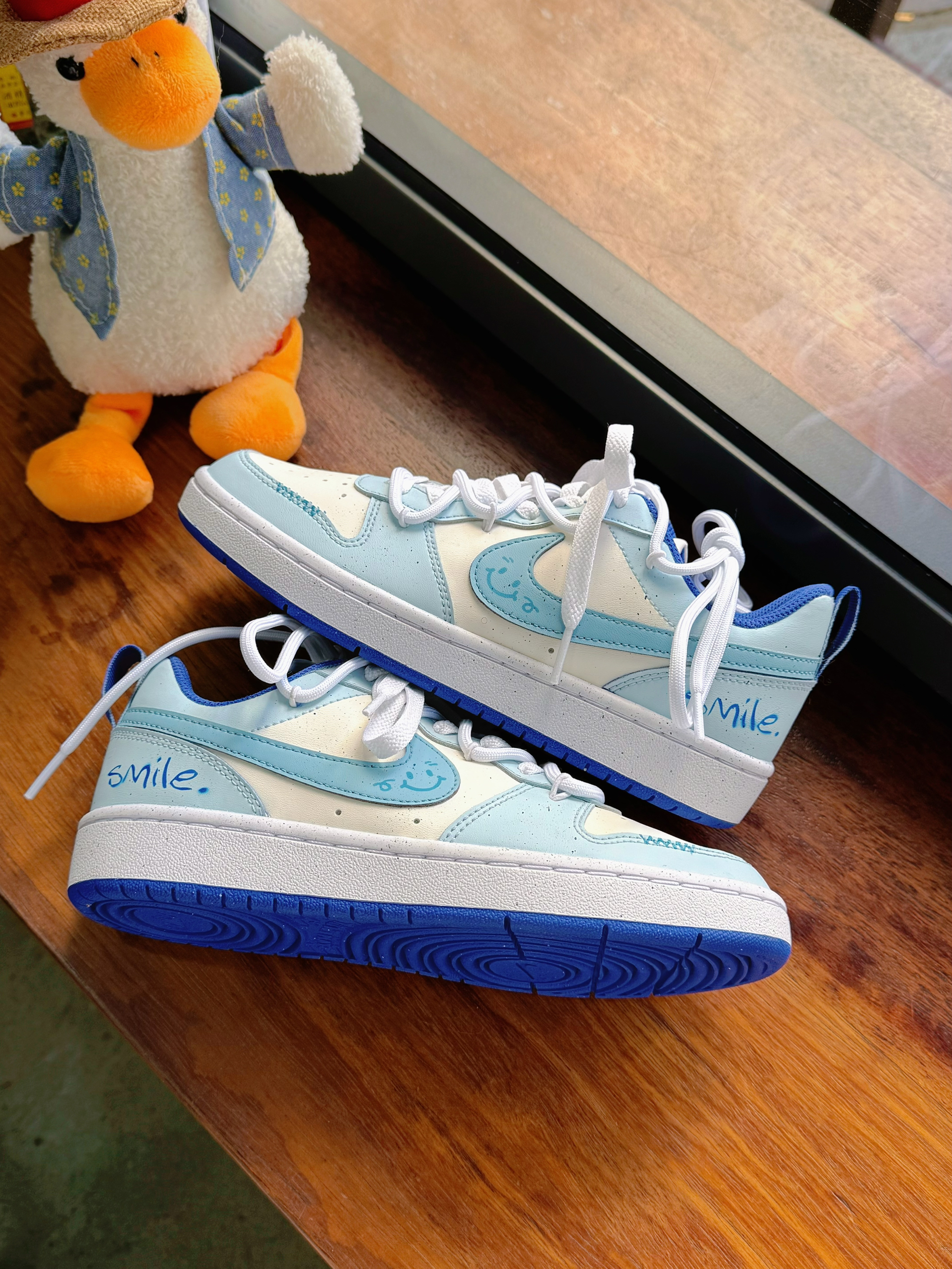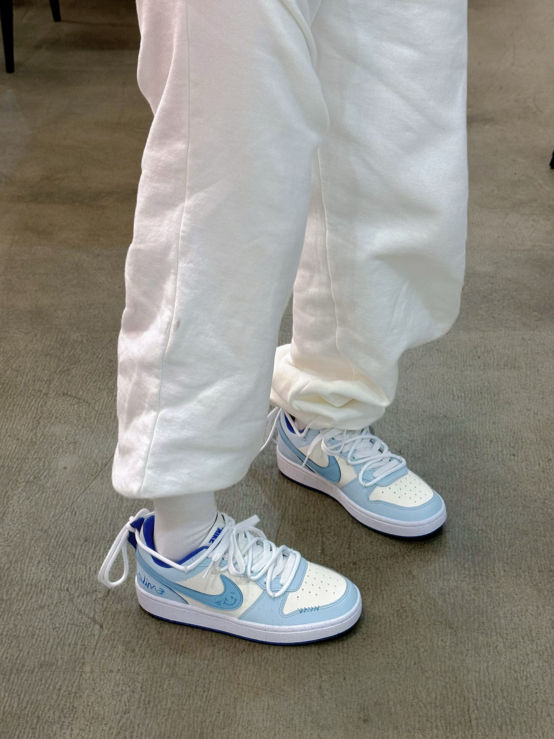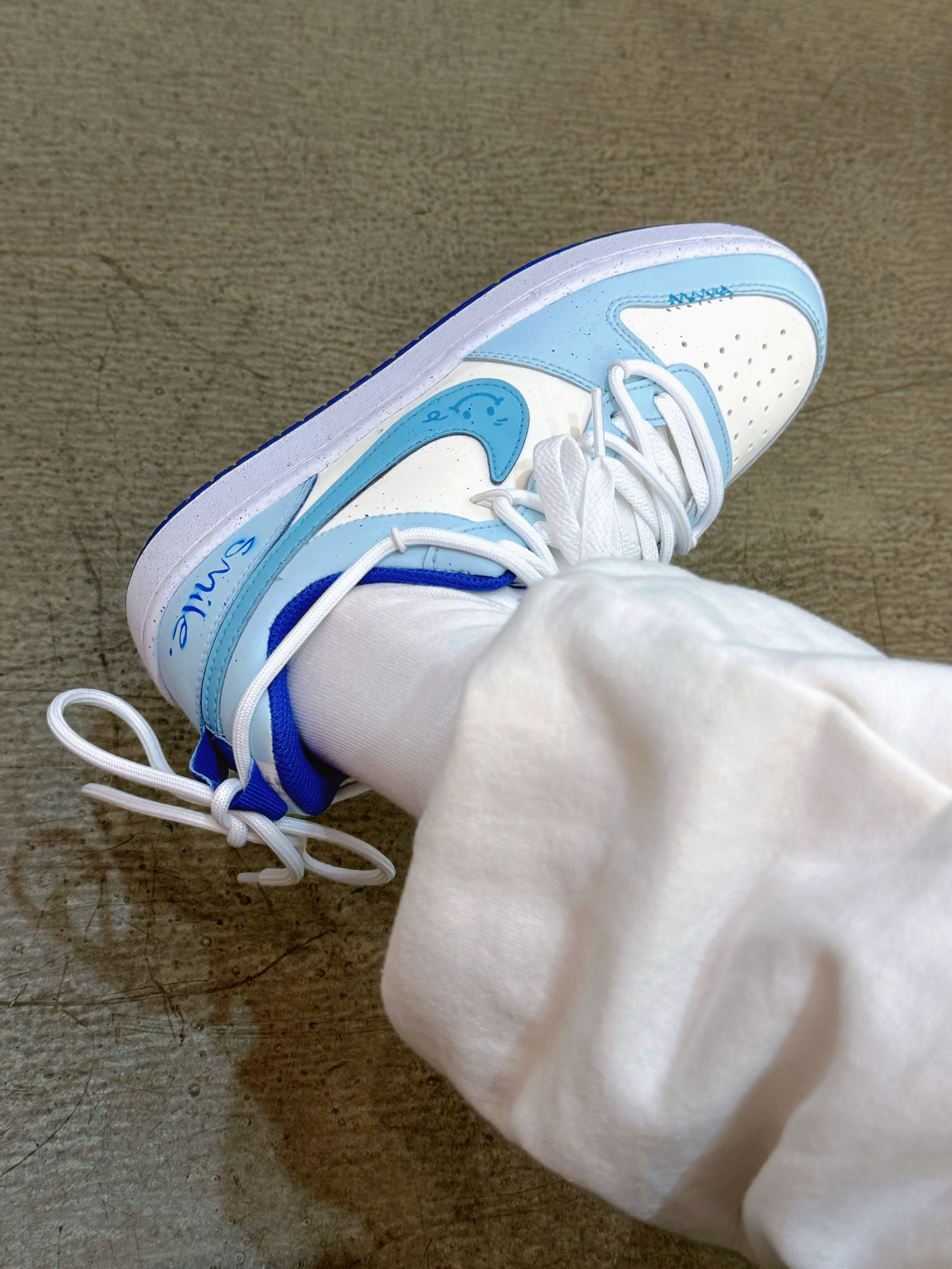 奶白拼浅蓝真的太治愈了 一上脚就直接清新感住的 鞋子的侧笑脸图案超治愈 鞋后跟还有smile刺绣细节感拉满~ 粗细双鞋带设计很喜欢 不管是日常还是健身都司拿捏 我随便搭配一条白裤子就好看 假期搭堆堆袜、小裙子或牛仔裤都很出片 小众涂鸦款也不用担心撞款✨