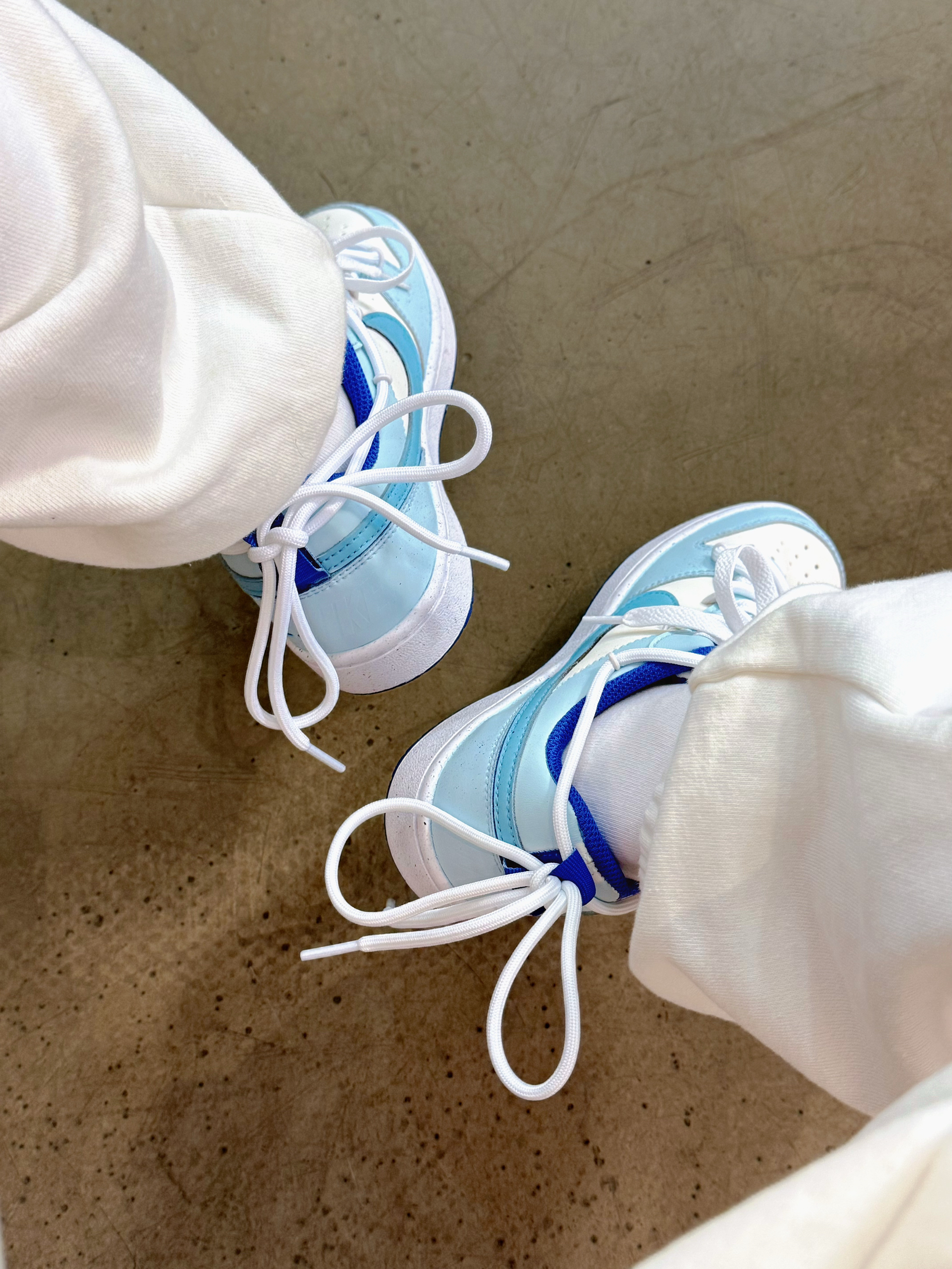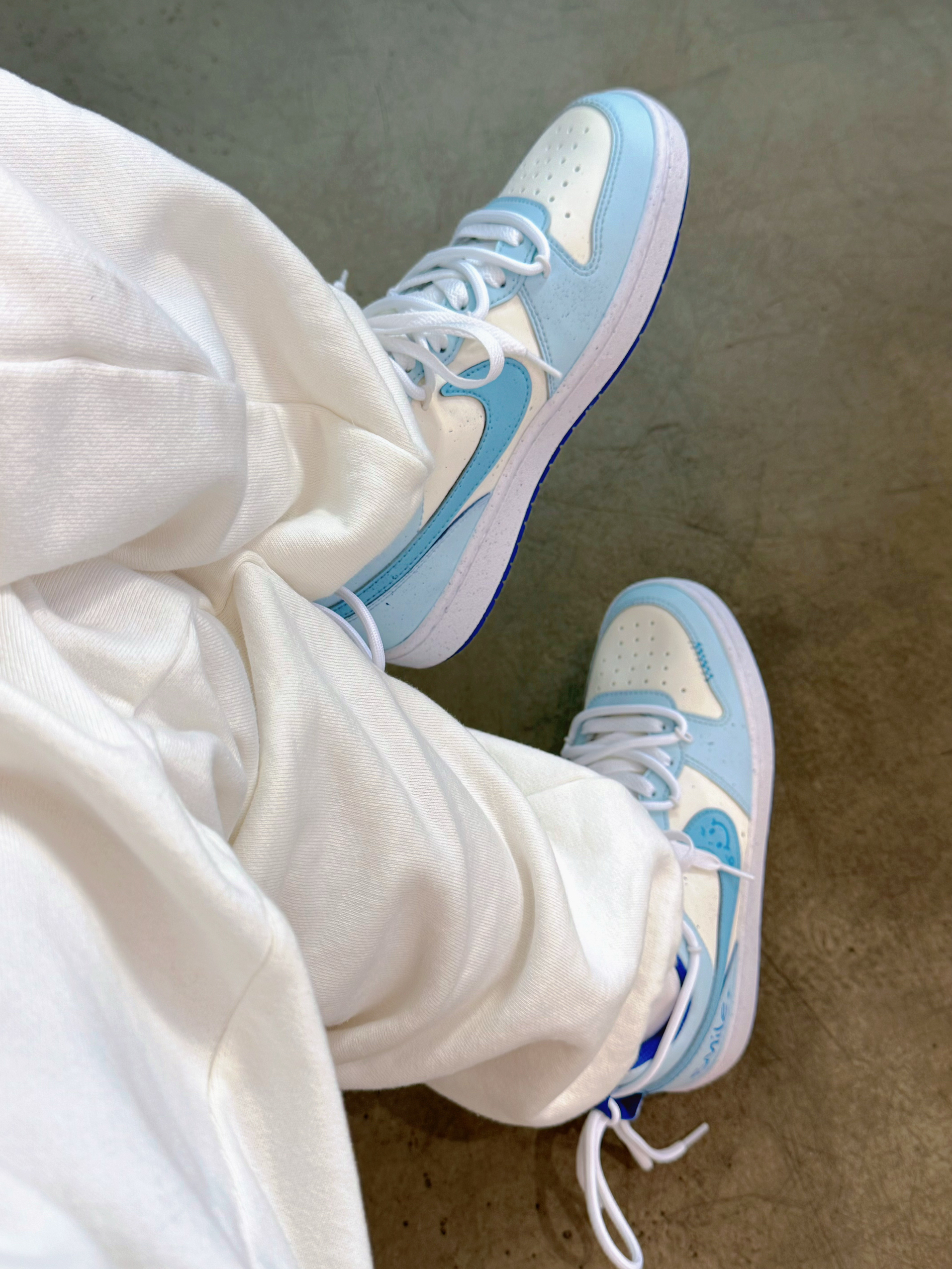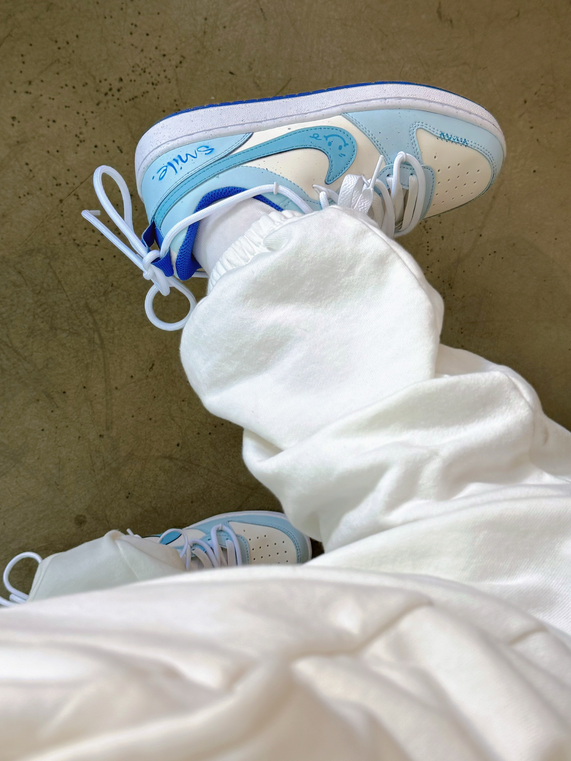 奶白拼浅蓝真的太治愈了 一上脚就直接清新感住的 鞋子的侧笑脸图案超治愈 鞋后跟还有smile刺绣细节感拉满~ 粗细双鞋带设计很喜欢 不管是日常还是健身都司拿捏 我随便搭配一条白裤子就好看 假期搭堆堆袜、小裙子或牛仔裤都很出片 小众涂鸦款也不用担心撞款✨