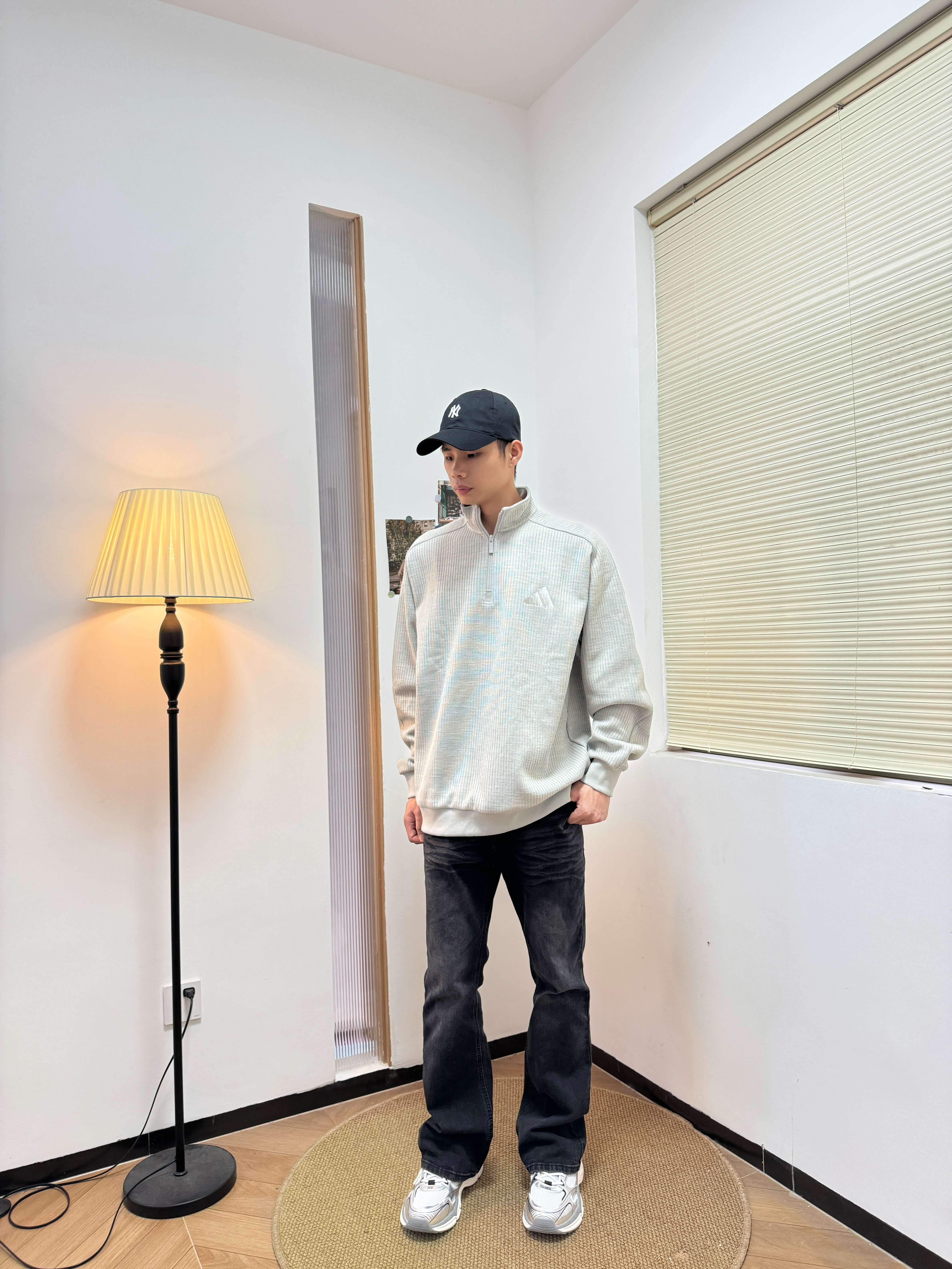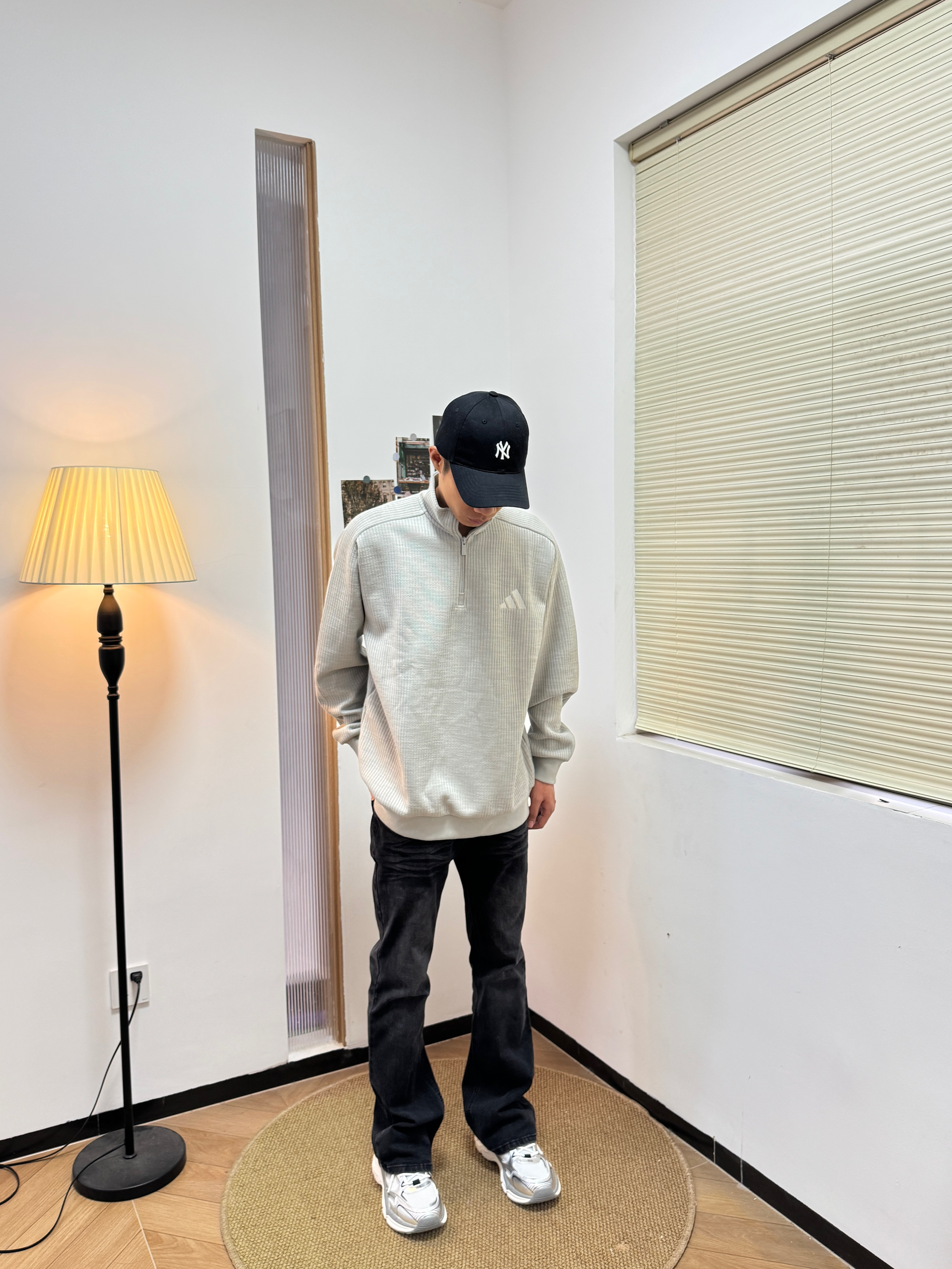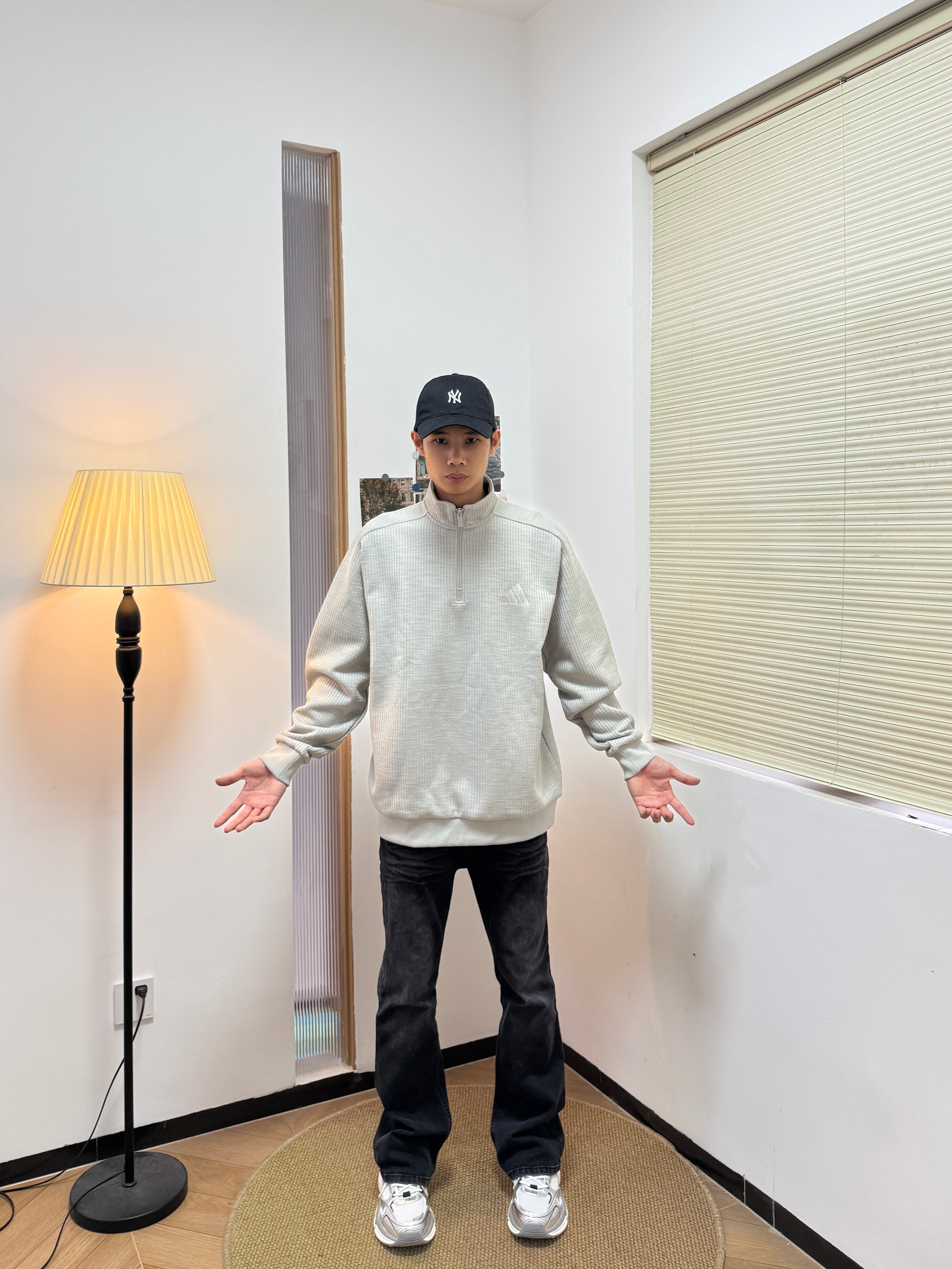上身一件阿迪的半拉链针织衫,单穿或者叠穿都挺合适的。而且它是正肩的版型,上身之后显得身材比较好,像我这种偏瘦的也可以驾驭 搭配黑色微喇牛仔裤和银灰色老爹鞋,舒服又不会出错