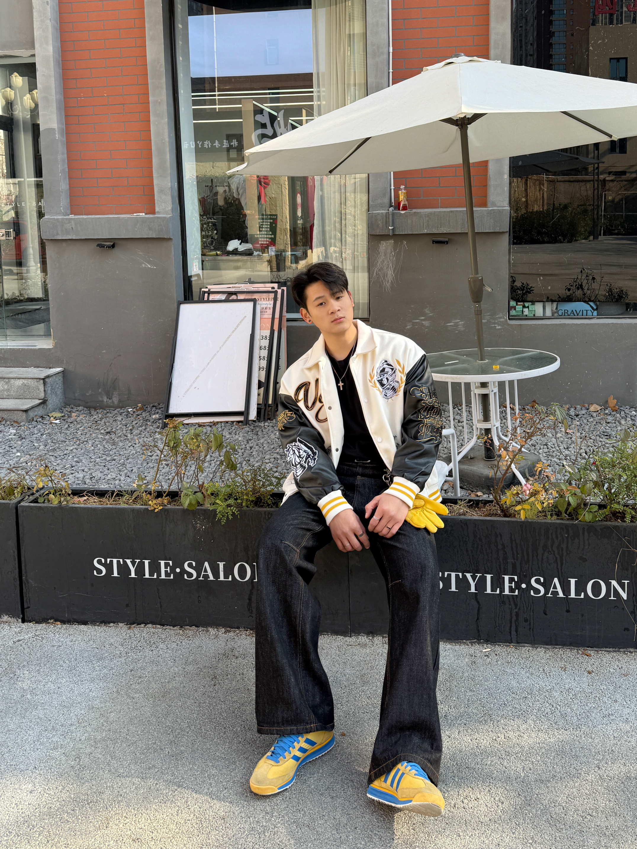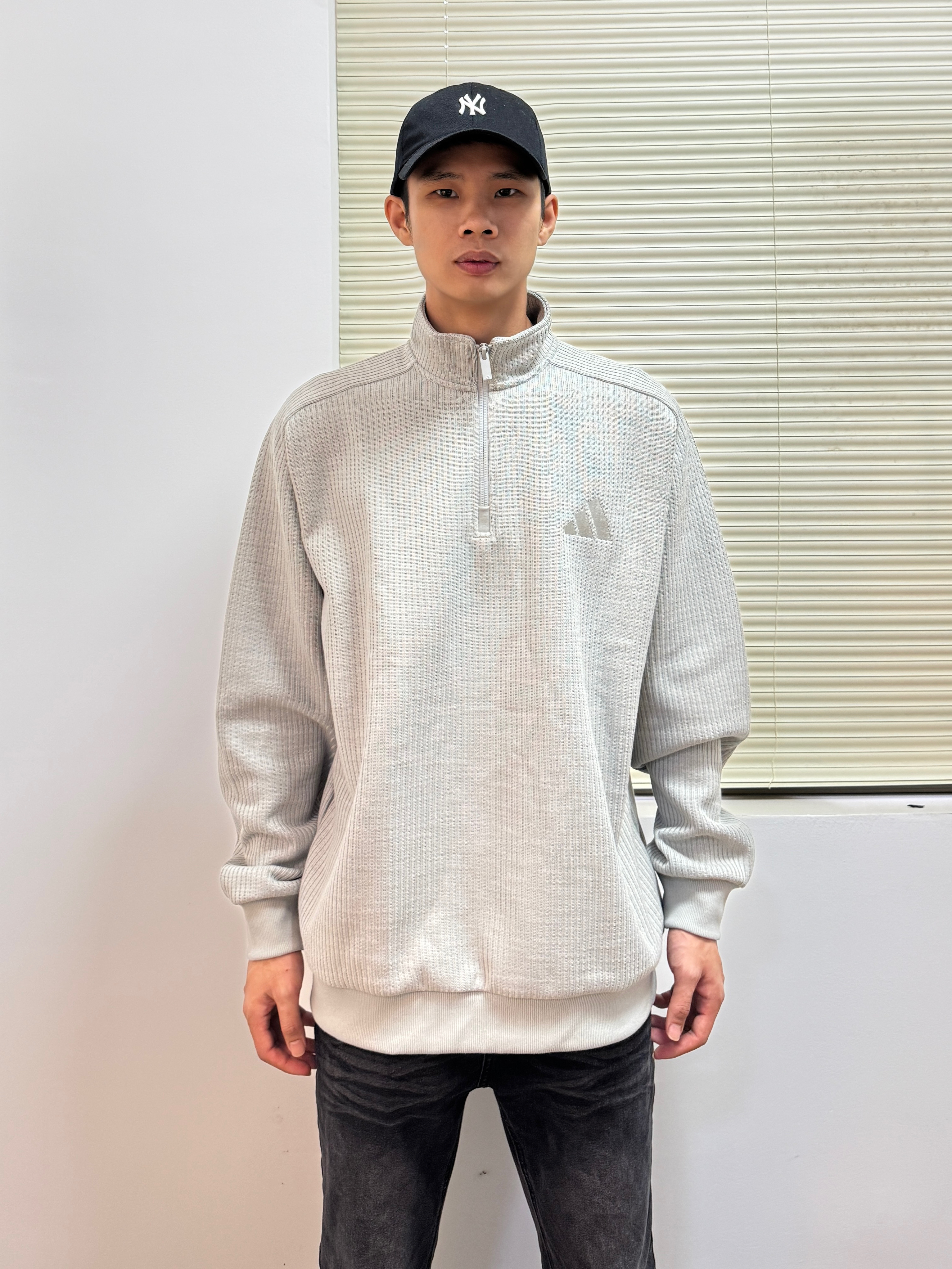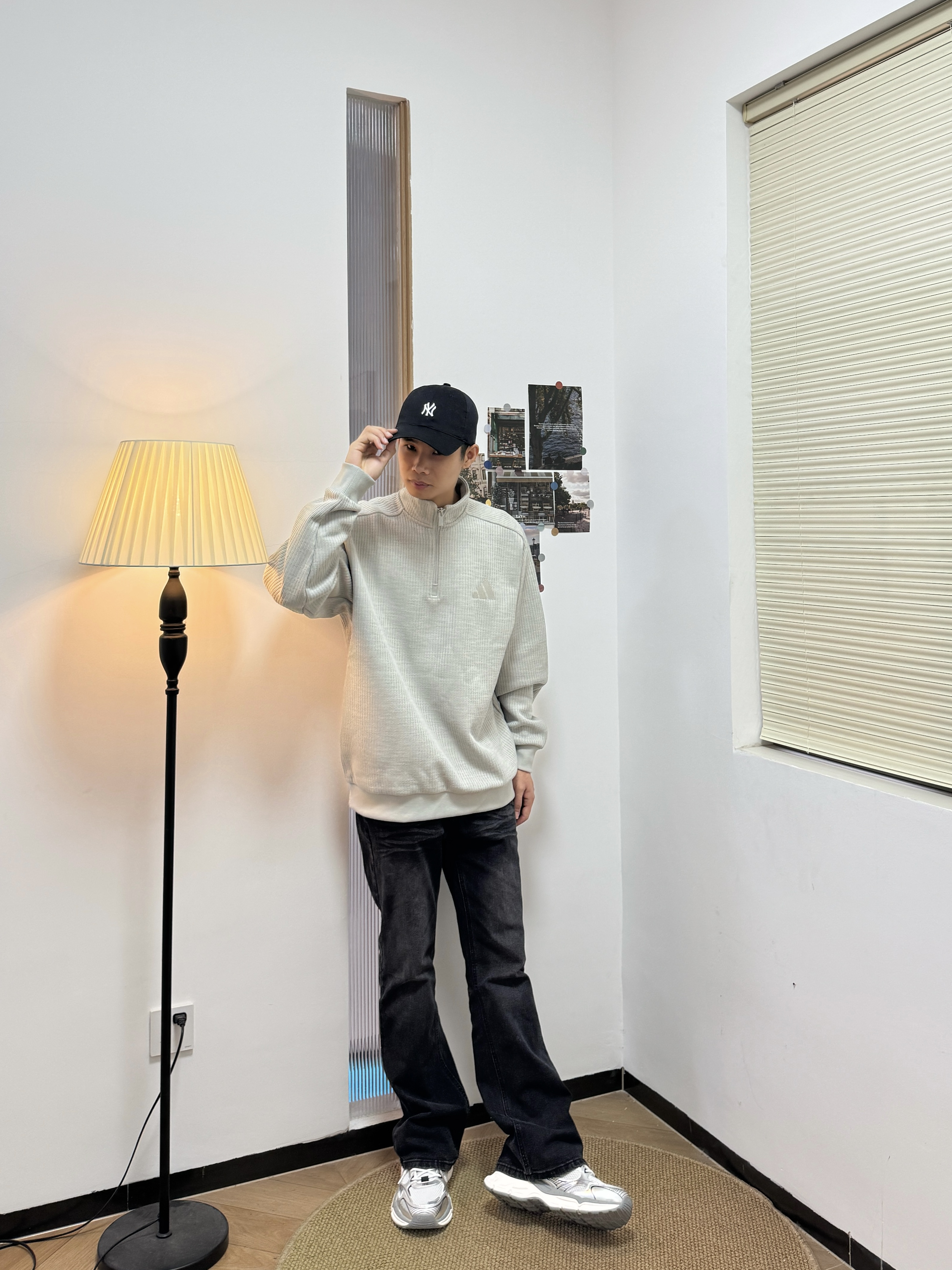 上身一件阿迪的半拉链针织衫,单穿或者叠穿都挺合适的。而且它是正肩的版型,上身之后显得身材比较好,像我这种偏瘦的也可以驾驭 搭配黑色微喇牛仔裤和银灰色老爹鞋,舒服又不会出错