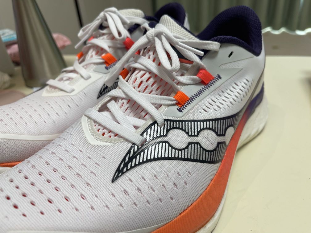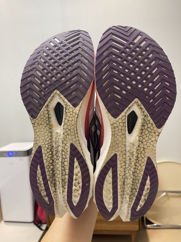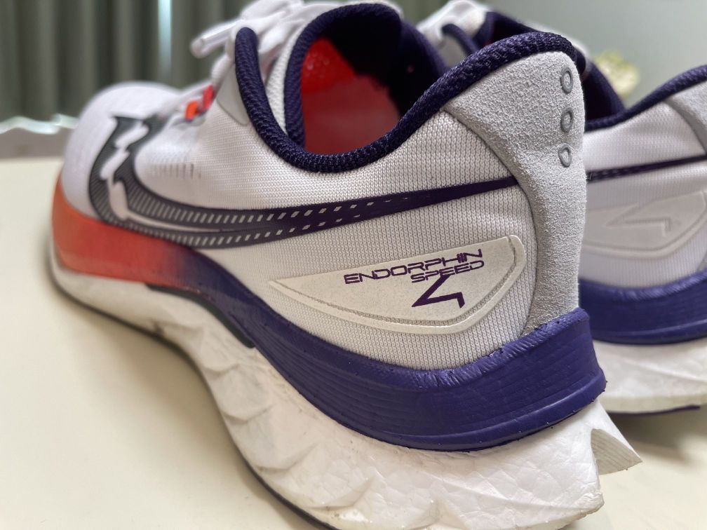 终于入手索康尼Endorphin Speed 4啦!实物的白紫橙配色比官图还耐看,鞋身的线条设计超有速度感,鞋后跟的“4”字标识也很有辨识度~ 上脚第一感受就是轻,鞋面的透气性也在线,夏天跑起来不会闷脚。中底的滚动感特别明显,配速提起来很轻松,不管是日常节奏跑还是间歇训练都能hold住,对中阶跑者特别友好。 美中不足的是鞋楦偏窄,宽脚的兄弟建议选大半码,整体来说是双性价比拉满的