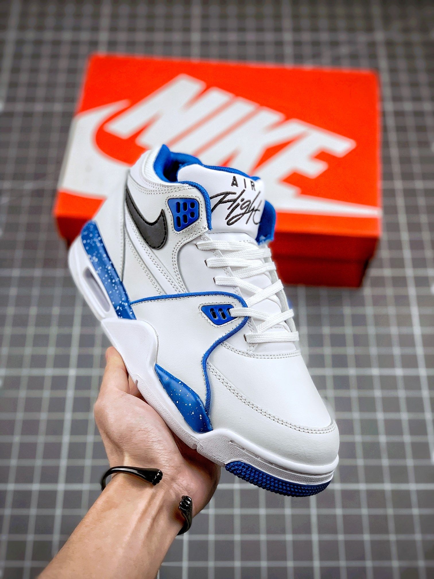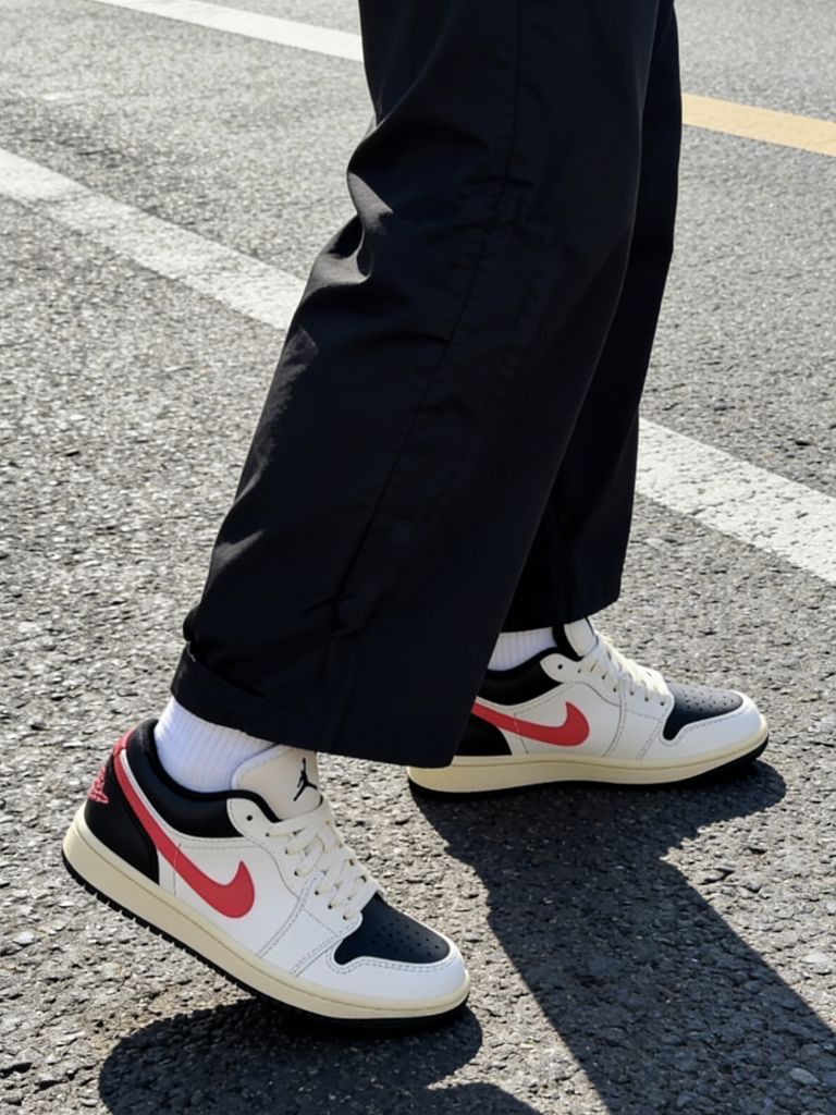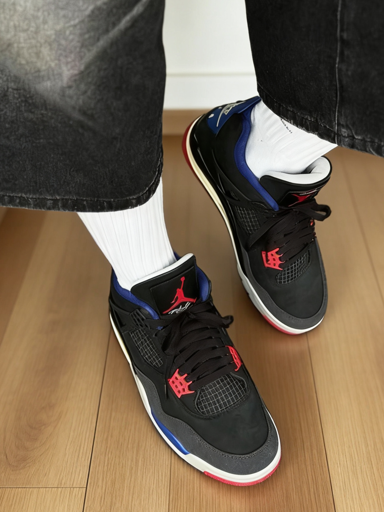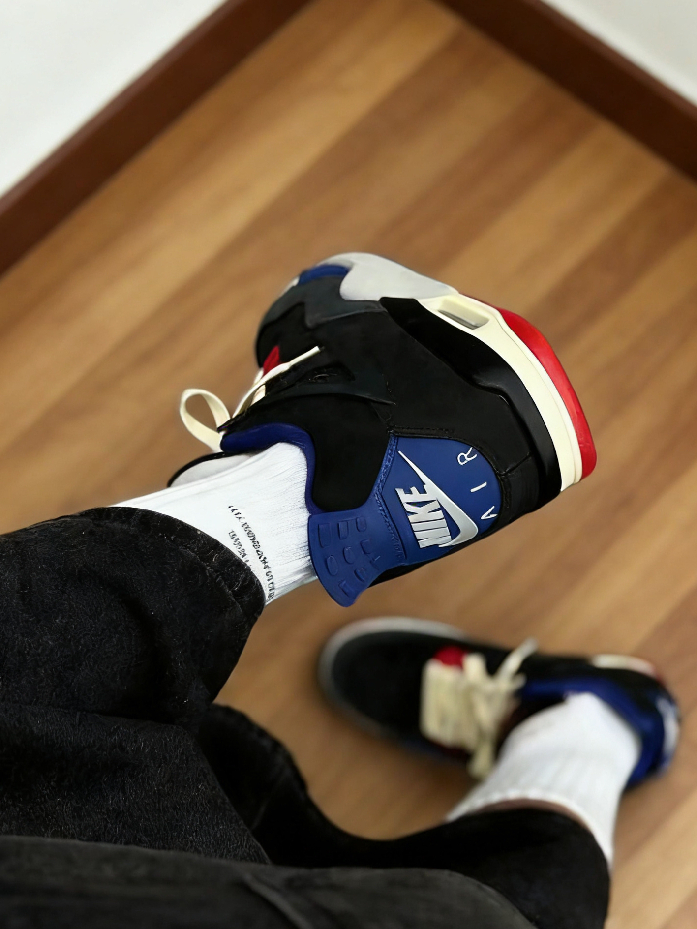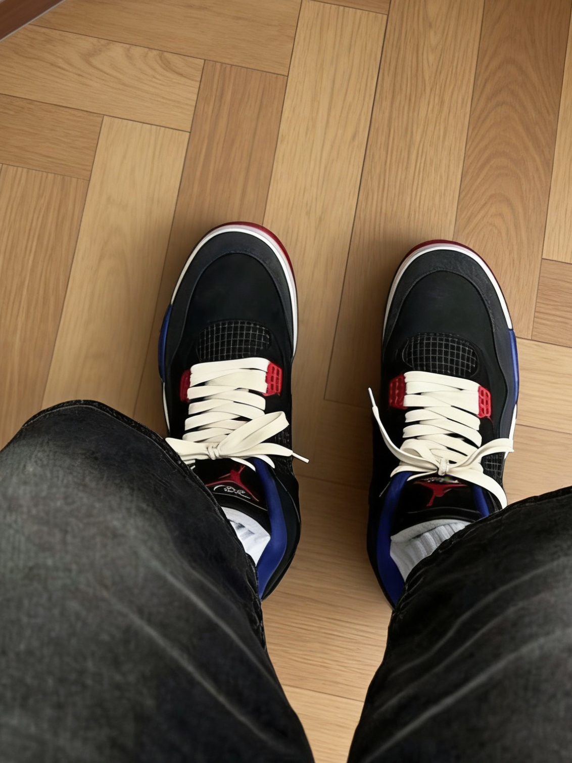 这双AJ4红蓝拼接款真的帅到我了!黑麂皮搭宝蓝和大红撞色,摆在室内木地板上看质感超绝,复古街头风直接拉满,配黑色牛仔裤、工装裤都能穿出腔调。 本以为AJ4的脚感会偏硬,结果上脚体验完全出乎意料——中底的缓震感很扎实,周末在街头走了大半天,脚底板一点都不酸,鞋帮的填充也很饱满,不会磨脚踝。鞋头的网布设计透气性不错,夏天穿薄袜也不会闷脚,就是麂皮部分容易沾灰,用软毛刷轻轻扫一下就能干净。 尺码建议...