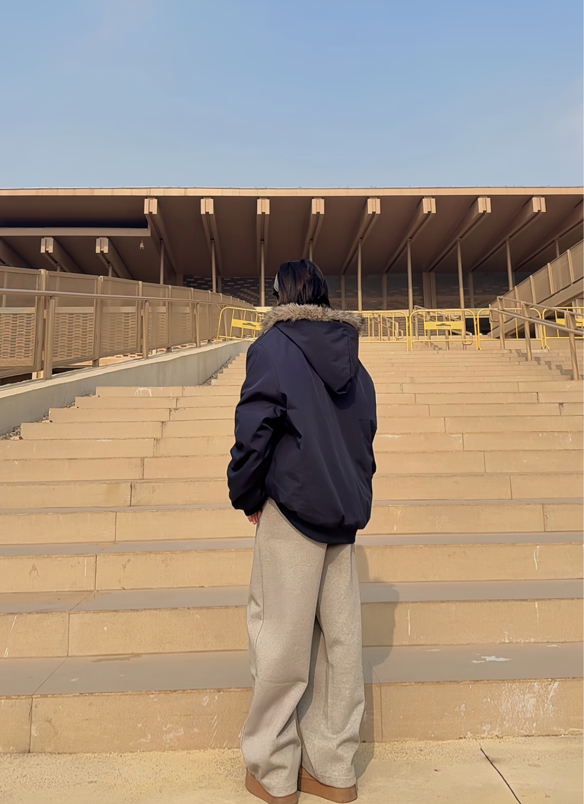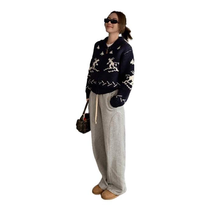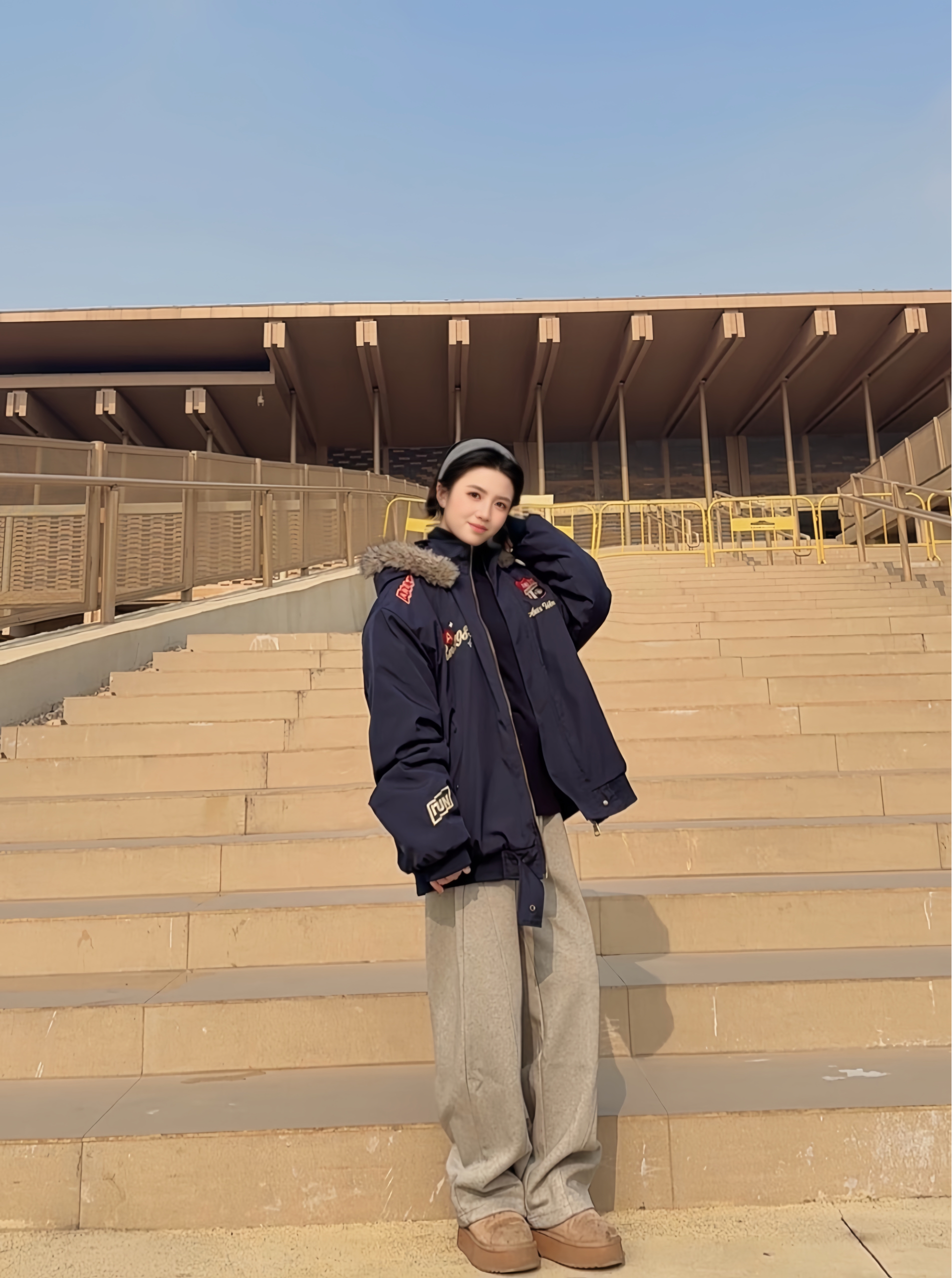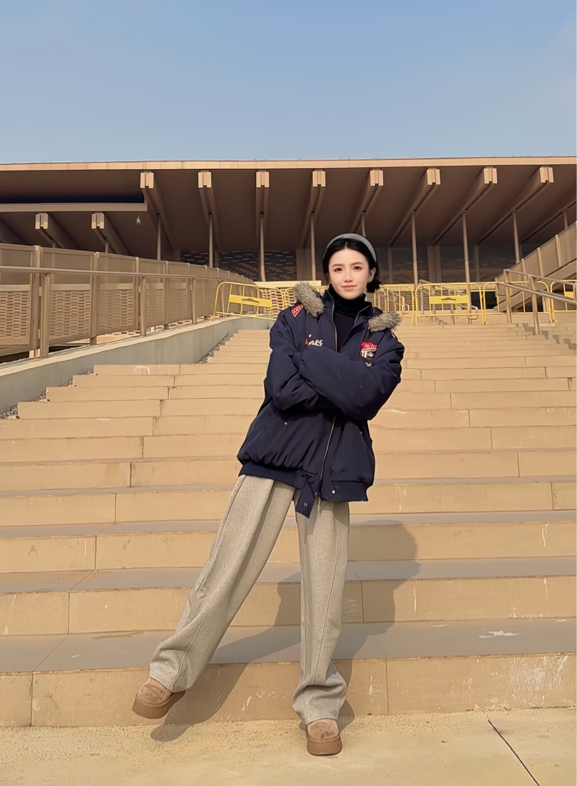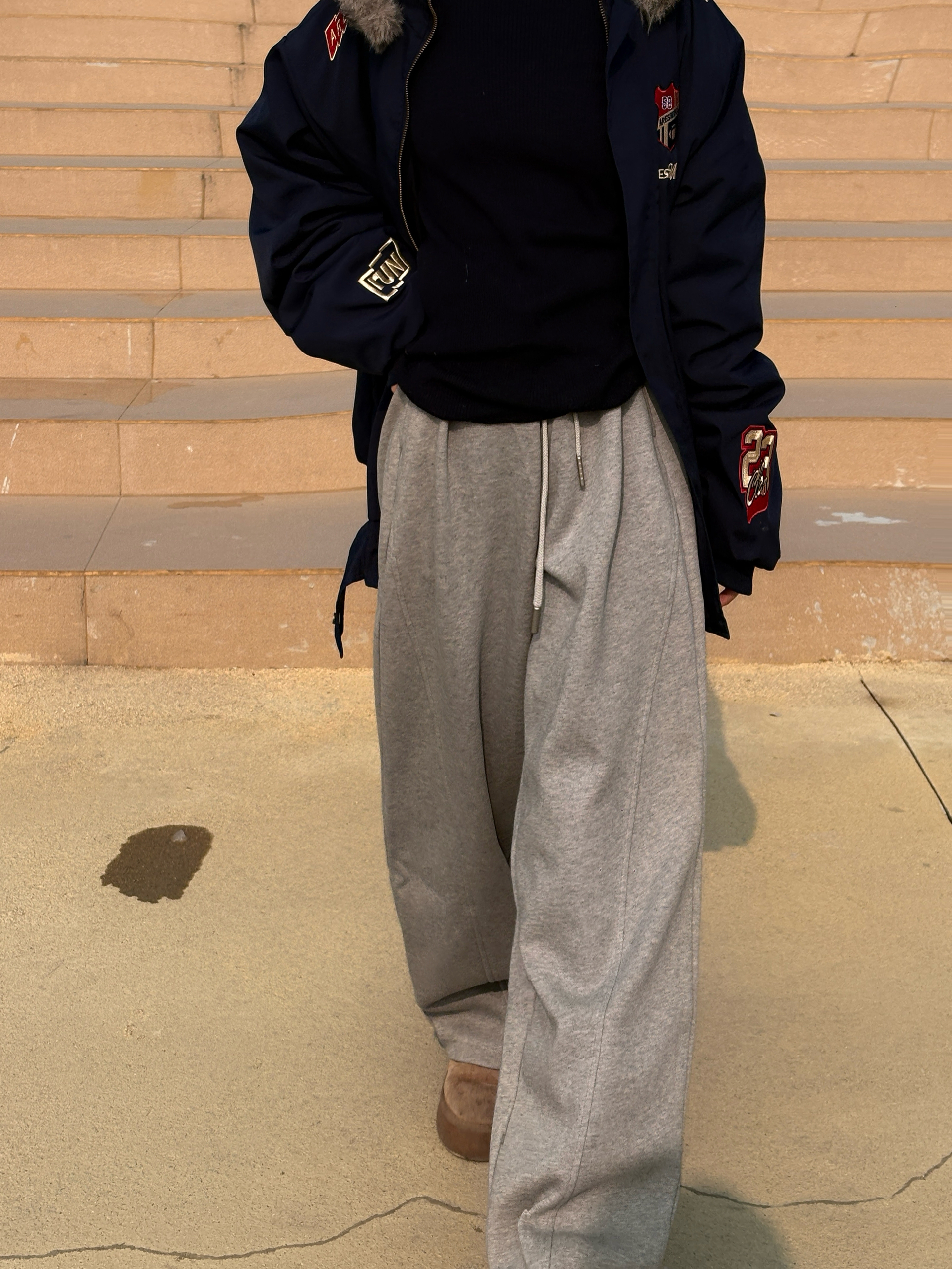 浅灰卫裤慵懒感拉满,宽松裤型藏肉又显腿长😍 搭配藏青外套中和休闲感,冬日随性松弛感就靠它拿捏啦✨
