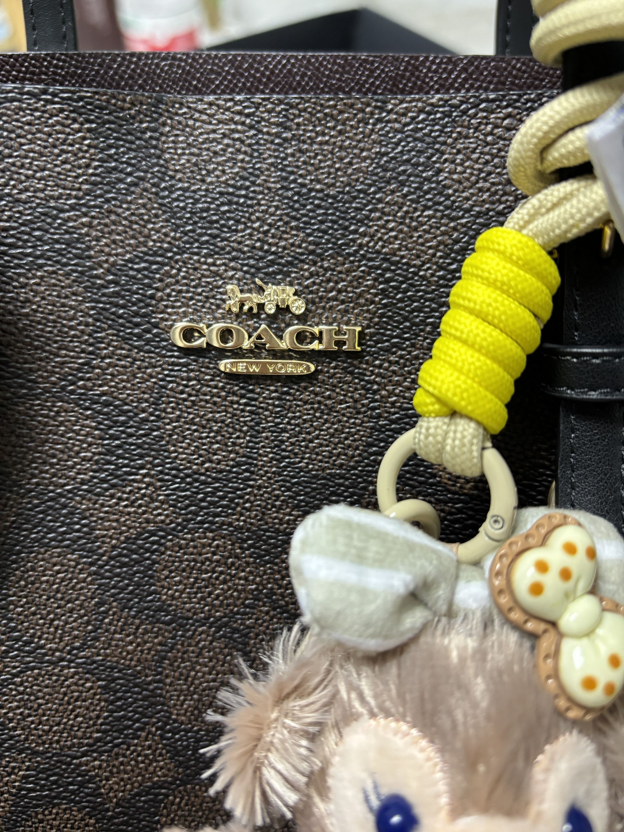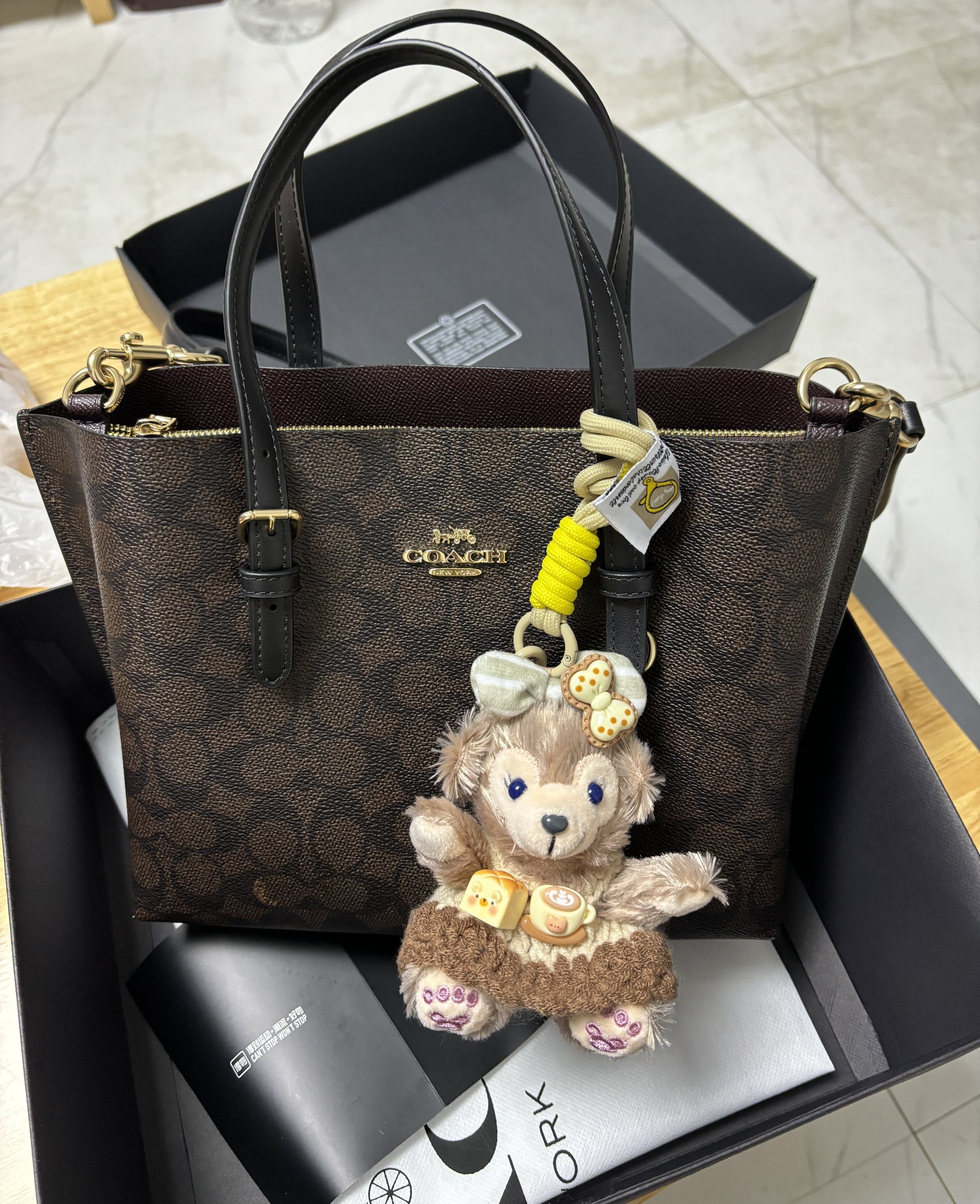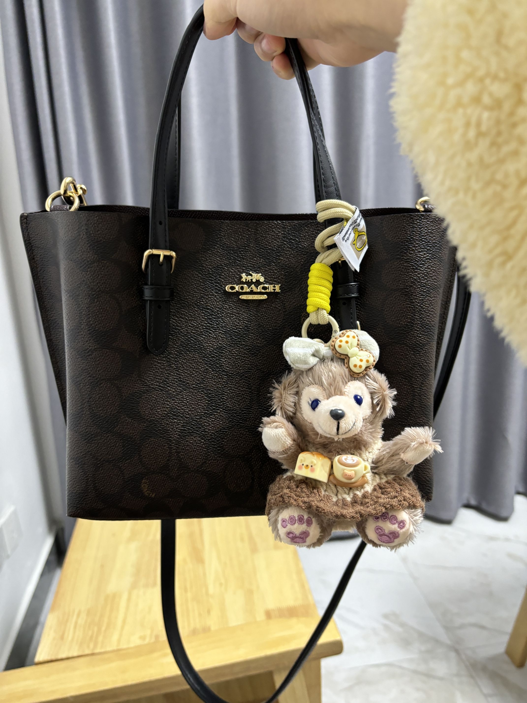 为庆祝女朋友面试成功,送她一个包包开心一下。一眼就看中这款手提包,经典的深棕色老花图案皮革,横款方形设计,搭配黑色手柄,金色金属蔻驰logo打磨光滑,刻字清晰,非常有质感。25厘米长的尺寸属于中型托特包,简洁大方。包包中间有隔层,拉链开合丝滑。配有一根可拆卸的长肩带,可手提、单肩背、斜挎或腋下背。搭配女朋友自己买的一个可爱小熊挂饰,俏皮感十足,适合日常通勤或休闲出行搭配。哈哈,女盆友非常喜欢,直...