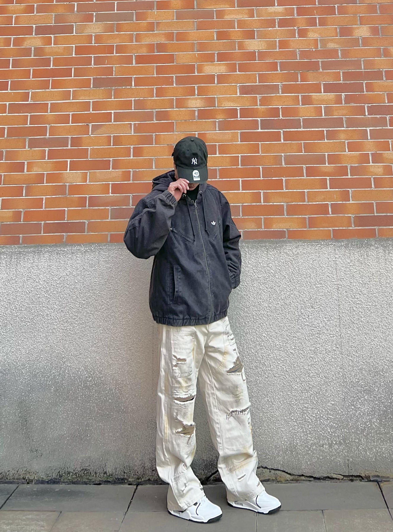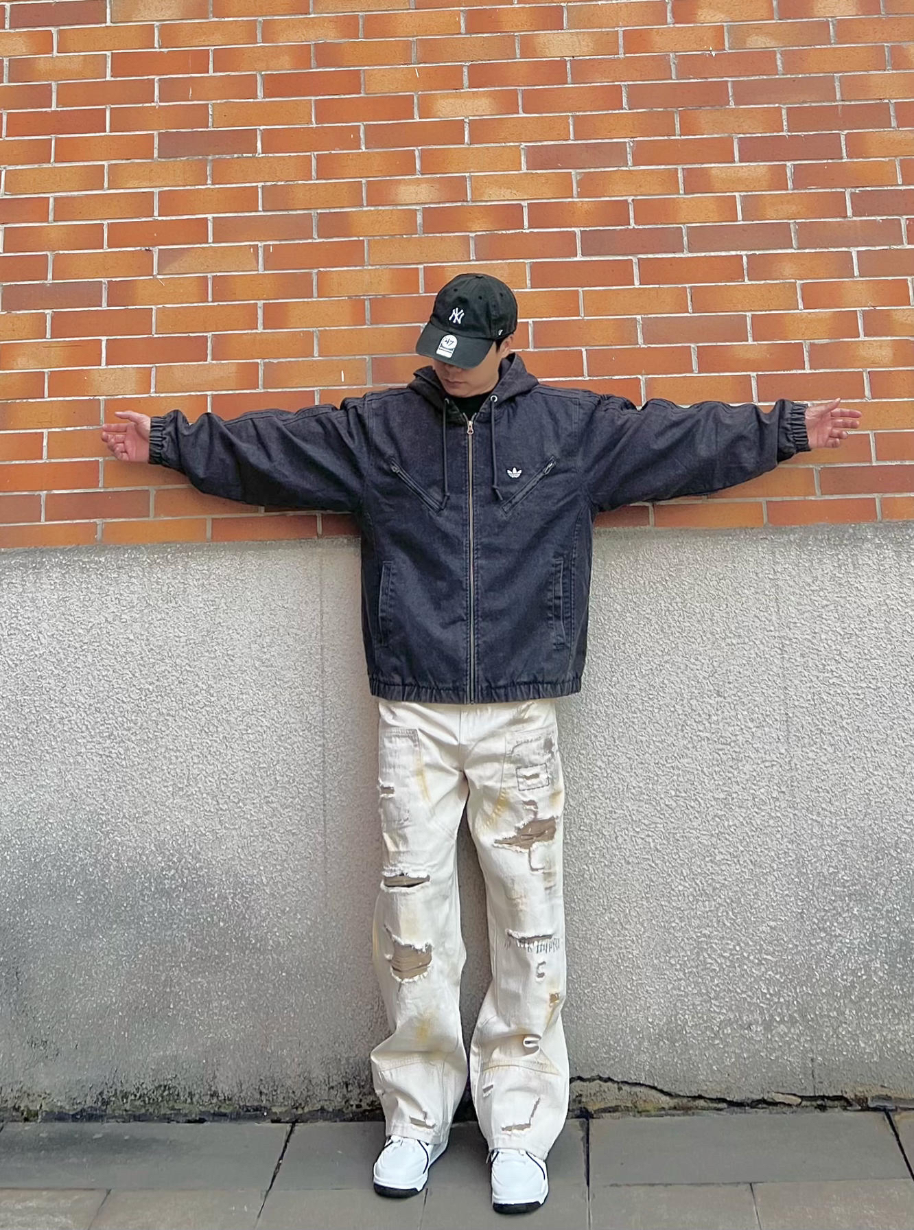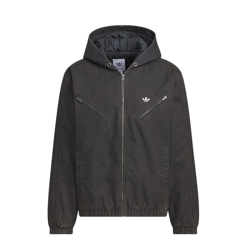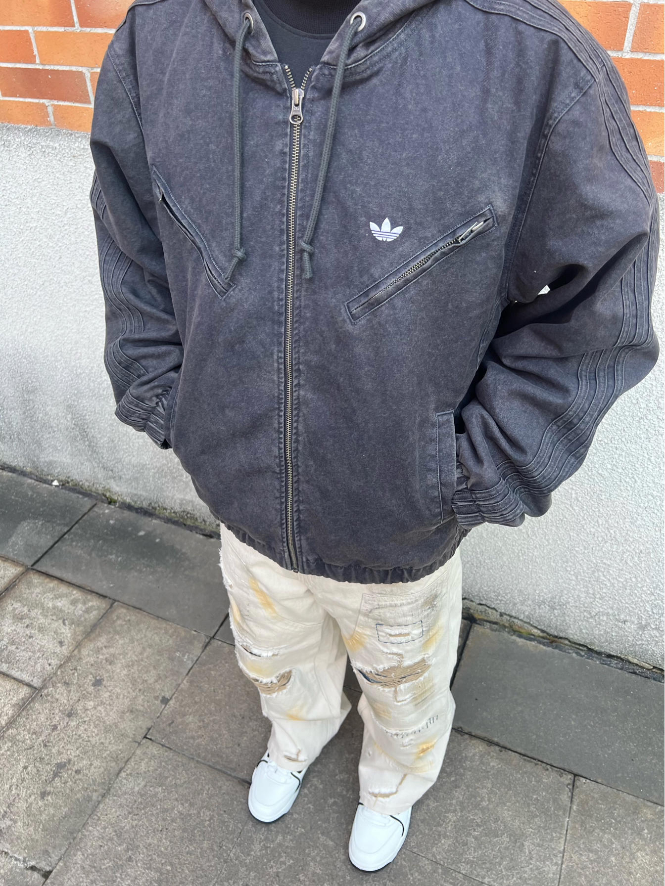 秋冬男生街头风想穿出质感,这件阿迪连帽夹克必须安排。水洗面料质感出众,宽松版型藏肉又显气场 搭配米白破洞工装裤,工装硬朗与街头痞帅完美融合