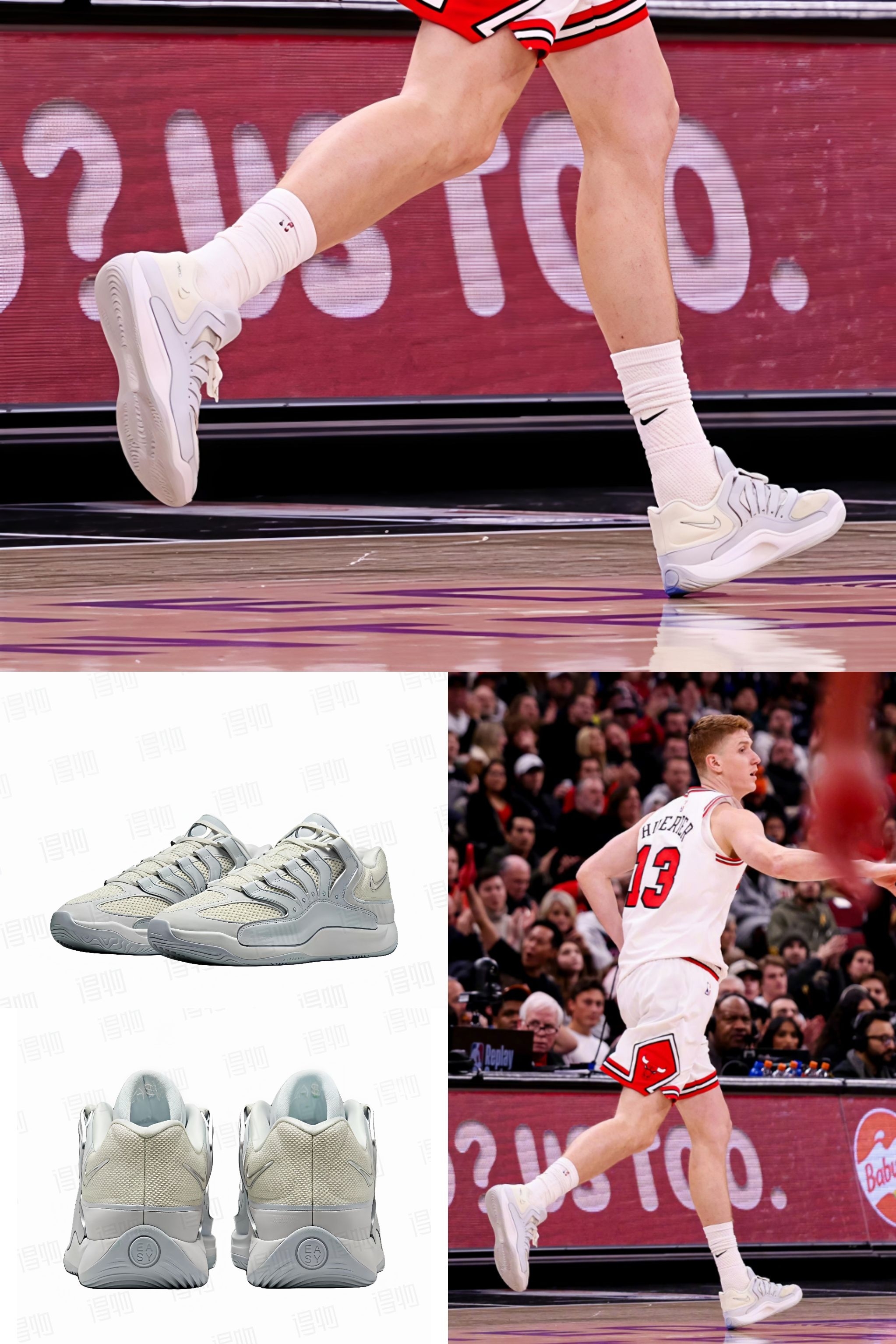 今日公牛队凯文·许尔特上脚Nike KD 18 EP,也叫 "Chain Reaction" 或 "Soft Pearl" 配色。设计特点 - 复古造型:采用了独特的绑带设计,灵感来源于90年代的复古跑鞋,与杜兰特的个人时尚风格相契合。 - 灰白配色:以柔和的珍珠灰和白色为主调,清爽百搭,是目前大货配色中非常受欢迎的一款。 - 实战性能:延续了KD系列的实战性能,适合球场内外的各种场景