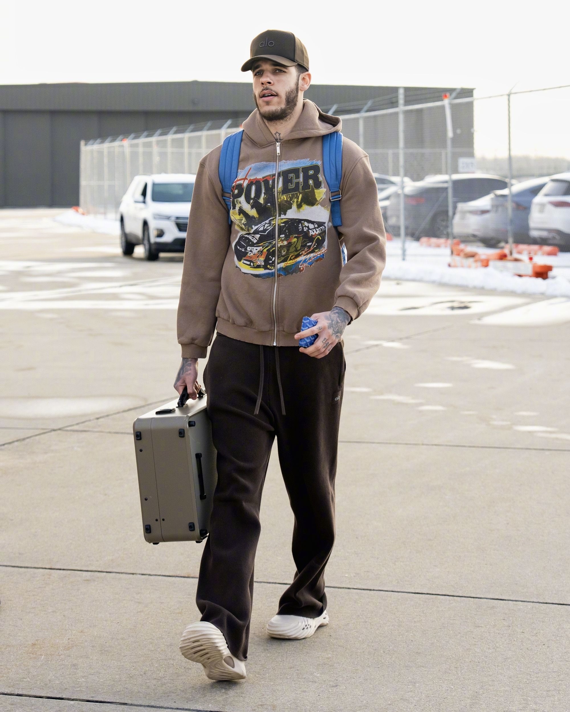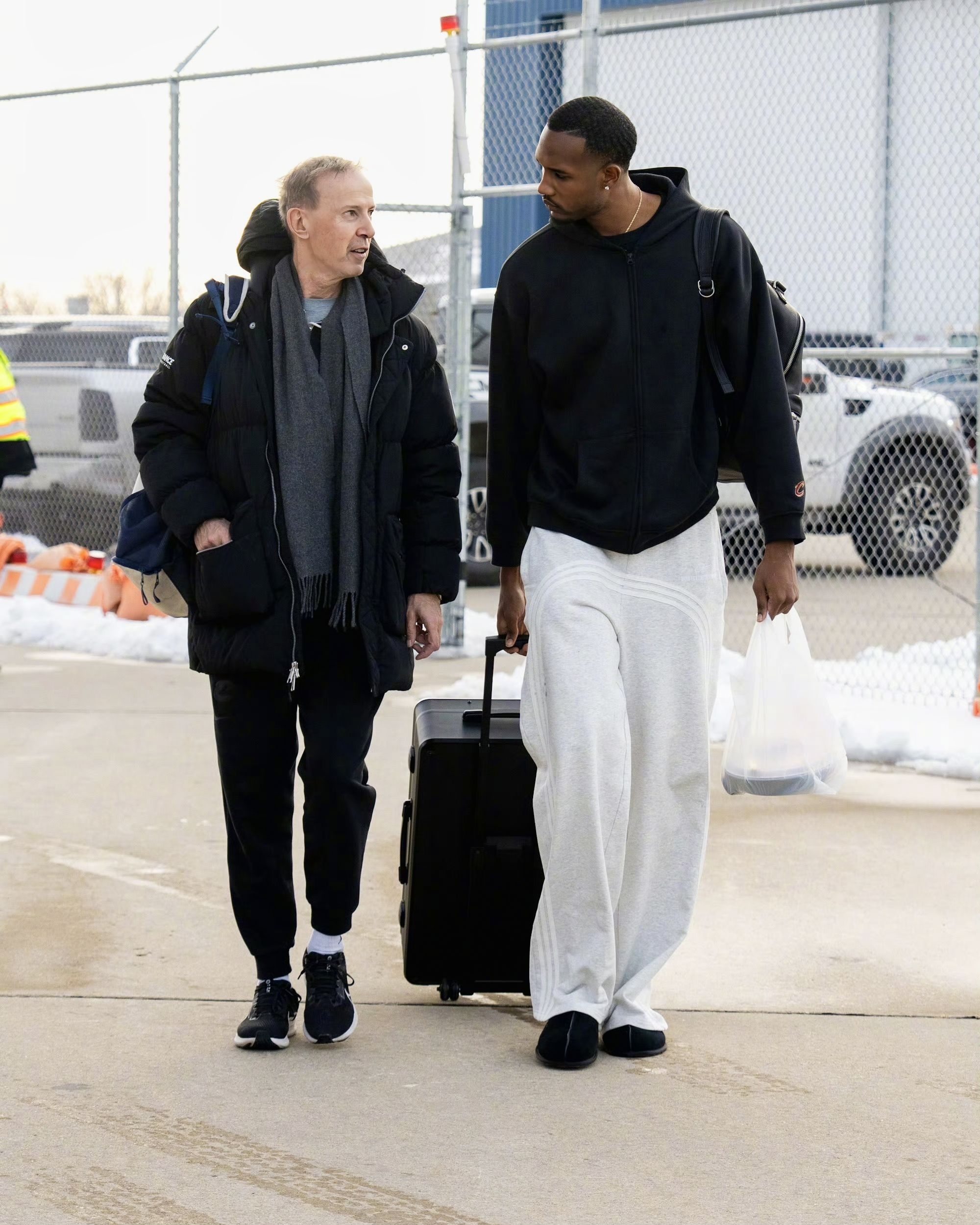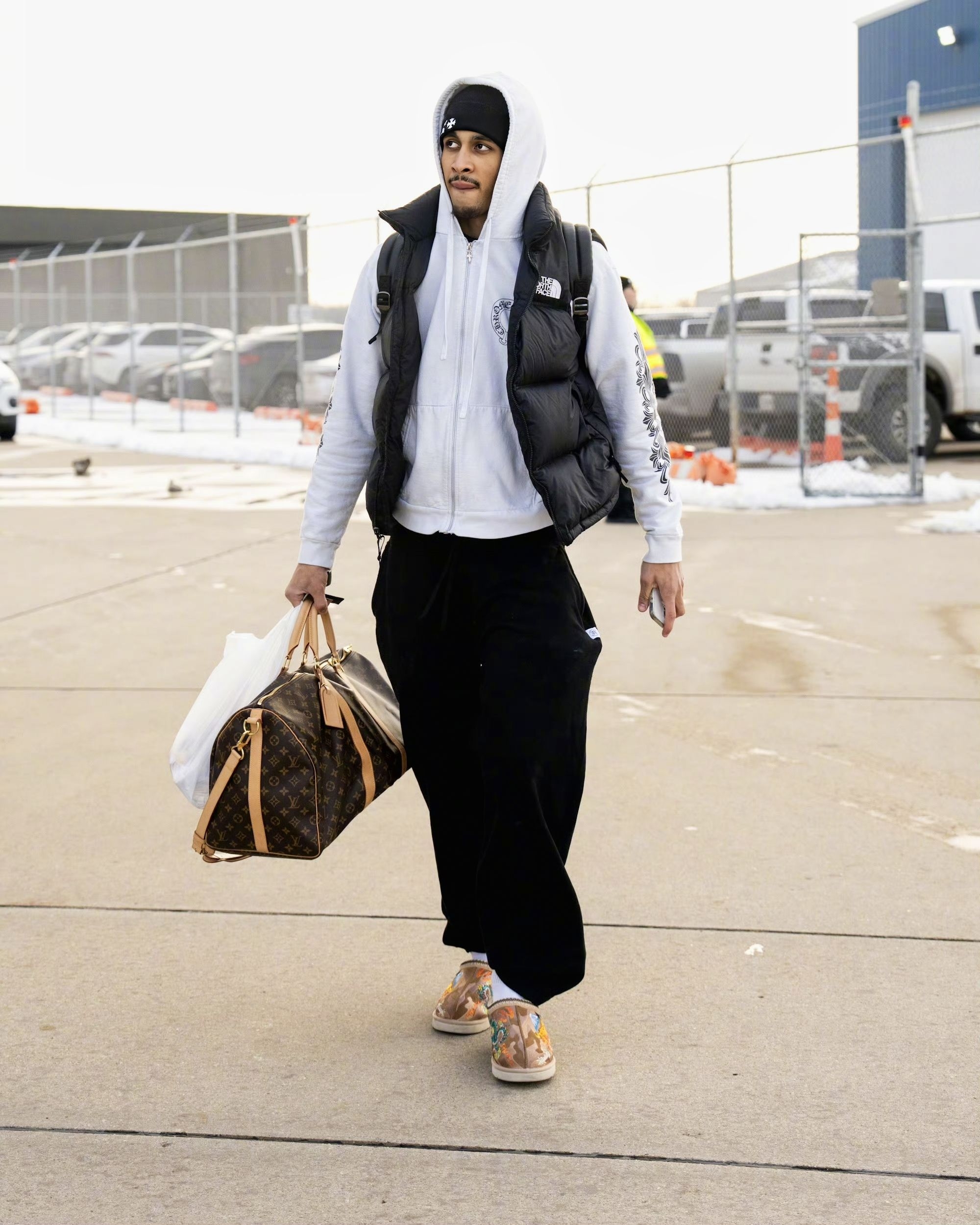 骑士队出征华盛顿的出行画面,能看到球队成员的私服搭配里,既有篮球装备的实用基因,也融入了当下的潮流风格,不同单品的组合也展现出各自的穿搭偏好。 首图里的球员上身LV拼色毛绒外套,搭配的棕色民族风刺绣拖鞋是近期街头穿搭的热门款,荧光绿的行李箱更是让整体造型多了几分视觉冲击力;乐福选择简约的灰色连帽卫衣配黑色运动裤,脚踩经典白色板鞋,走的是休闲舒适的基础款路线;贾勒特·阿伦则以酒红色拉链外套搭配黑...