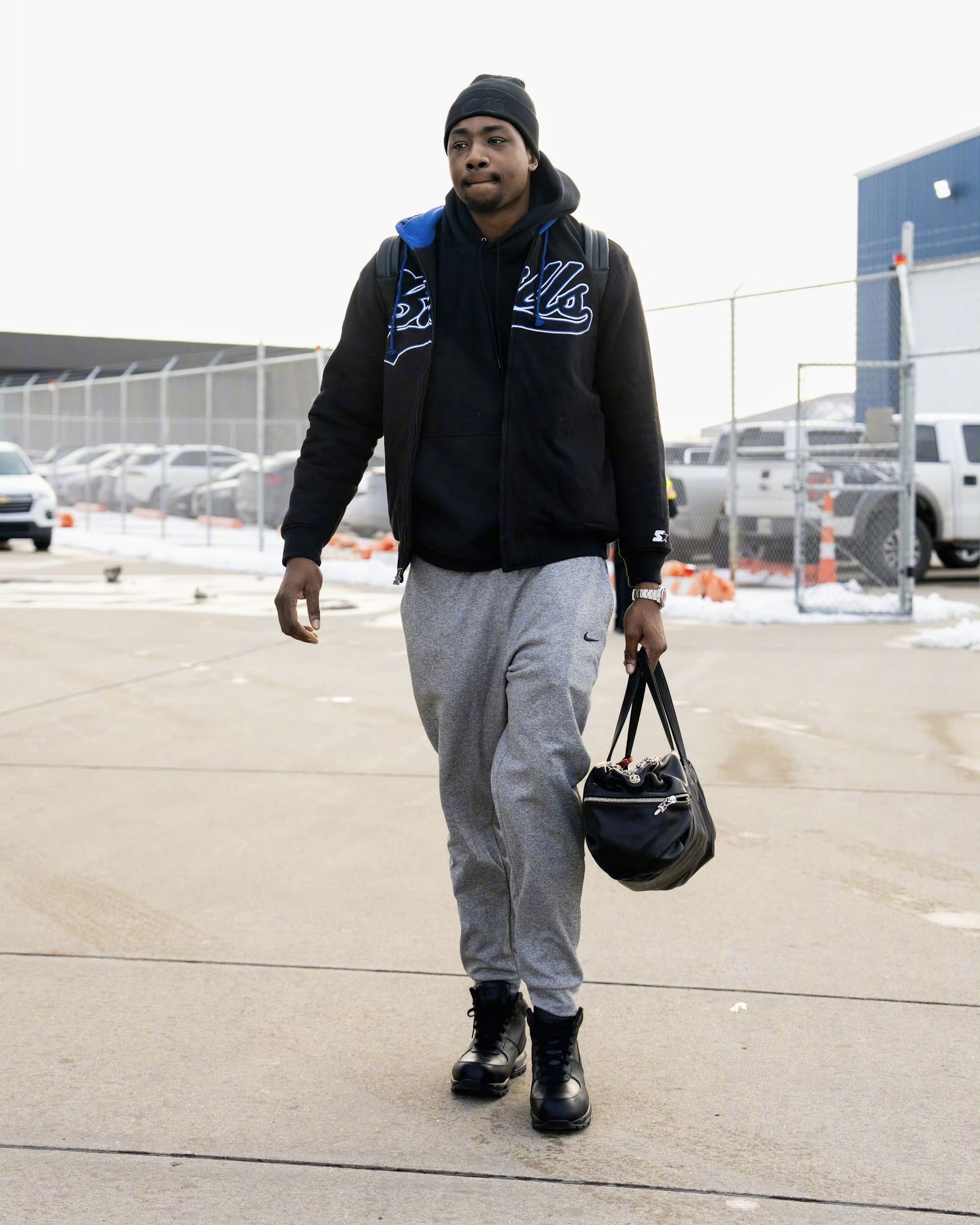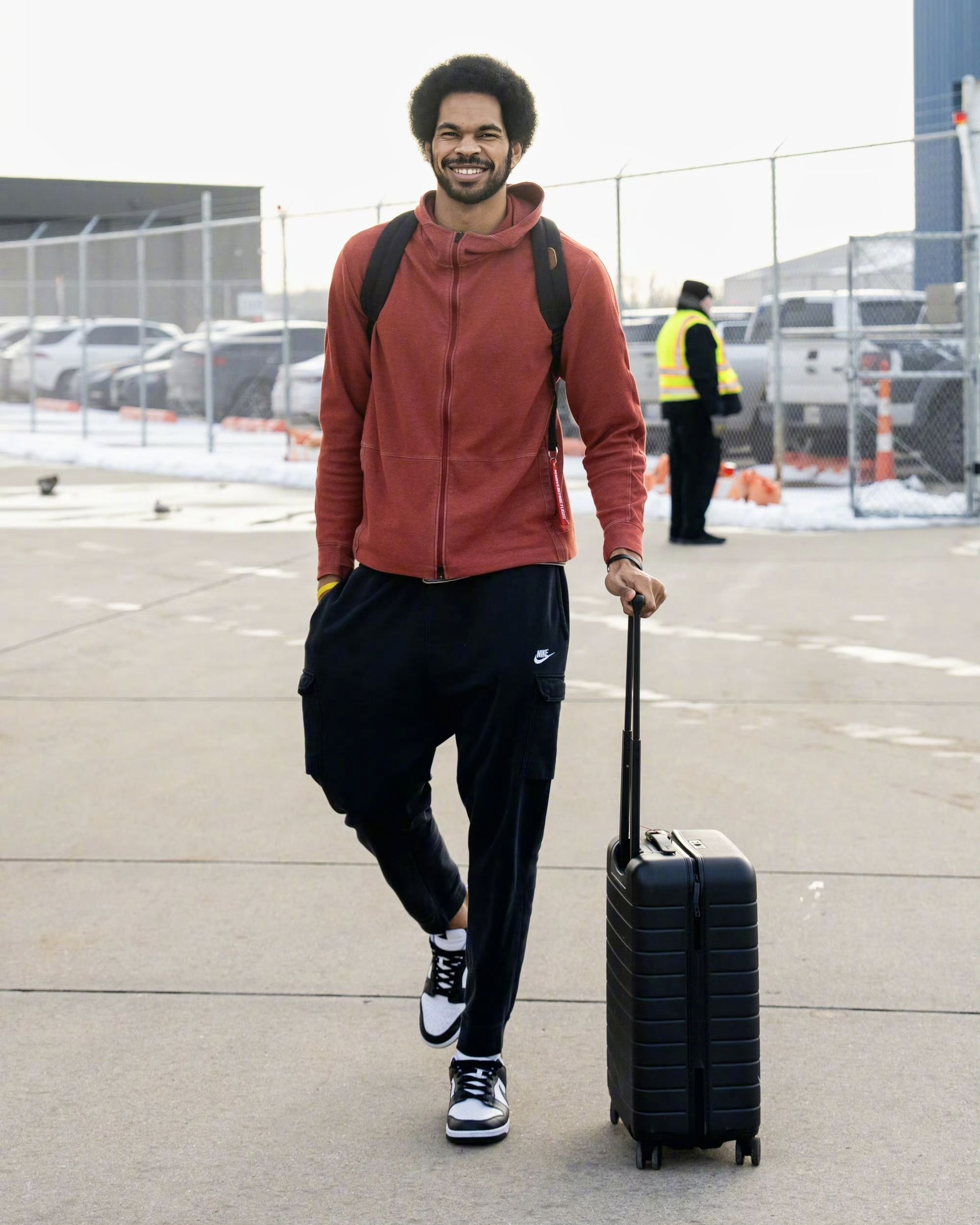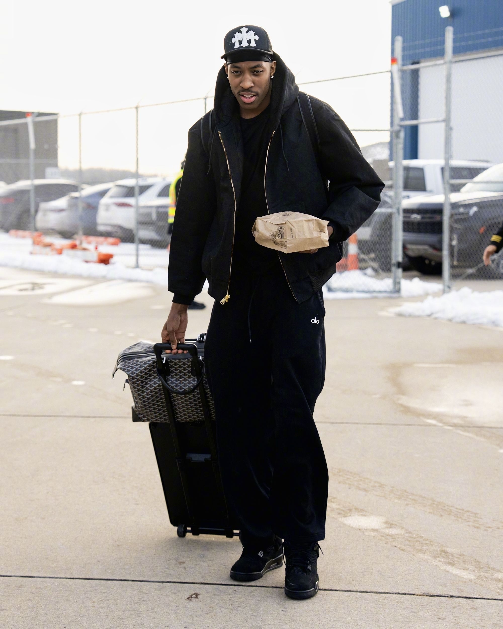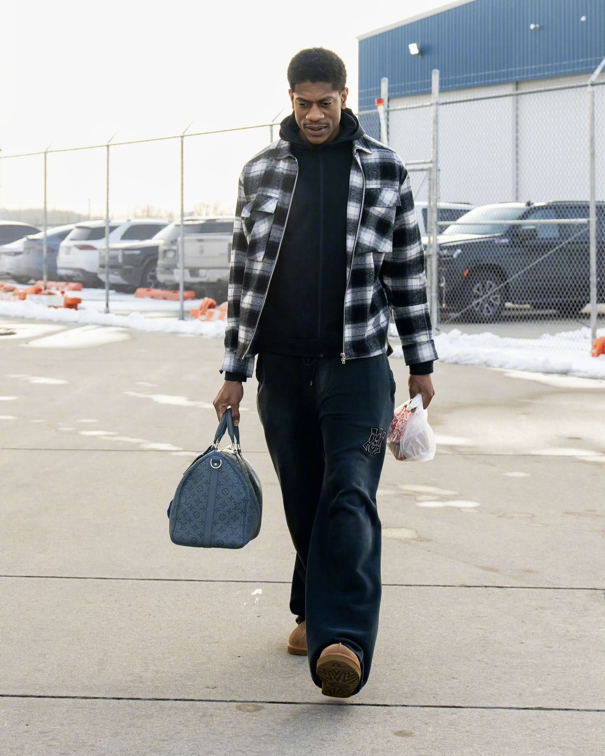 骑士队出征华盛顿的出行画面,能看到球队成员的私服搭配里,既有篮球装备的实用基因,也融入了当下的潮流风格,不同单品的组合也展现出各自的穿搭偏好。 首图里的球员上身LV拼色毛绒外套,搭配的棕色民族风刺绣拖鞋是近期街头穿搭的热门款,荧光绿的行李箱更是让整体造型多了几分视觉冲击力;乐福选择简约的灰色连帽卫衣配黑色运动裤,脚踩经典白色板鞋,走的是休闲舒适的基础款路线;贾勒特·阿伦则以酒红色拉链外套搭配黑...