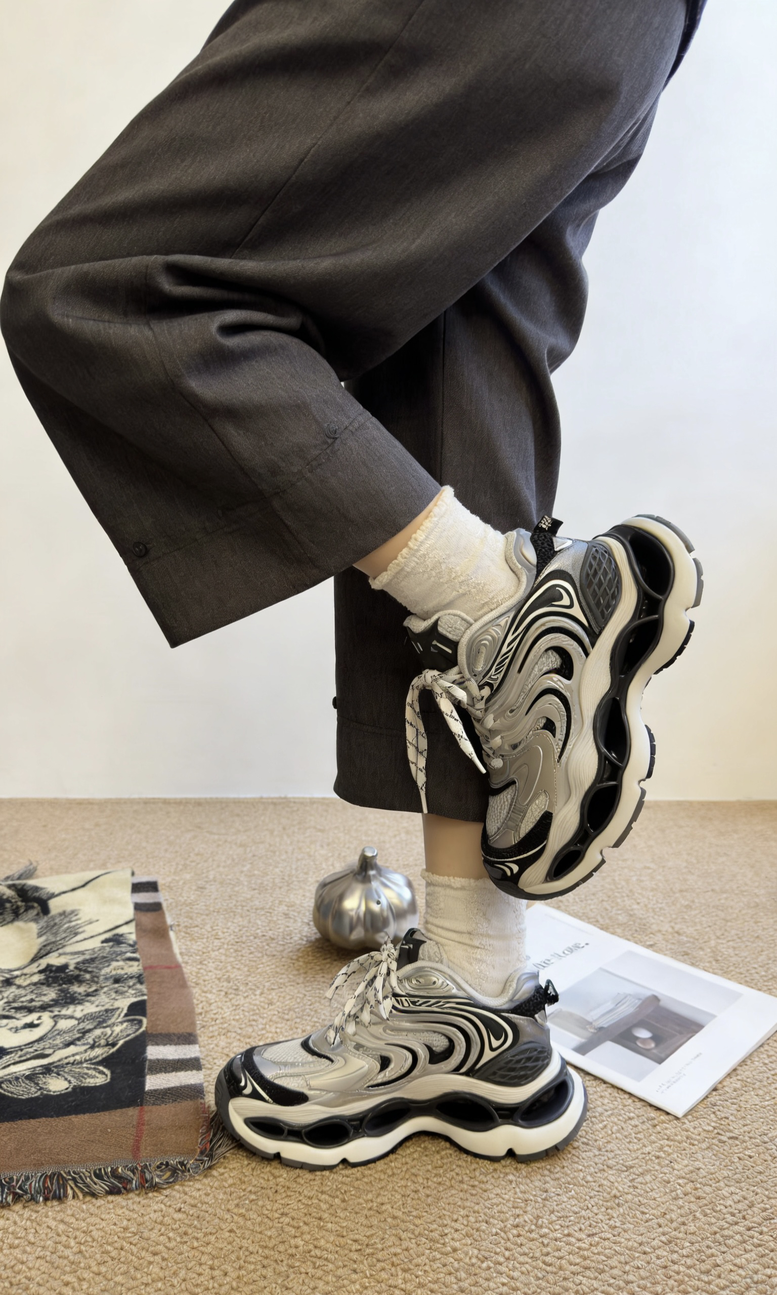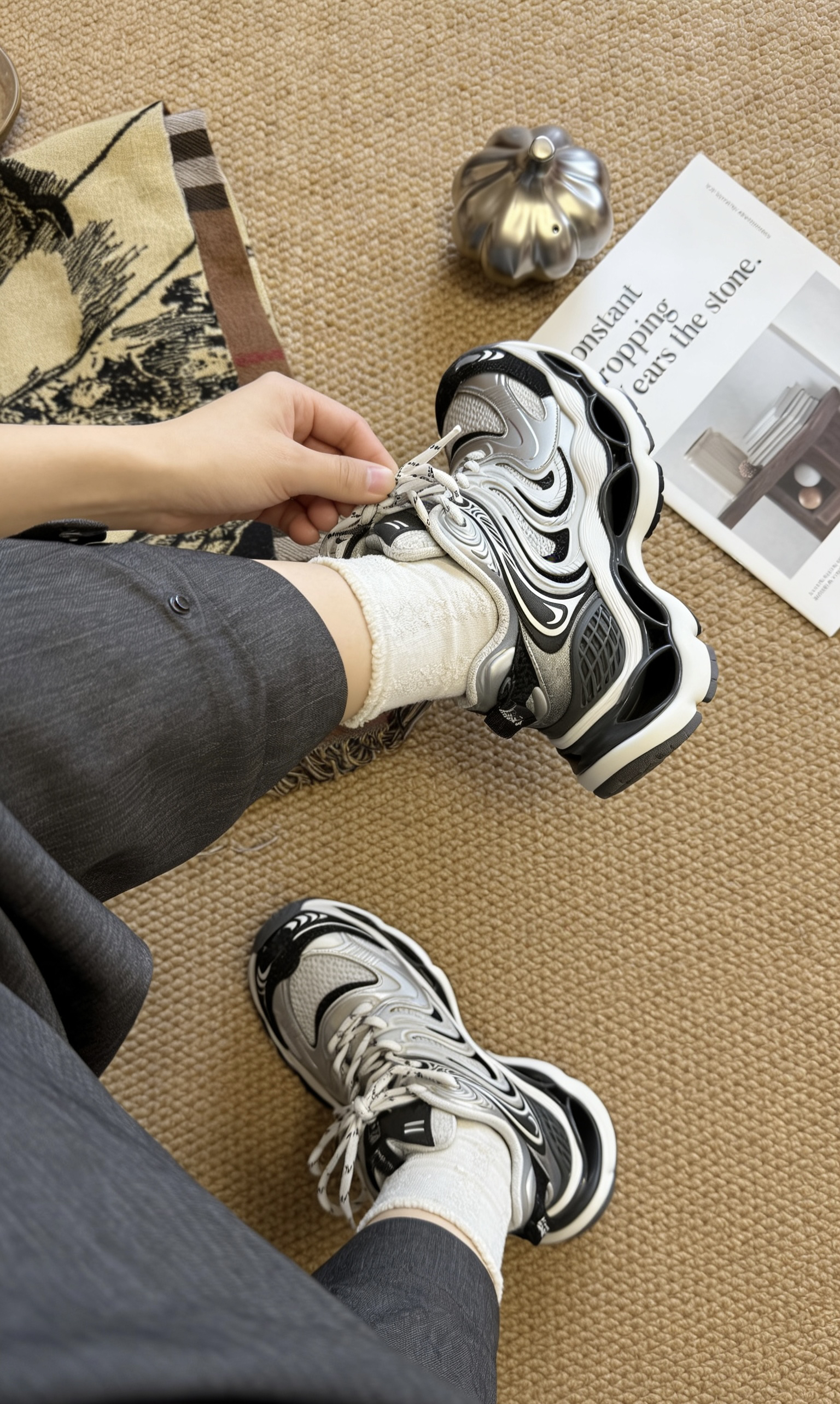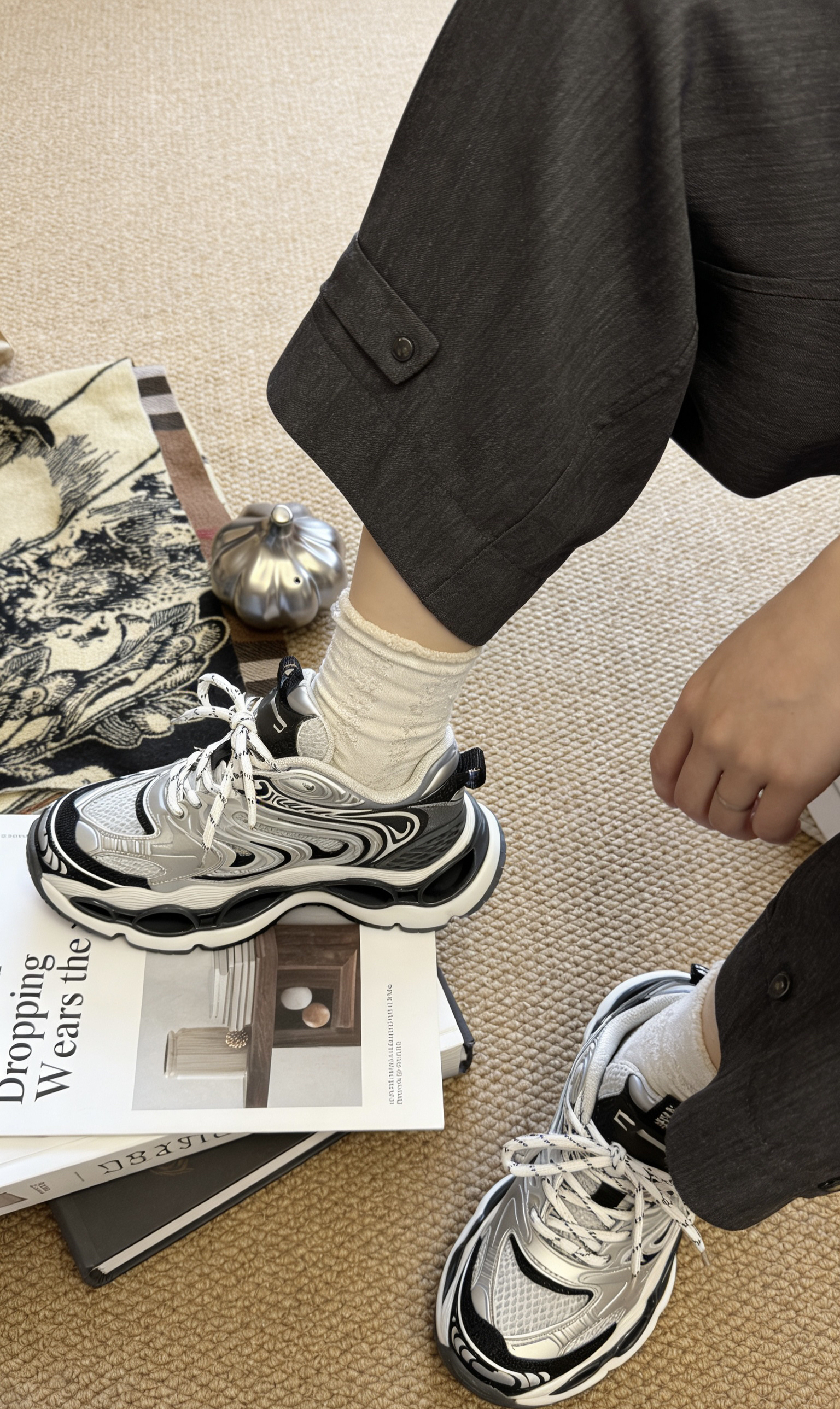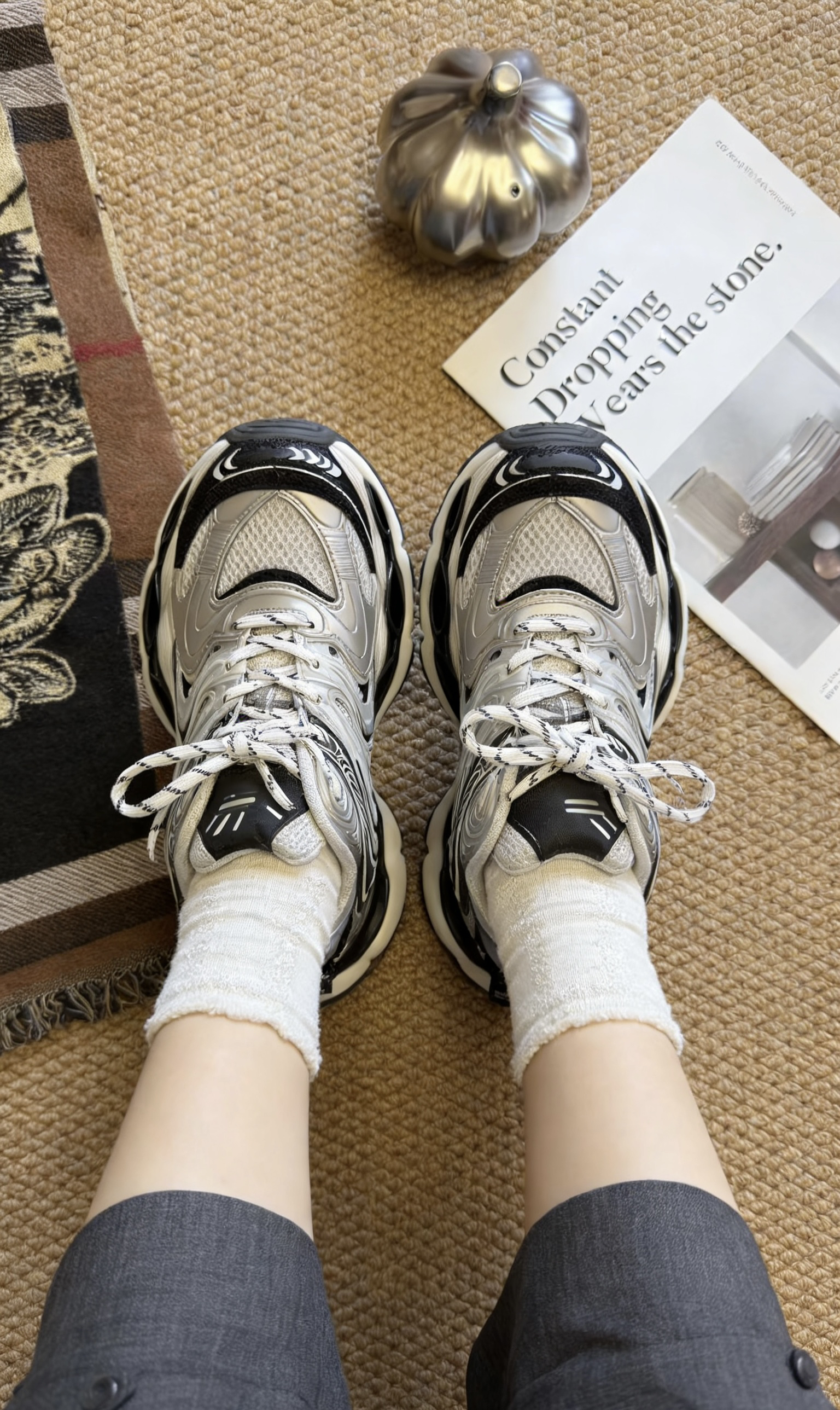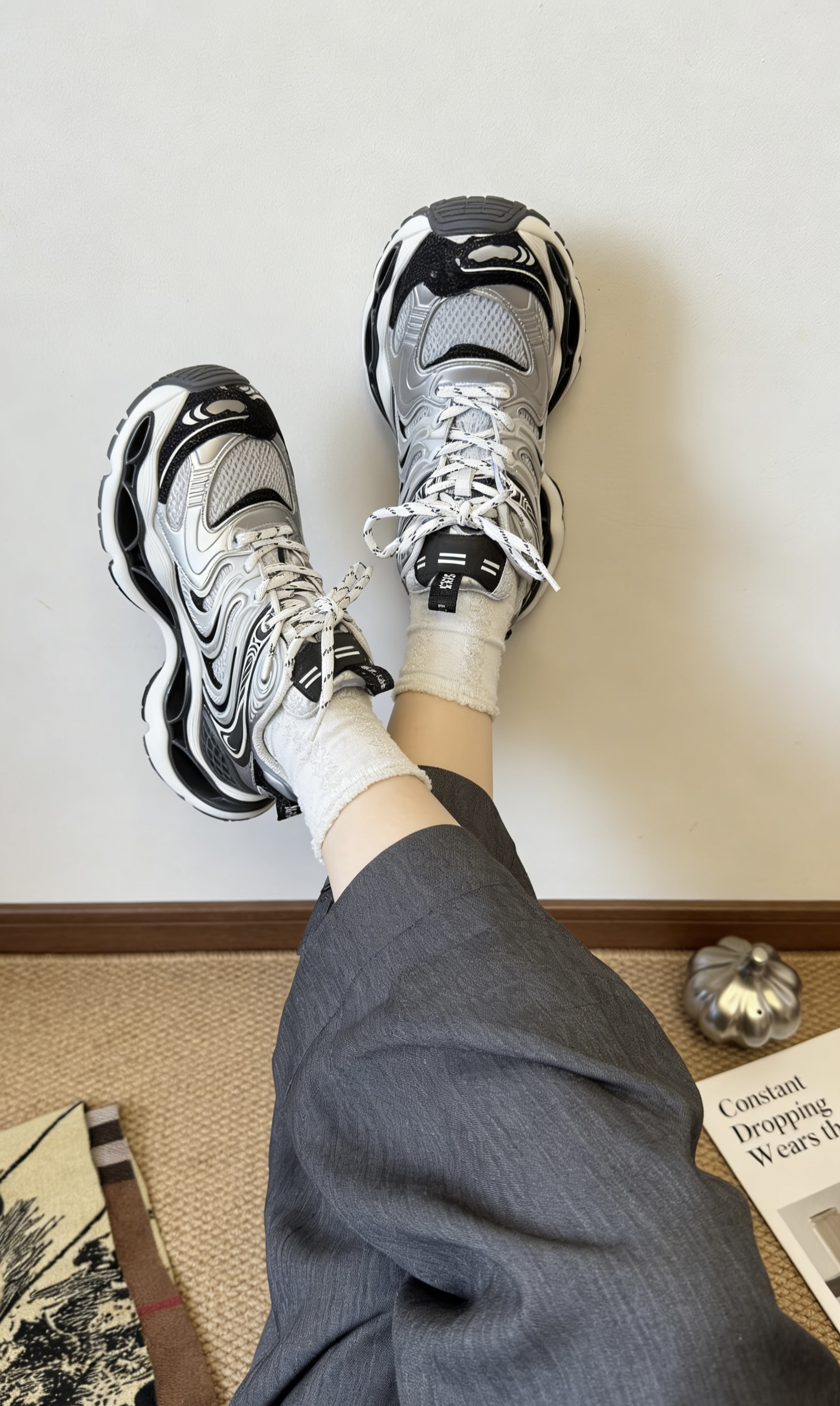 TIMESPEAK曜影系列老爹鞋,以欧美街头文化为魂,复古潮流为骨,演绎跨越时空的时尚张力。经典黑银配色自带高级滤镜,黑色鞋身沉稳大气,银色线条与细节拼接点亮造型,如同暗夜中的星光,低调却难掩锋芒,完美契合复古与未来感的双重审美。 鞋型复刻90年代经典老爹鞋轮廓,饱满流畅的线条搭配层次感拼接鞋面,将街头的随性与欧美风的酷飒拿捏得恰到好处,上脚即解锁松弛感穿搭。厚底设计暗藏5cm隐形增高buff,...