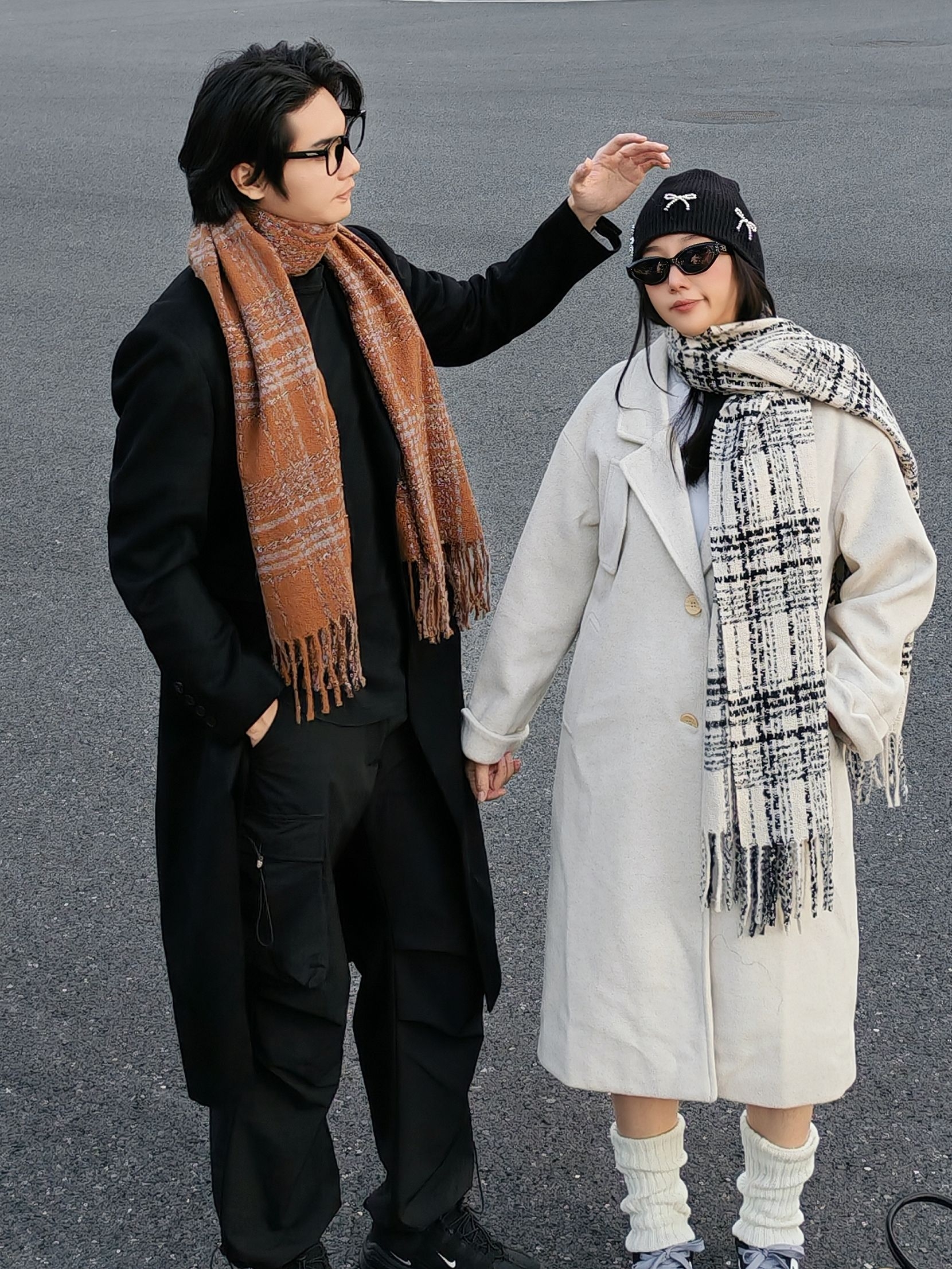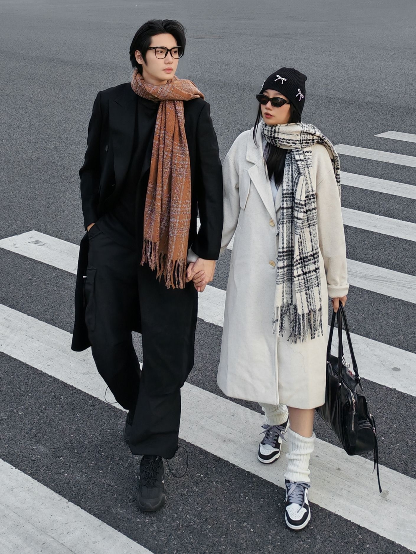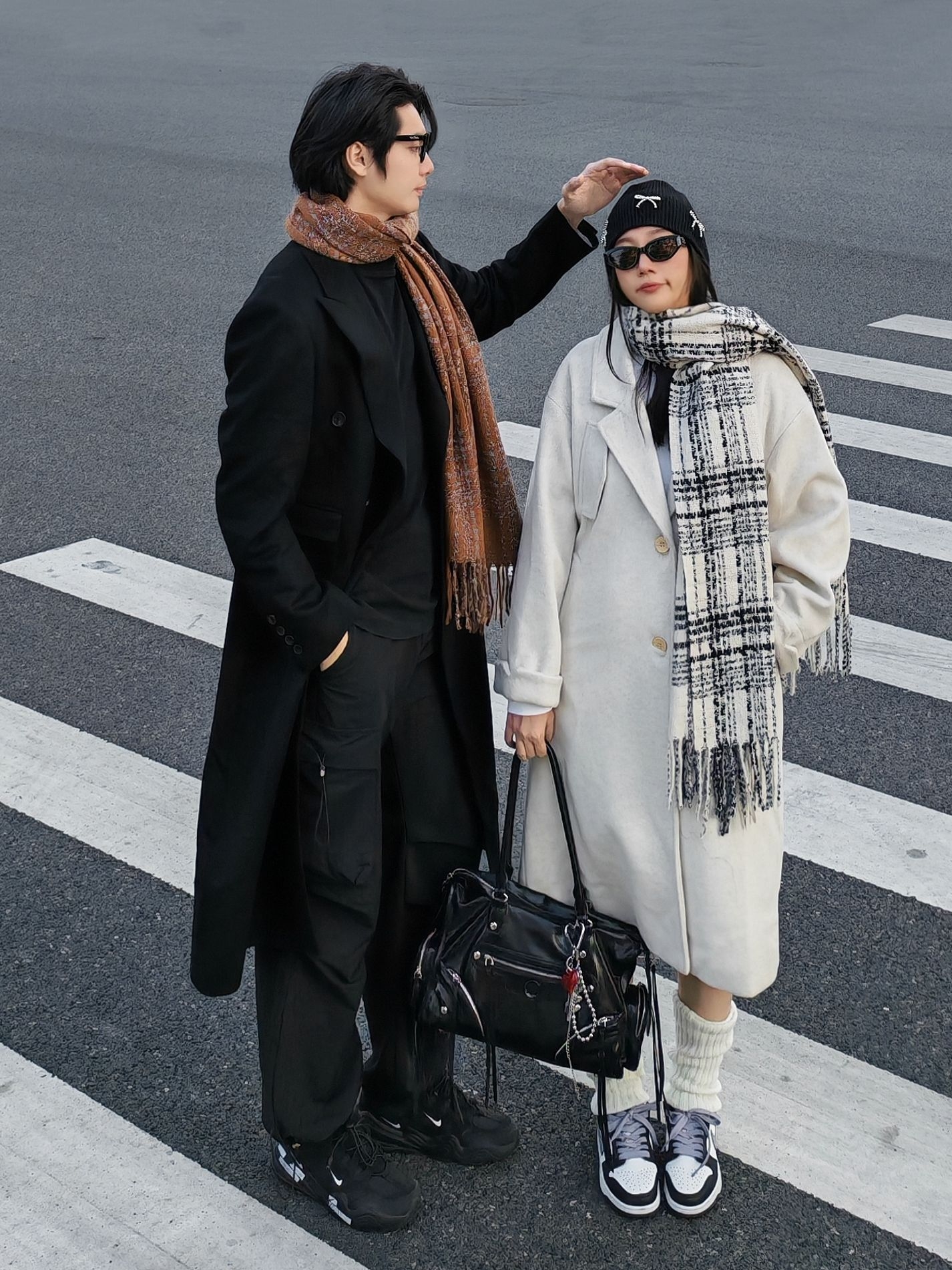 hi 这里是镭子的情侣穿搭分享 情侣出街这么穿太吸睛啦~ 男生全黑大衣配韩系简约流苏款围巾,清冷又温柔 女生米白大衣搭经典格纹围巾,和圣诞氛围超搭,黑白配色经典不出错~ 牵手走在街头,新年氛围感和情侣仪式感直接拉满