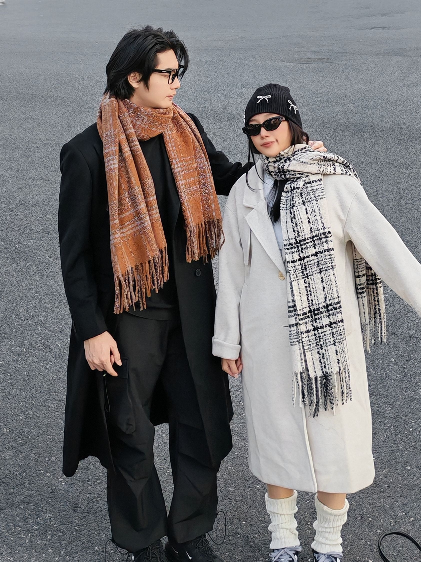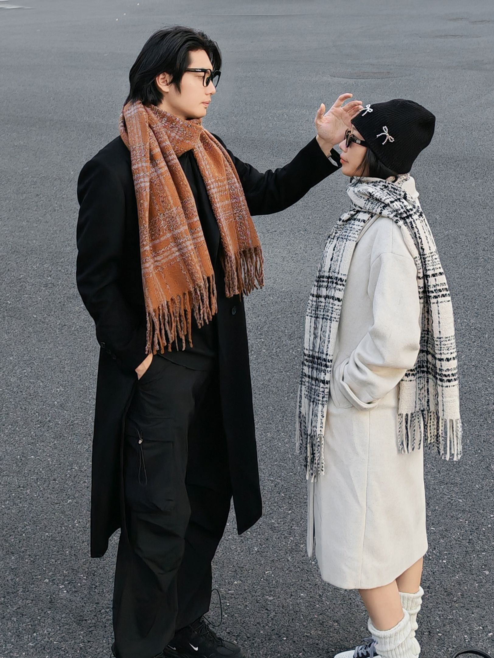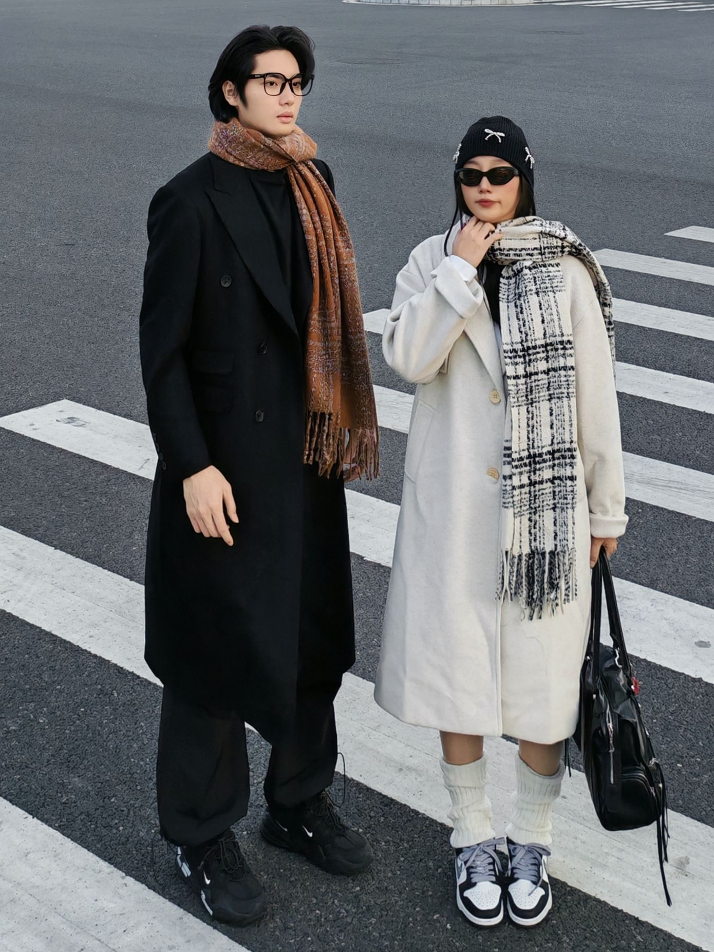 hi 这里是镭子的情侣穿搭分享 情侣出街这么穿太吸睛啦~ 男生全黑大衣配韩系简约流苏款围巾,清冷又温柔 女生米白大衣搭经典格纹围巾,和圣诞氛围超搭,黑白配色经典不出错~ 牵手走在街头,新年氛围感和情侣仪式感直接拉满