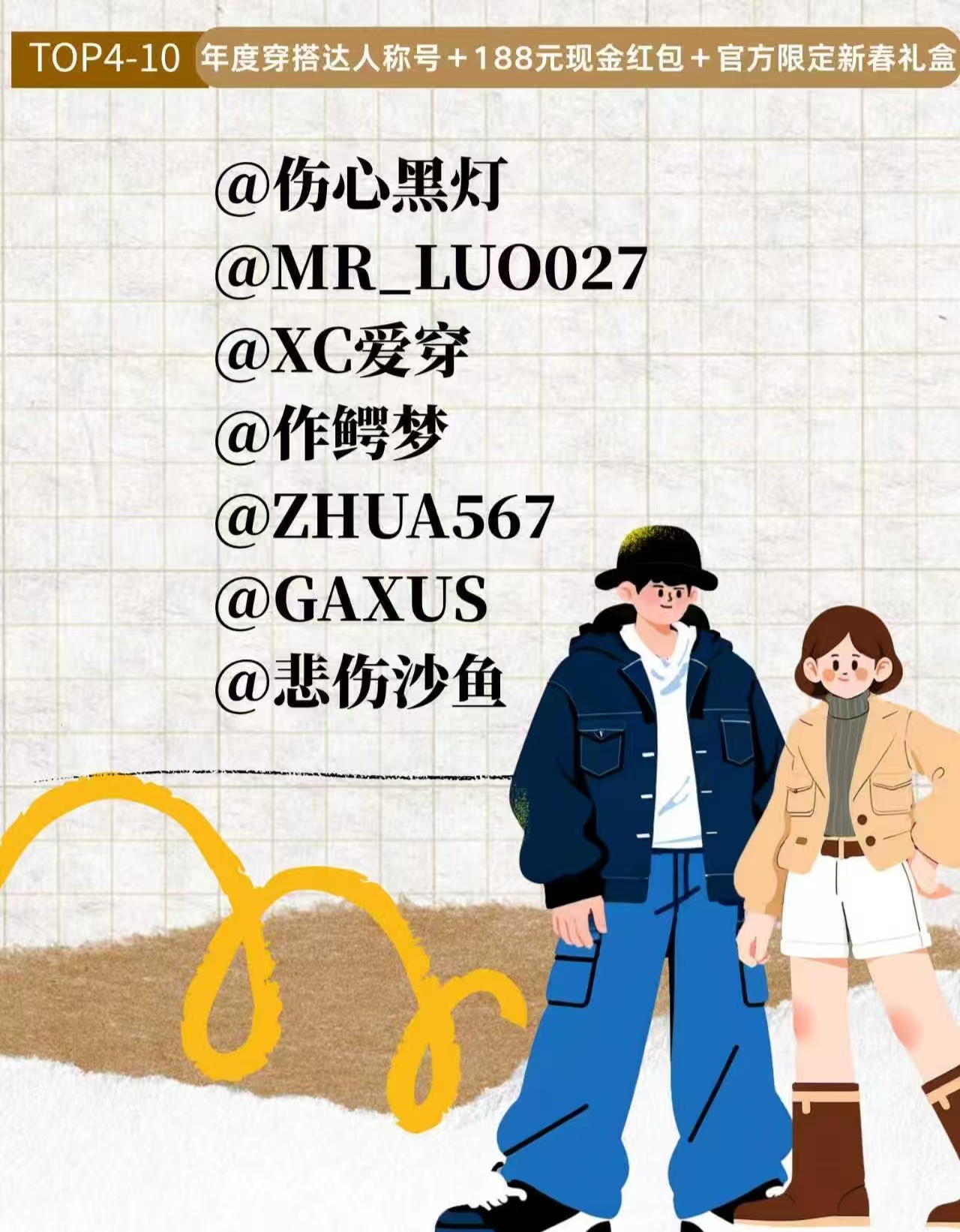 截至2025年12月31日 #年度穿搭关键词 话题活动已圆满结束,感谢所有达人的参与与支持,获奖结果新鲜出炉! 恭喜以下创作者! 【TOP1】年度穿搭达人称号+588元现金红包+官方限定新春礼盒 恭喜@小哇同学 【TOP2-3】年度穿搭达人称号+288元现金红包+官方限定新春礼盒 恭喜@小倪子911 @何嘎嘎丶 【TOP4-10】年度穿搭达人称号+188元现金红包+官方限定新春礼盒 恭喜@伤...