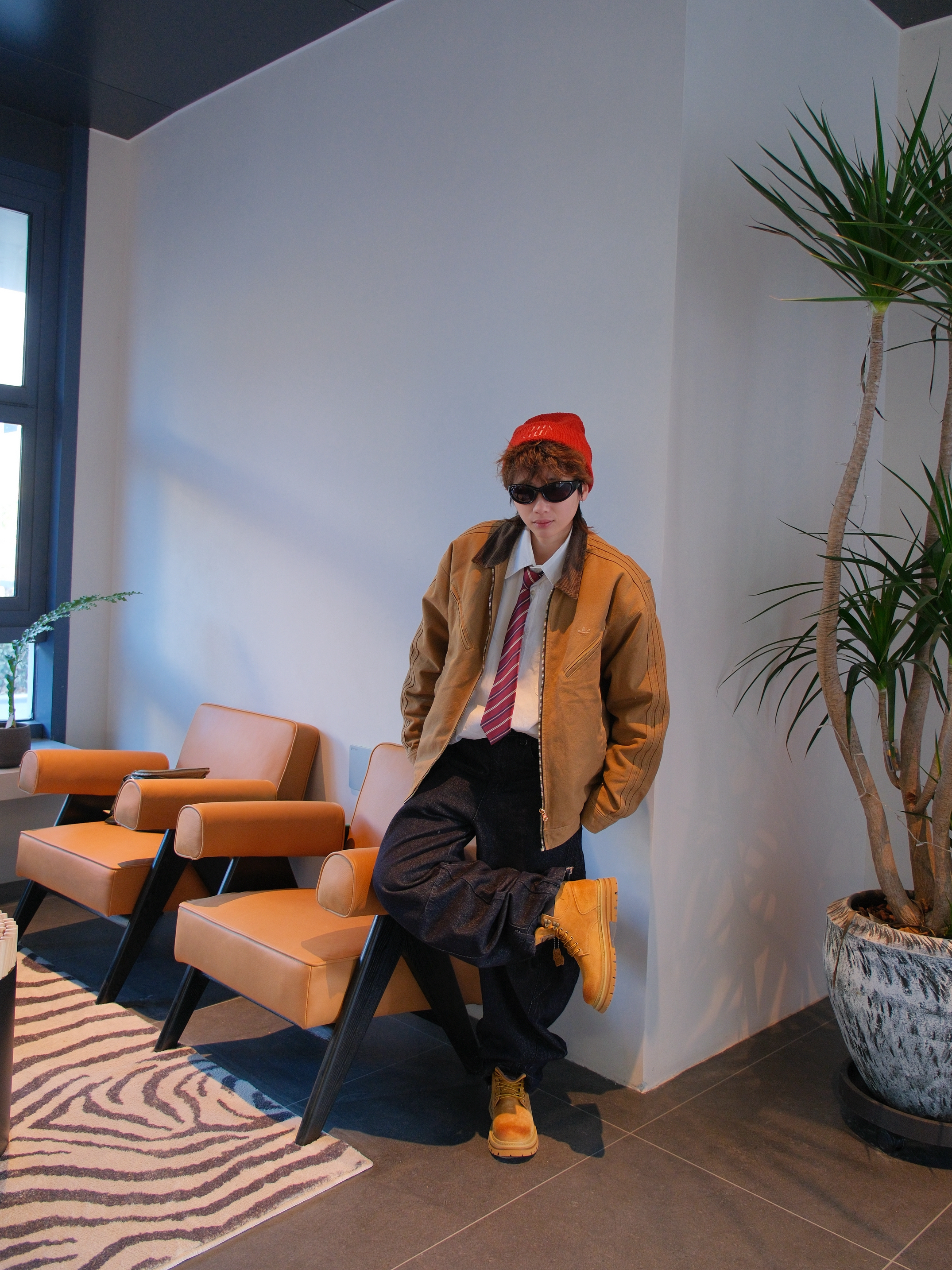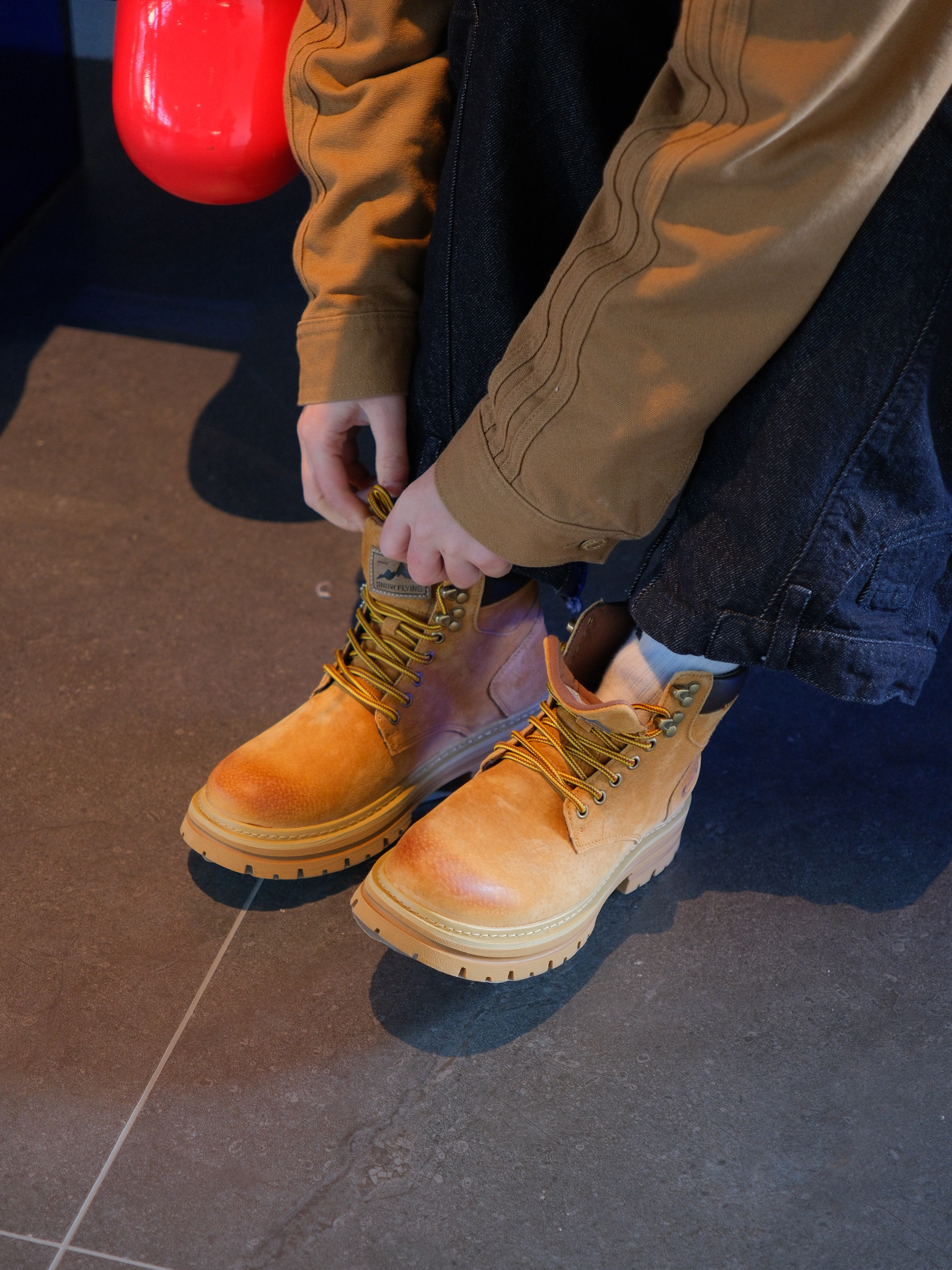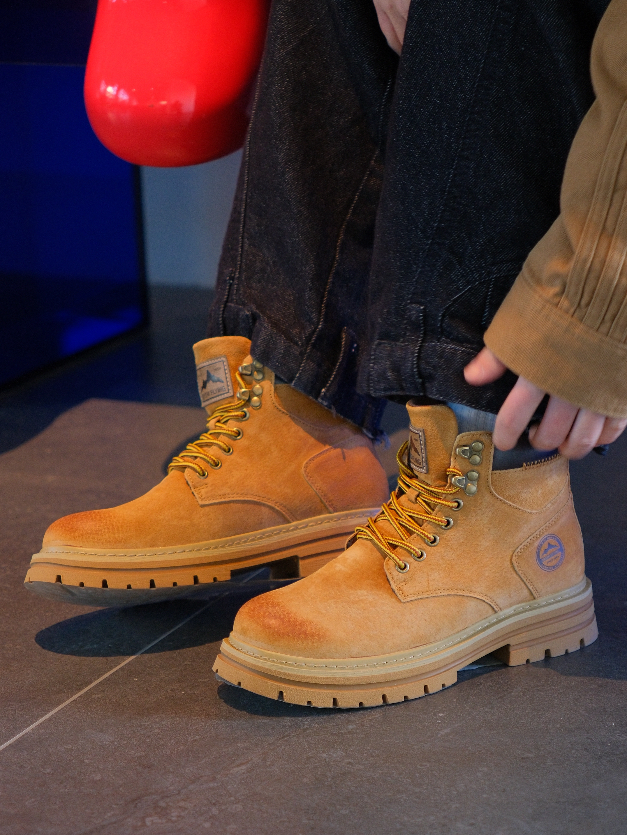 今天用大黄靴搭一套复古工装风 上身是Adidas的棕色夹克 有点vintage的复古味 内搭白色衬衫➕红色条纹领带 下面搭配深色牛仔裤 再来一双雪中飞的大黄靴 上脚很轻,增高大概4cm左右 鞋头做了焦糖渐变,潮流属性up