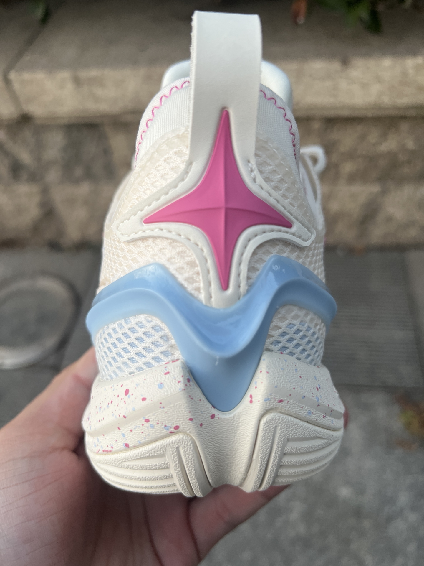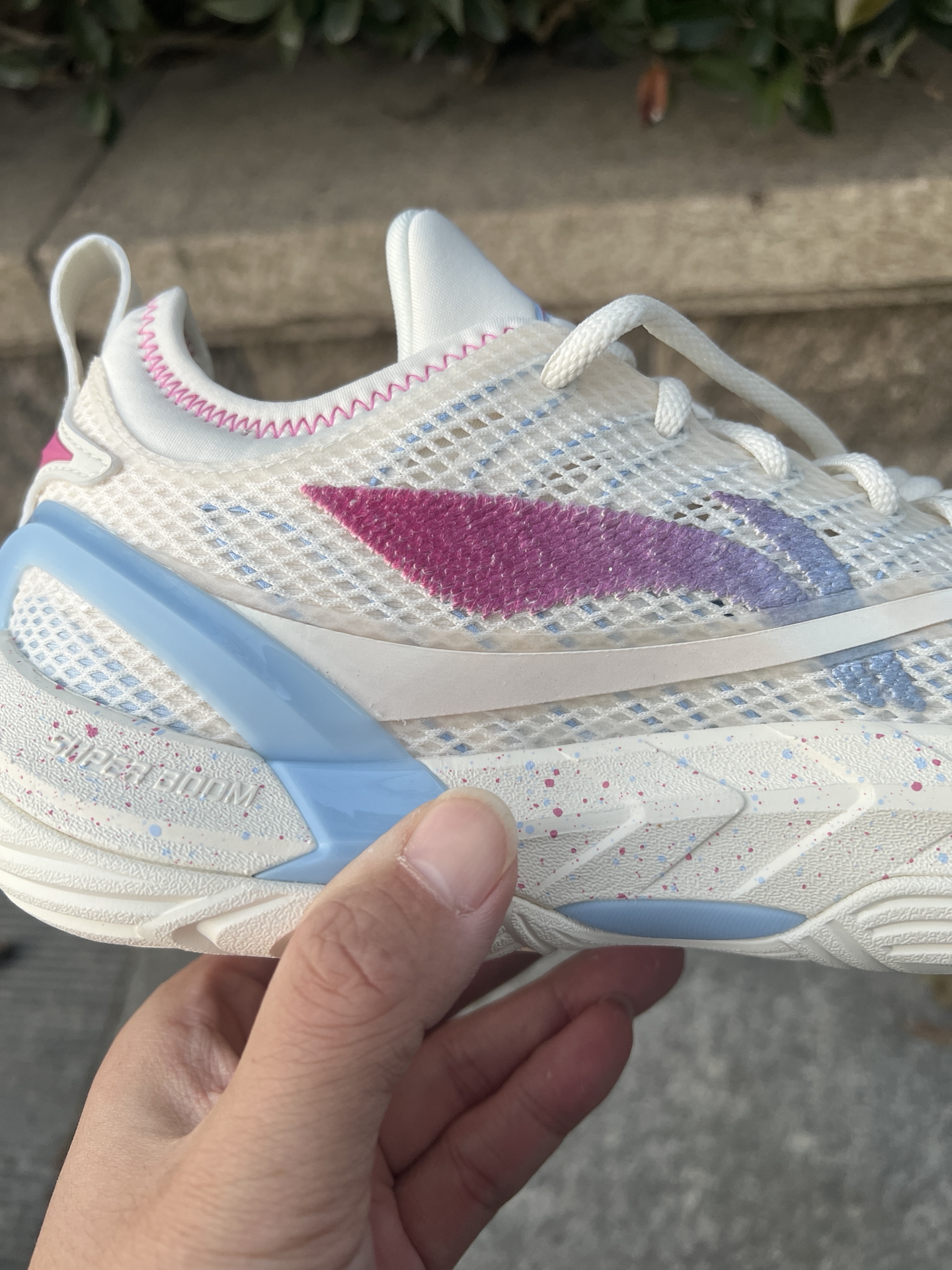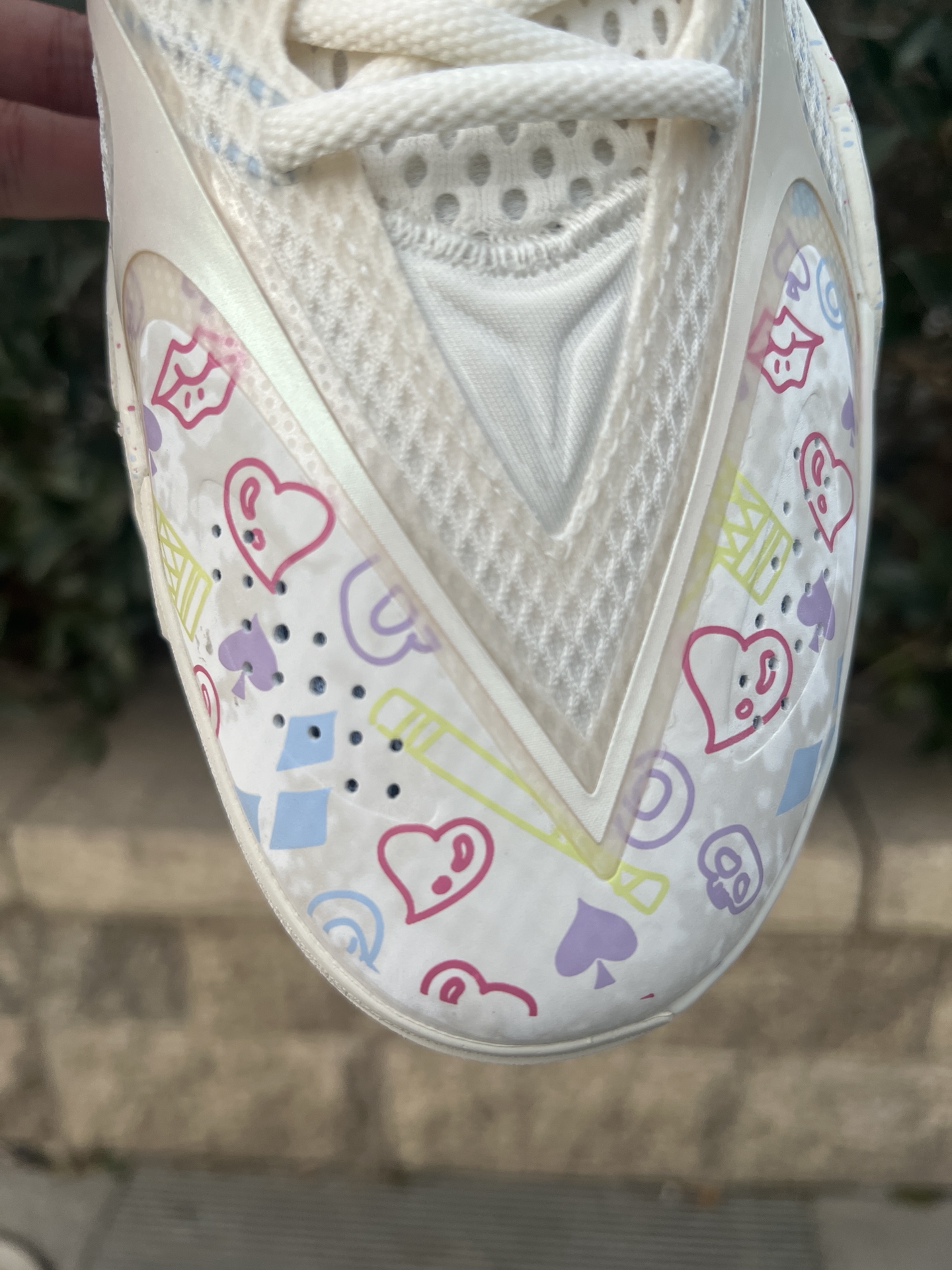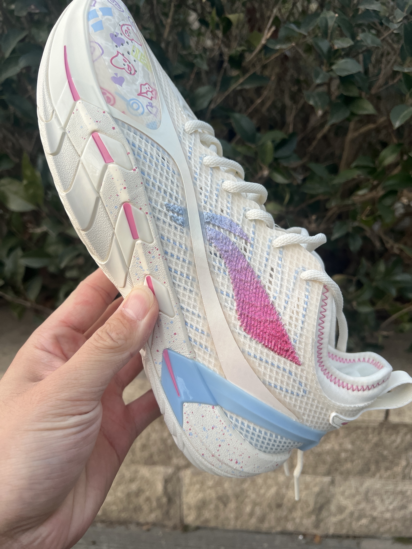 #2025年度鞋王 #2025年度好东西 @创作课代表 游击2super 白蓝,都叫这双小丑女,鞋面上扑克爱心等涂鸦元素,大面积白色加蓝粉色给人的感觉很清爽,上脚颜值很好看,配置上,内嵌超䨻的中底,回弹感受还是很明显的,不过还是偏韧的脚感,在你发力那一下给到的反馈也比较直接。外底最大的特色就是来自他的新科技DBR超耐磨稀土橡胶,血槽非常厚,在耐磨和抓地方面我觉得都非常不错