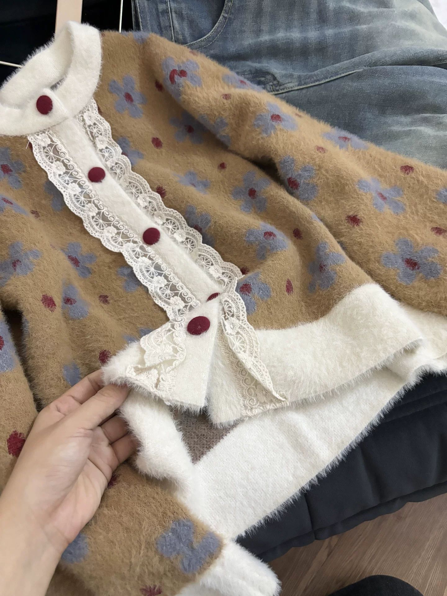 秋冬的衣柜里,总缺一件既软糯又有氛围感的针织开衫,而这件焦糖色碎花款,直接把温柔与复古焊在了身上! 采用仿水貂毛的软糯面料,上手是云朵般的触感,贴身穿也丝毫没有扎肤感,秋冬单穿或内搭都能锁住暖意。经典的焦糖底色,搭配灰蓝与酒红的碎花图案,复古腔调瞬间拉满,不会过分甜腻,反而多了几分法式慵懒的韵味。 领口、门襟与下摆的米白色毛绒拼接,再配上精致的蕾丝花边和酒红色纽扣,细节处尽显温柔小心机,让...