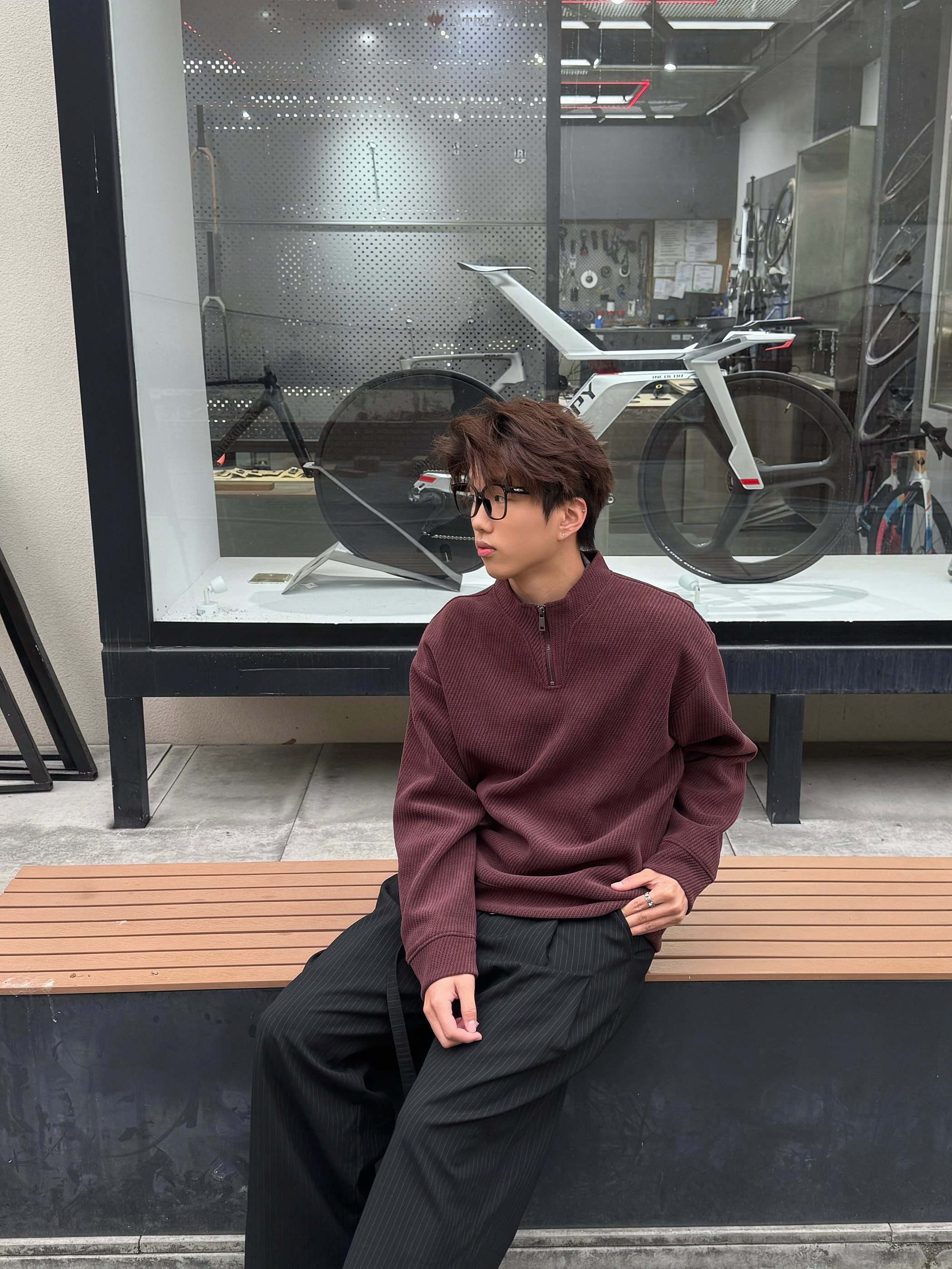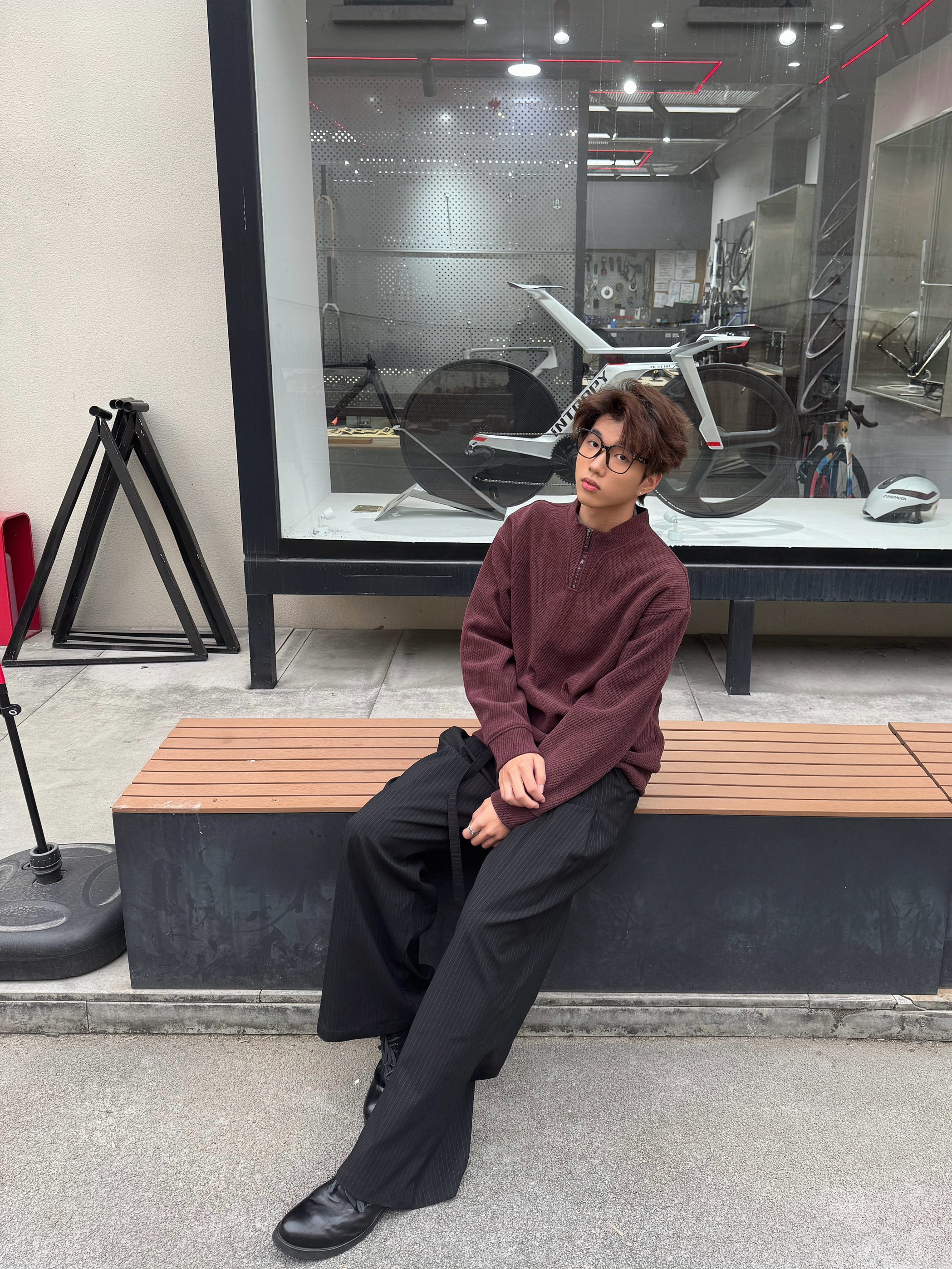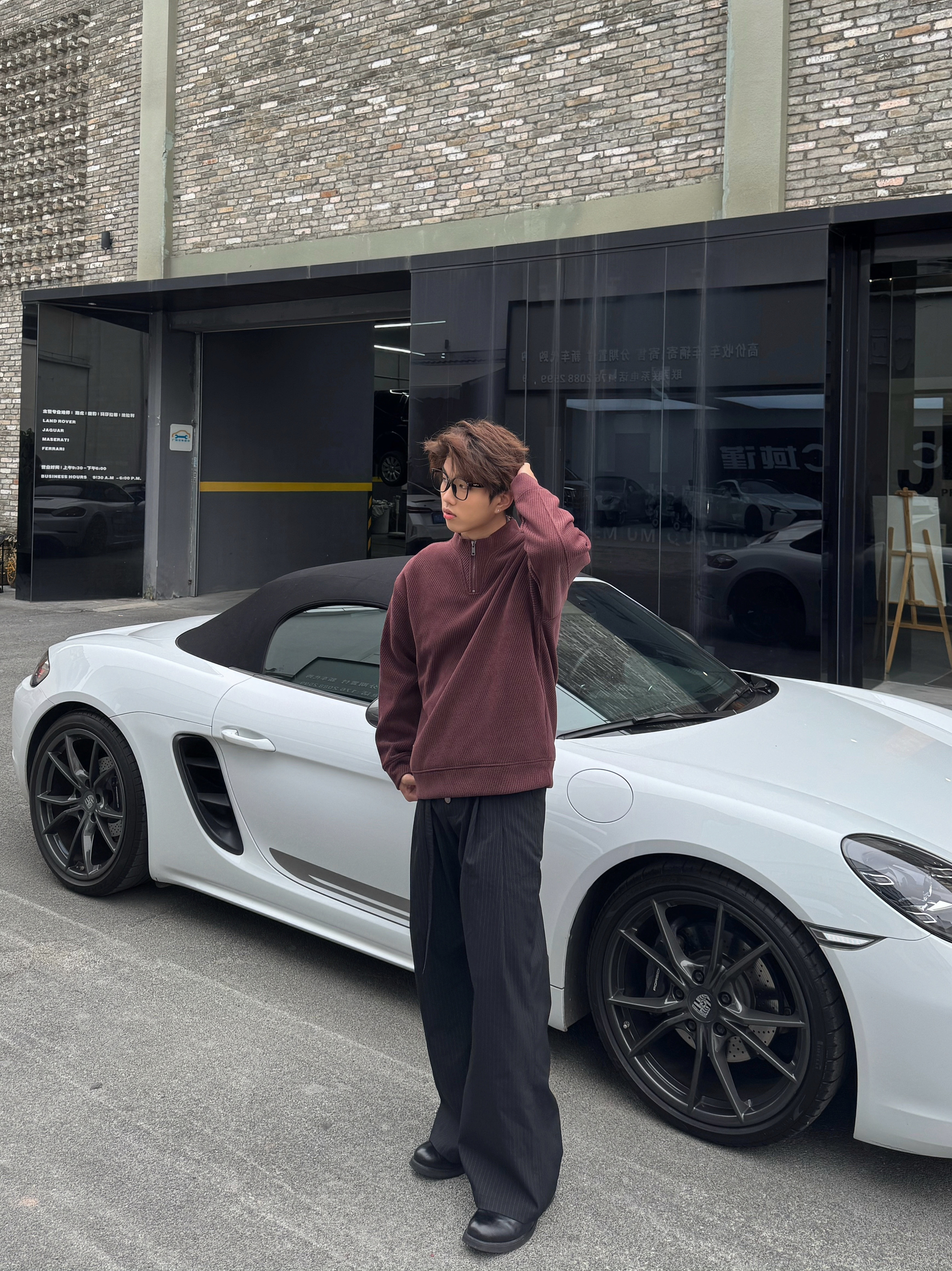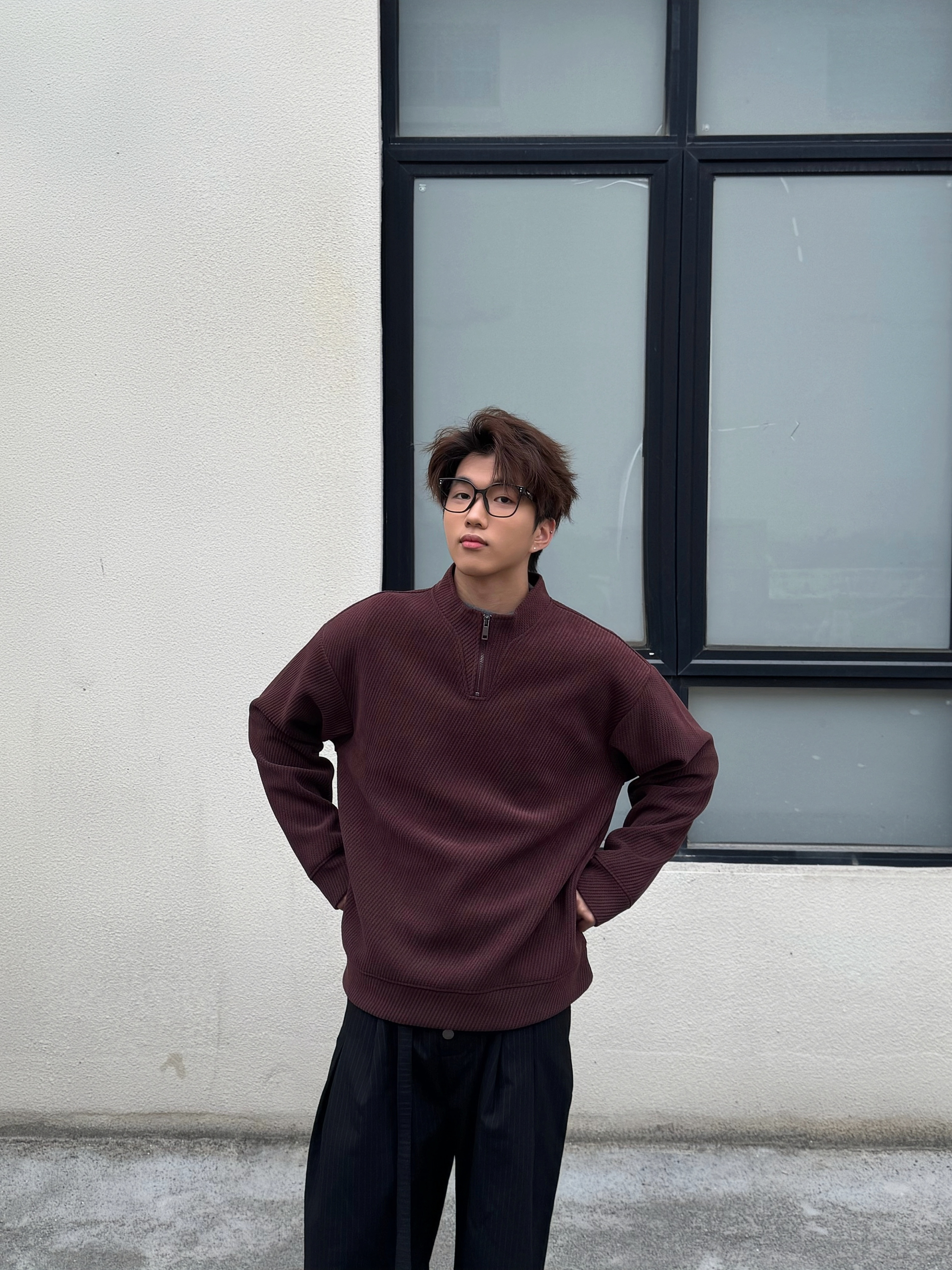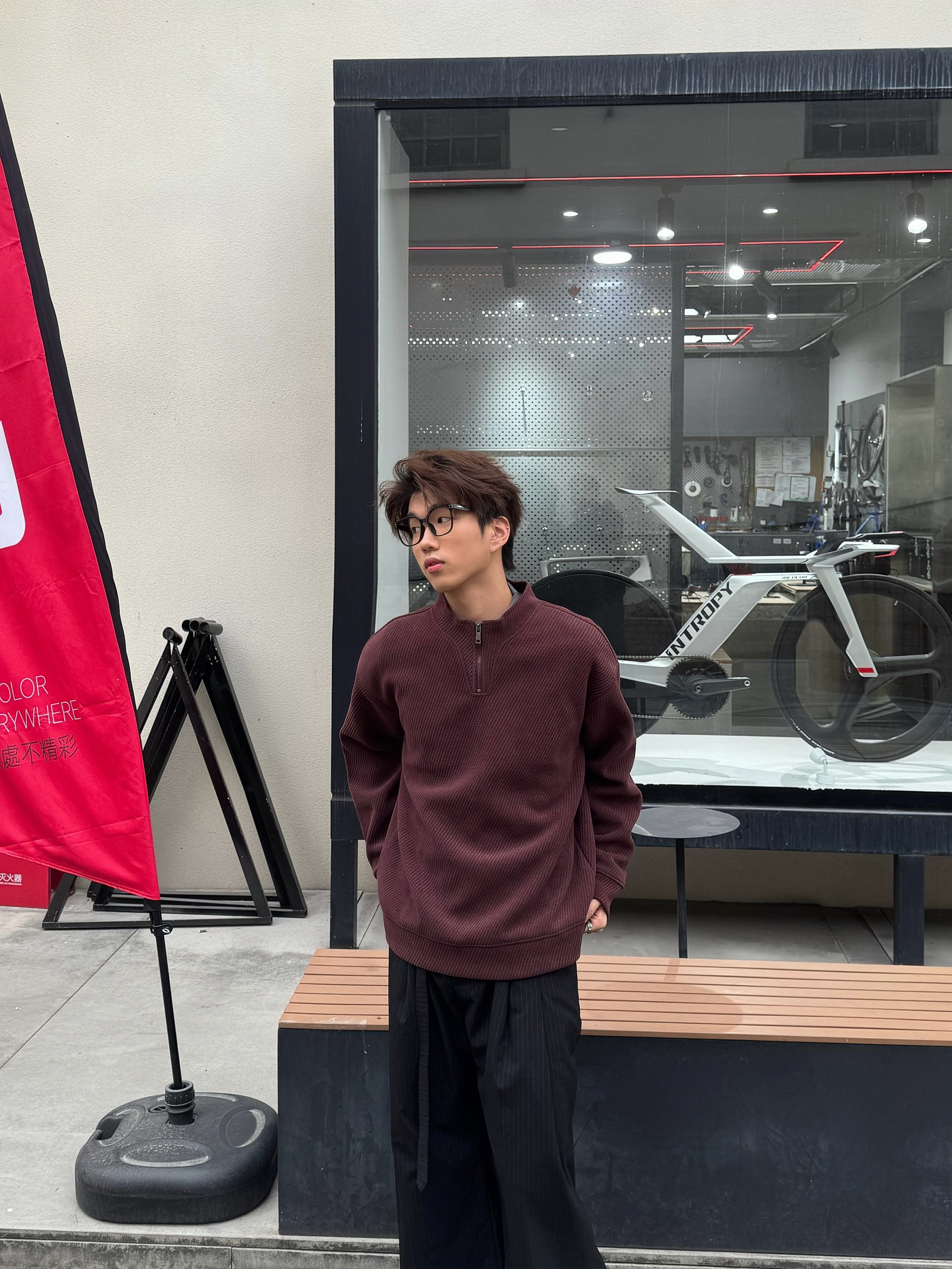 深焦糖色半拉链针织衫太戳我了,竖坑条纹理自带质感,宽松版型藏肉又慵懒。搭配黑色竖纹阔腿裤,垂坠感拉满还显腿长,踩一双黑色乐福鞋,简约又有腔调,日常出街随便拍都很出片~