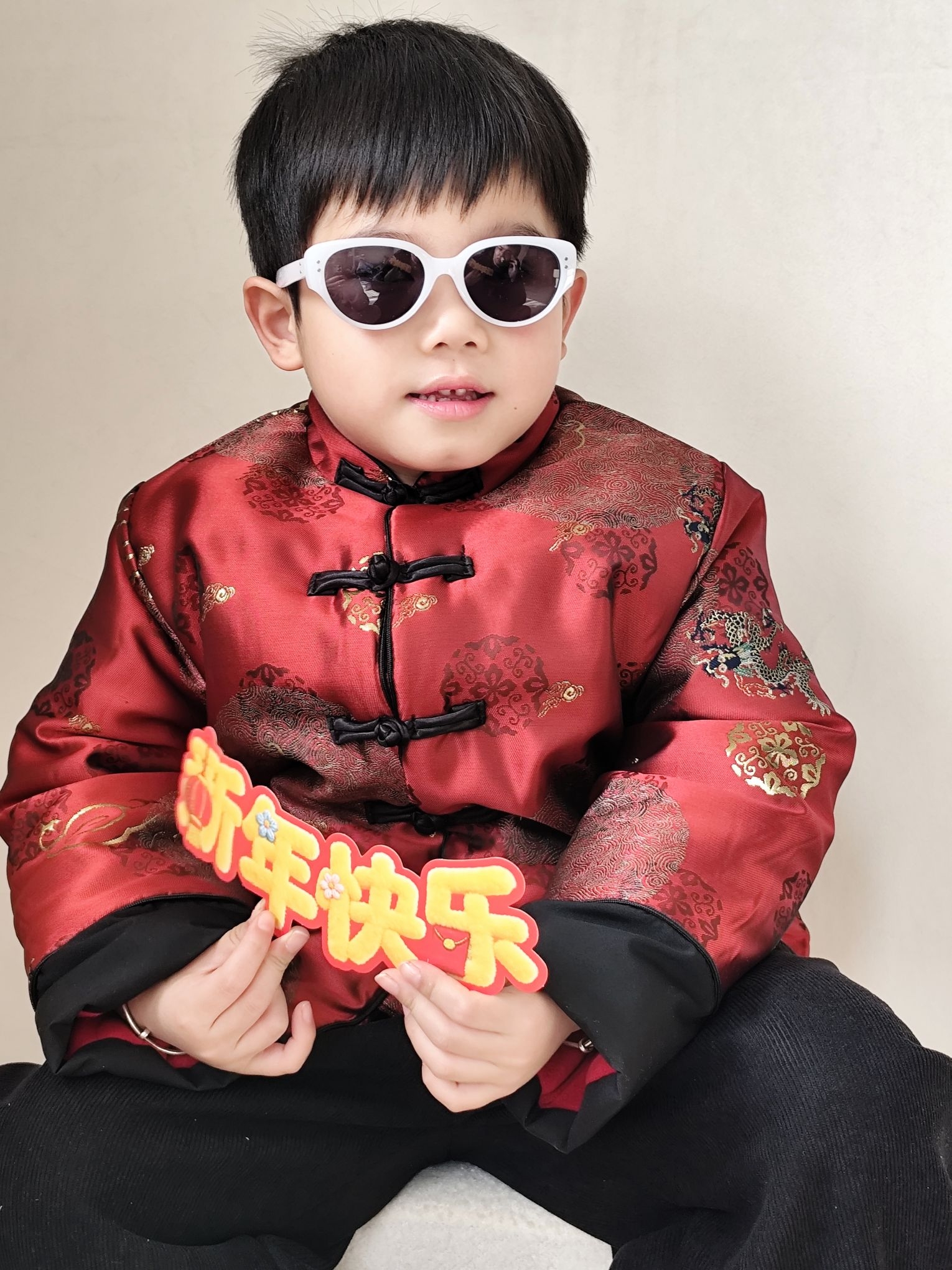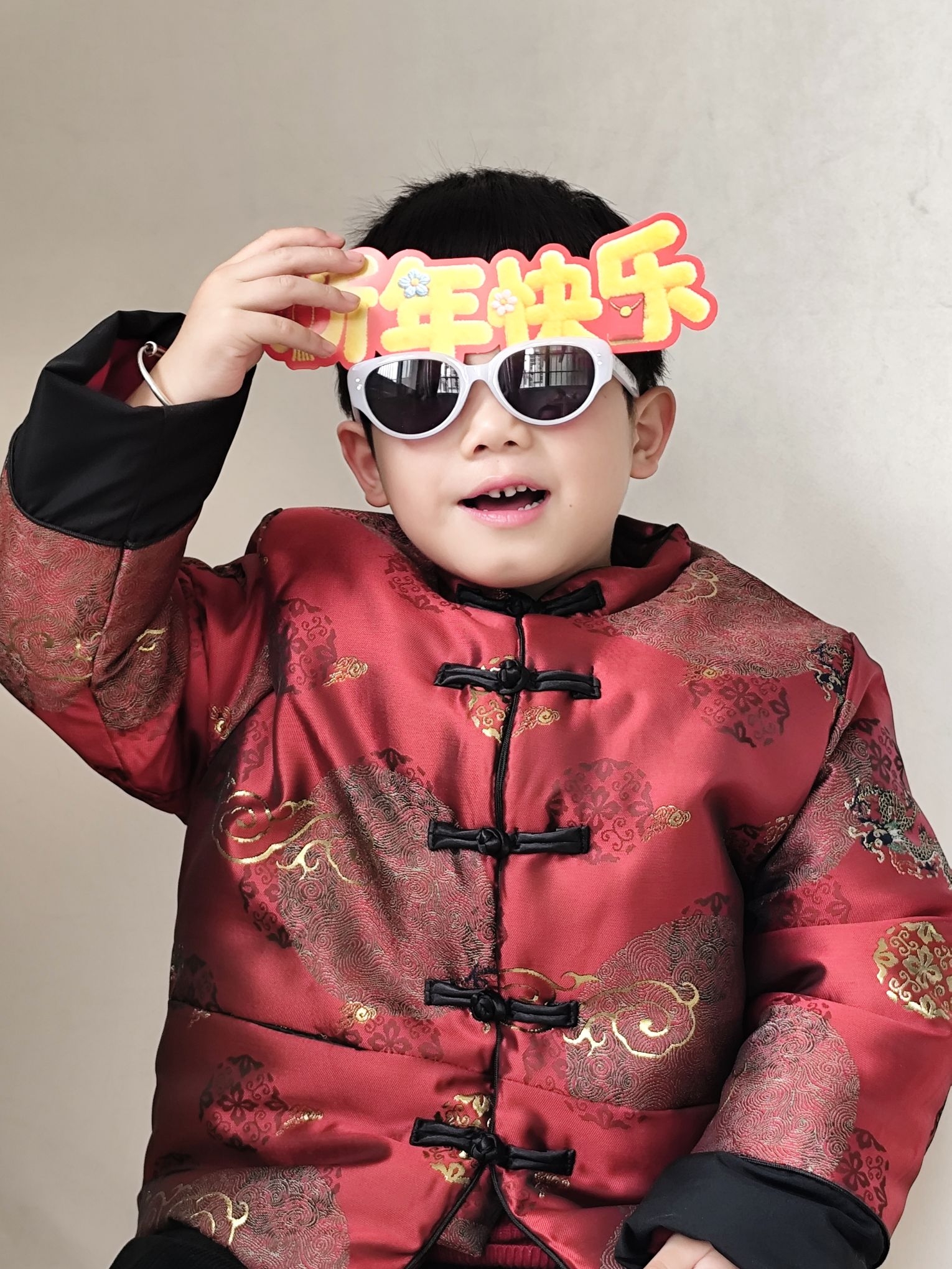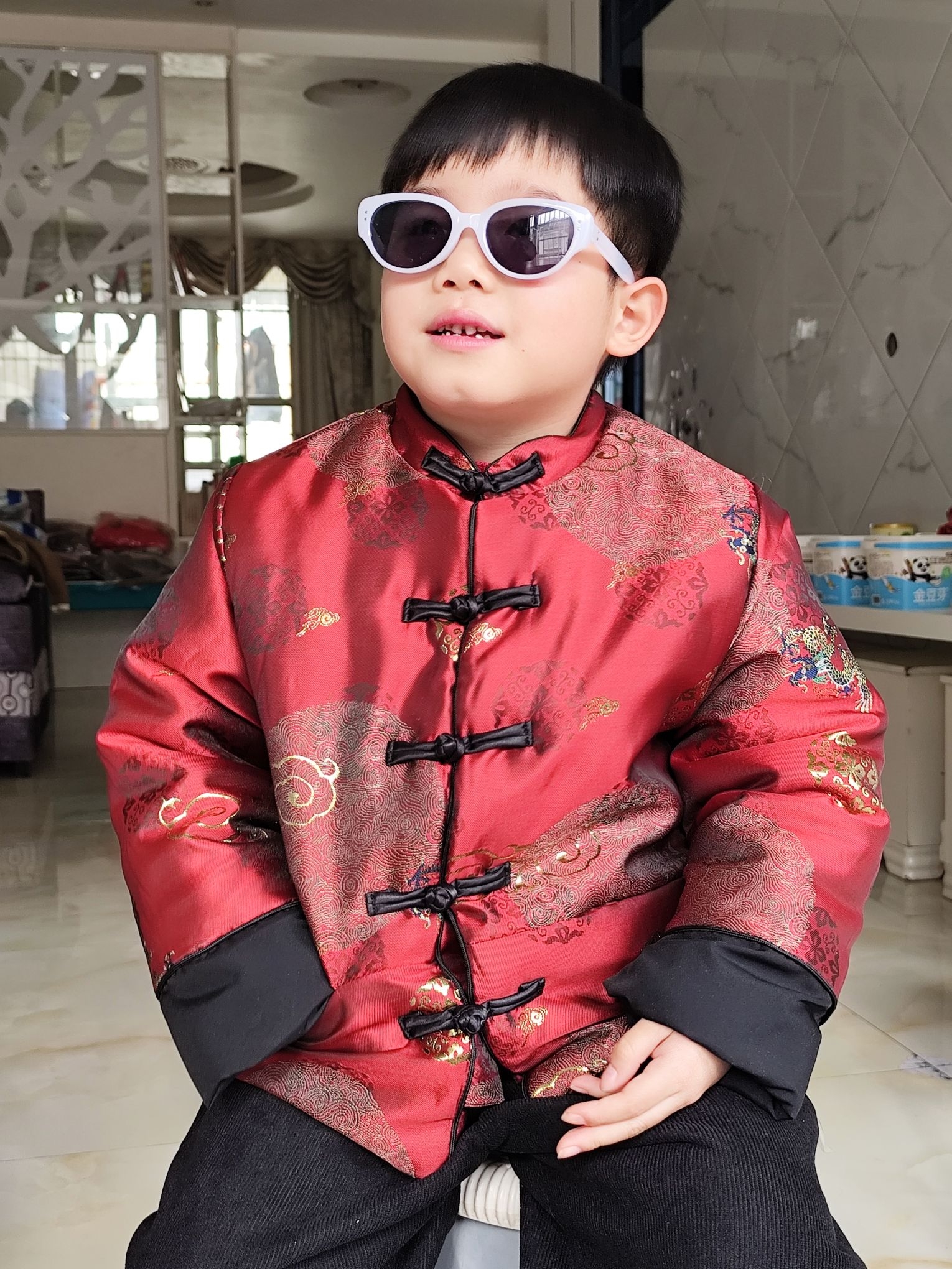 家有男宝的姐妹,新年拜年服我终于挖到心头好了😁!给宸宝入的这套红色唐装也太绝了,❤️❤️面料是有质感的提花缎面,摸起来滑溜溜的还不容易皱,夹棉的内里超厚实,北方过年穿也不怕冷~盘扣设计很精致,搭配黑色灯芯绒裤子中和了唐装的正式感,再踩一双小白鞋,潮酷又有年味,娃穿上直接变身拜年小少爷! 关键是性价比真的高,百元价位能买到这种做工和质感,比实体店划算太多,洗了一次也没掉色没起球,宝妈们闭眼冲这套新...