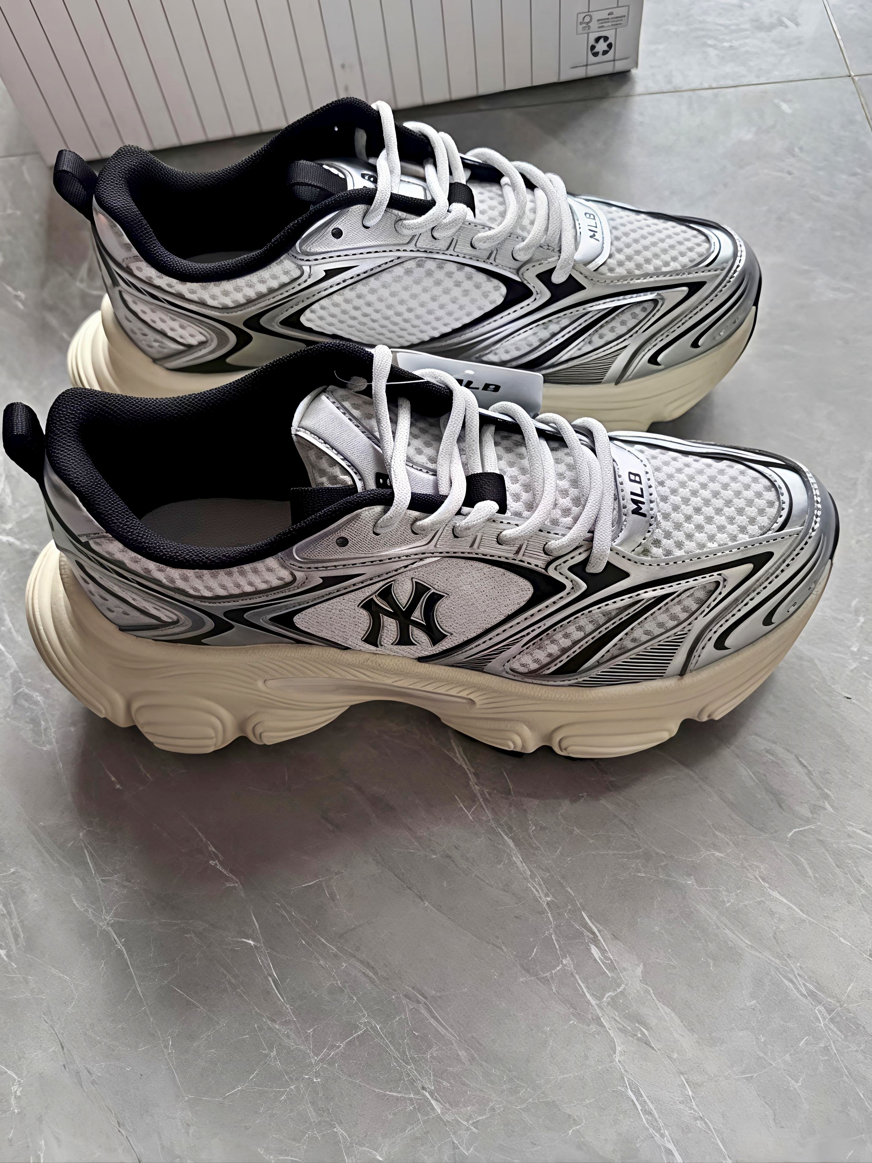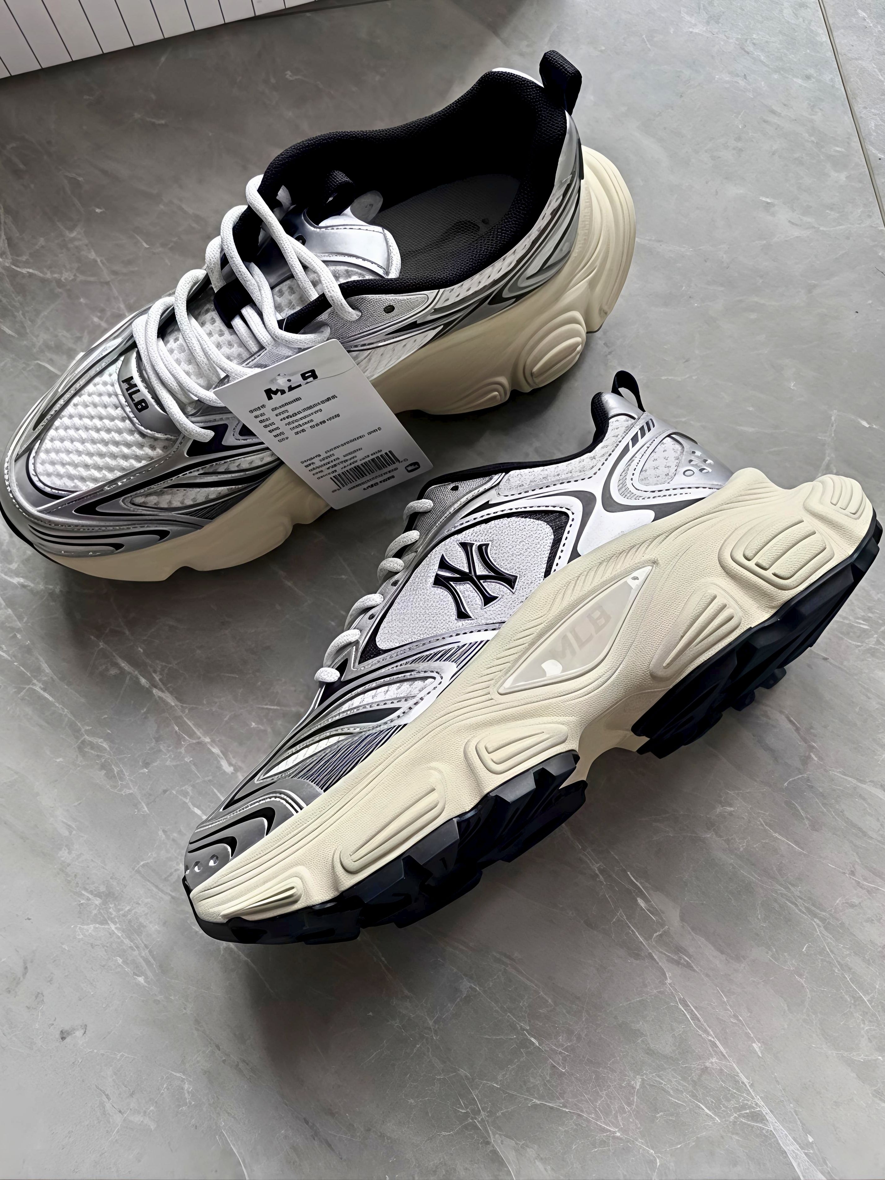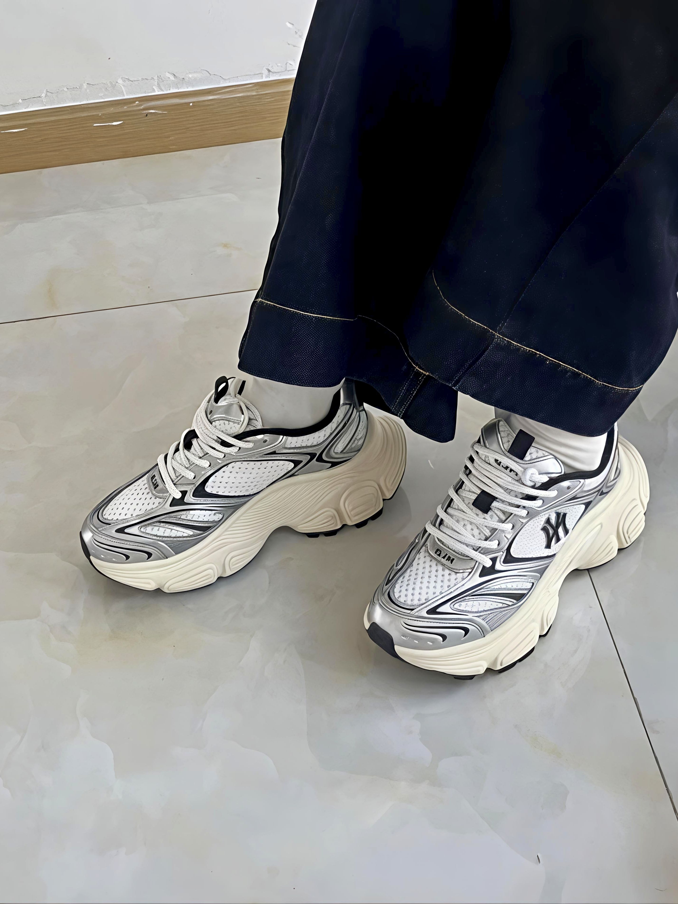 谁懂啊家人们!刚拆箱的MLB银灰色老爹鞋直接美到我心坎里🥹 银白拼色的设计超有未来感,鞋身的流线型纹路搭配亮面银饰,灯光下晃一眼都闪着光,鞋侧的NY标低调又有辨识度,完全不会撞款~上脚试了下,厚底直接给我增高5cm,秒变大长腿的快乐谁能拒绝!👖配阔腿裤巨显腿细,搭运动裙也很有活力,走了半天脚感还超软,鞋垫踩上去糯叽叽的,完全没有硬邦邦的磨脚感。鞋面包裹性也很好,不会有空荡荡的感觉,网面材质看着就透...