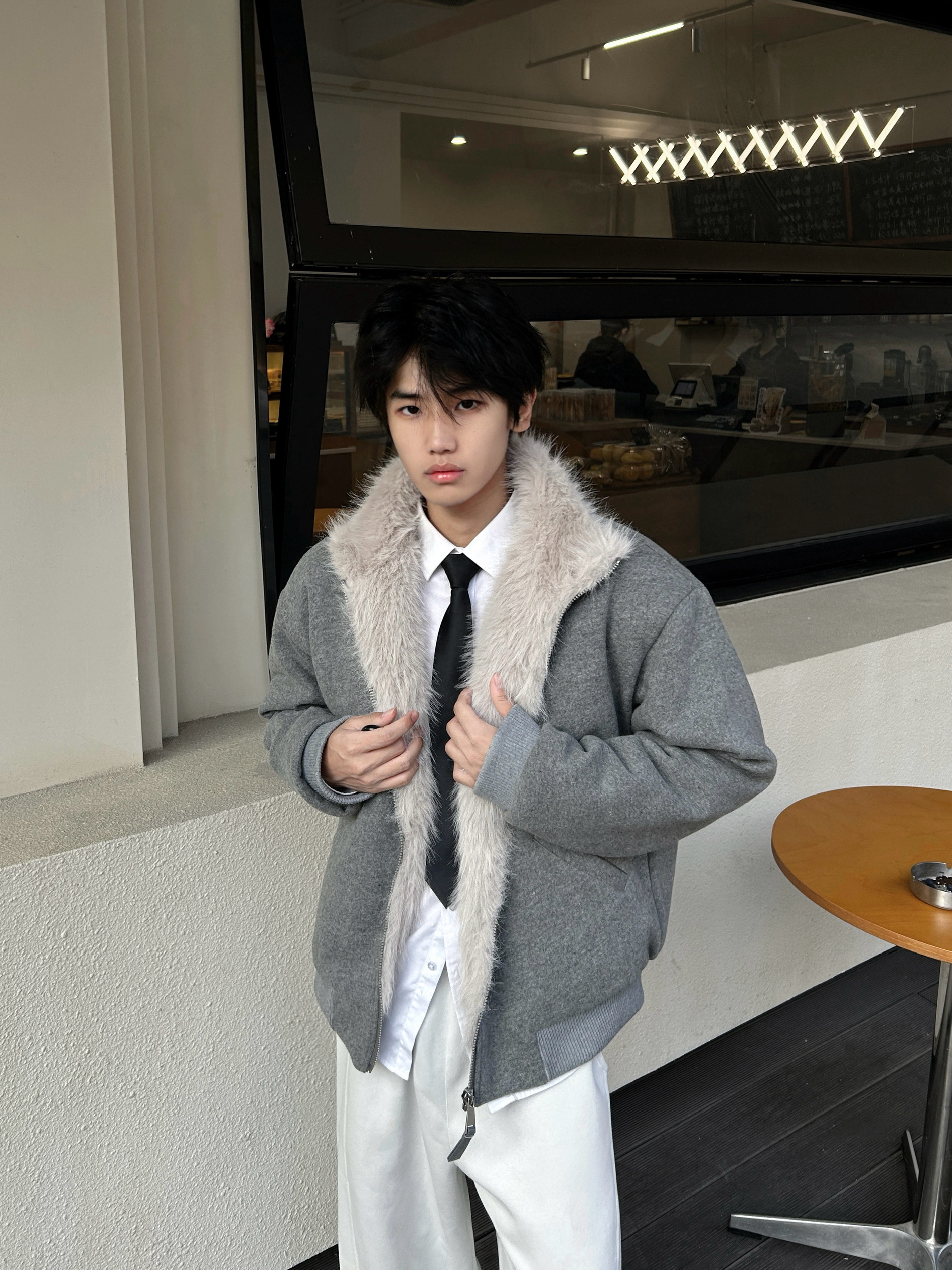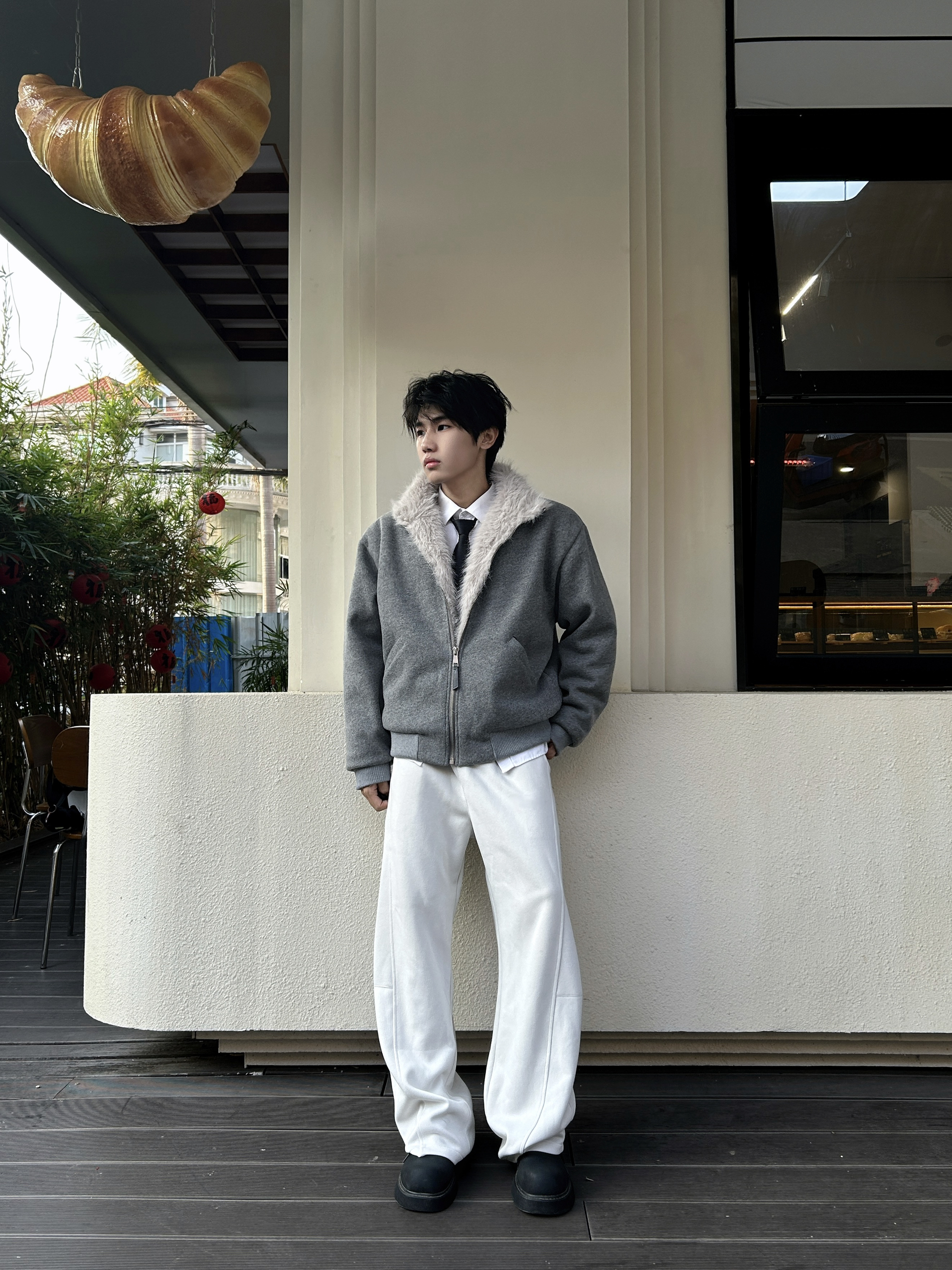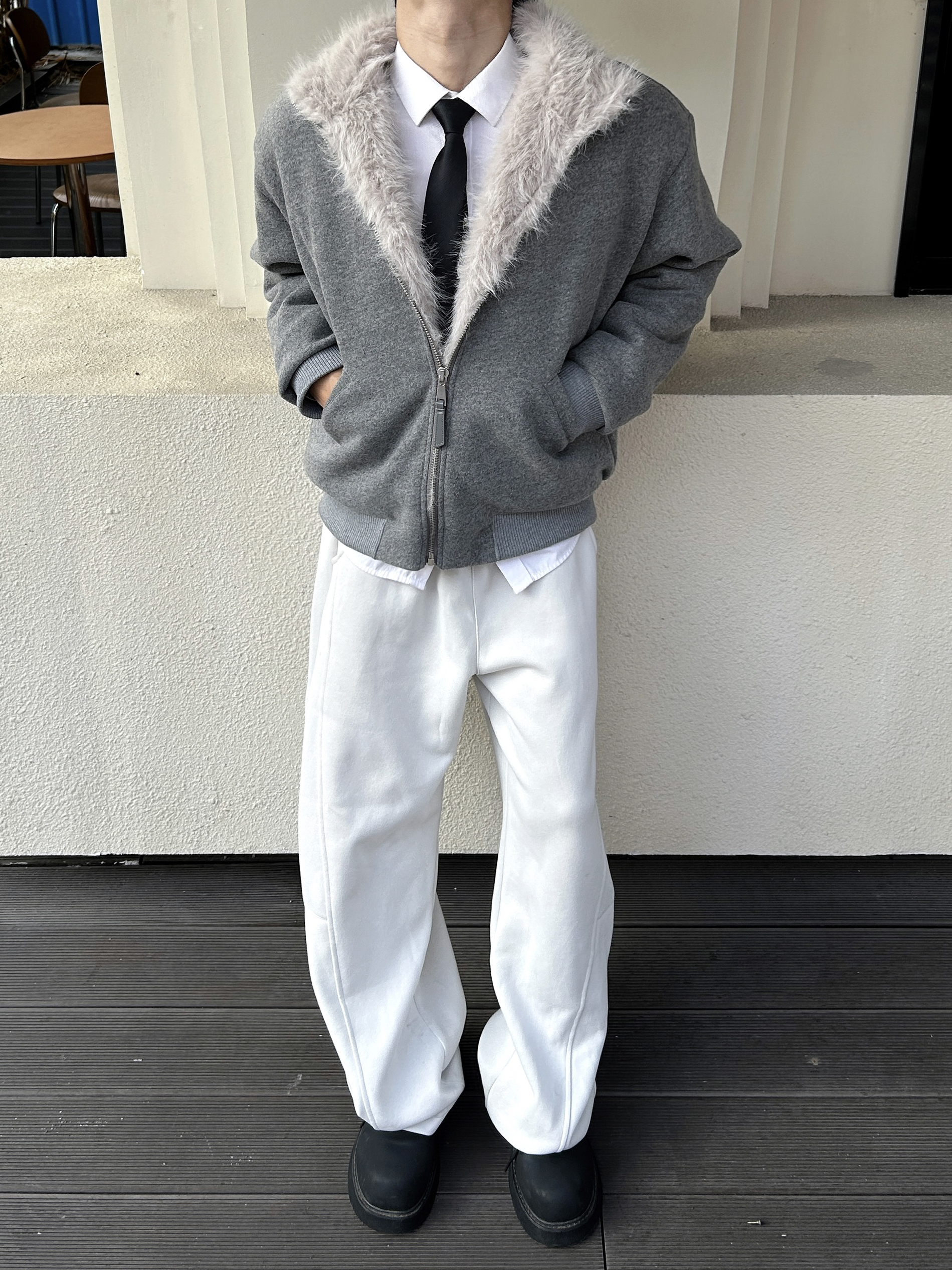 今天的阳光刚好 饱和度拉满的暖冬里一件灰色坐山雕外套成了全场焦点 毛绒领口的温暖与高级灰的冷感碰撞 内搭一件简单的白衬衫 再系上一条领带 瞬间就把松弛感和精致感平衡得恰到好处 下身搭配一条白色clean fit休闲裤 与上身的浅灰形成柔和过渡 再踩一双黑色厚底鞋,利落又不沉闷。