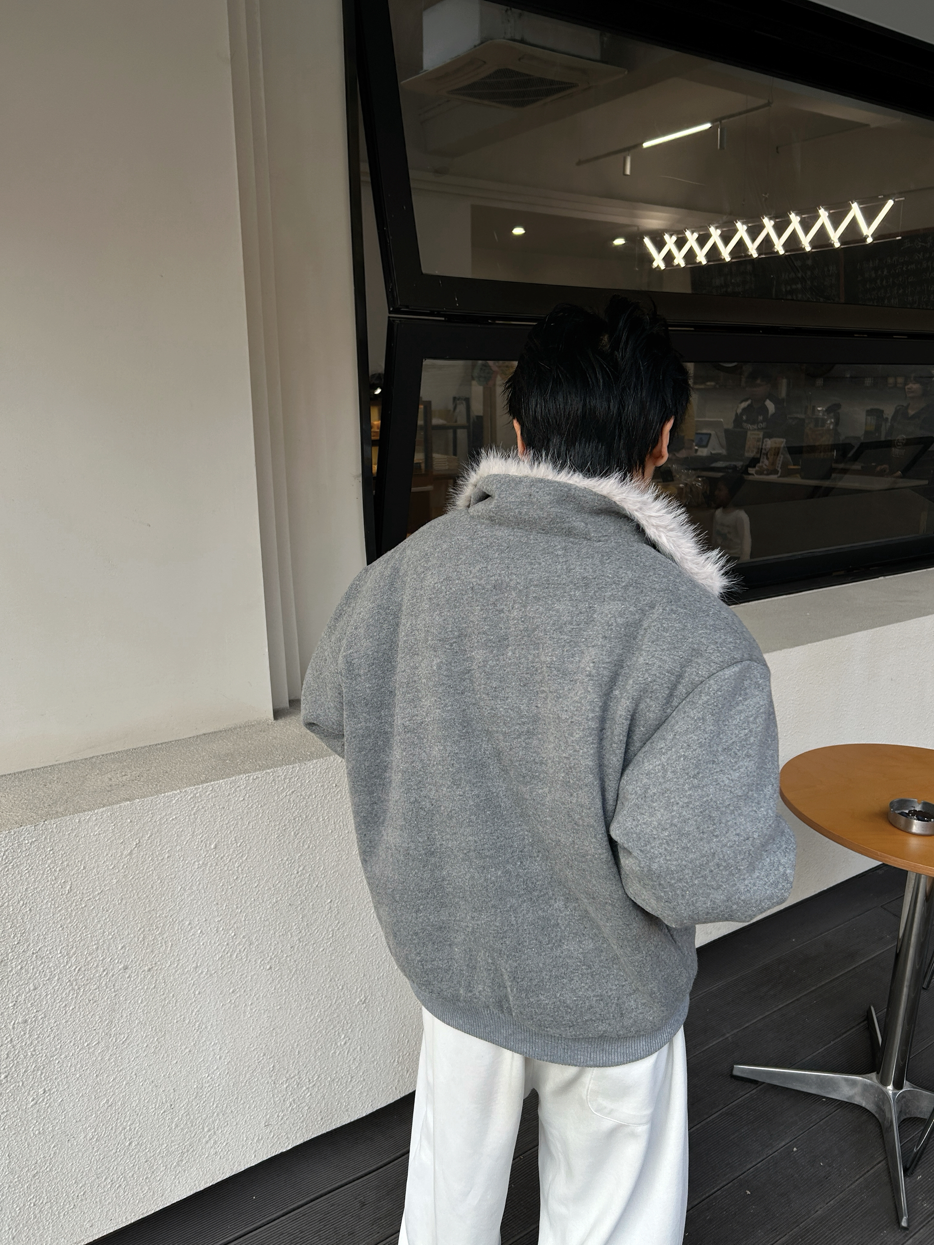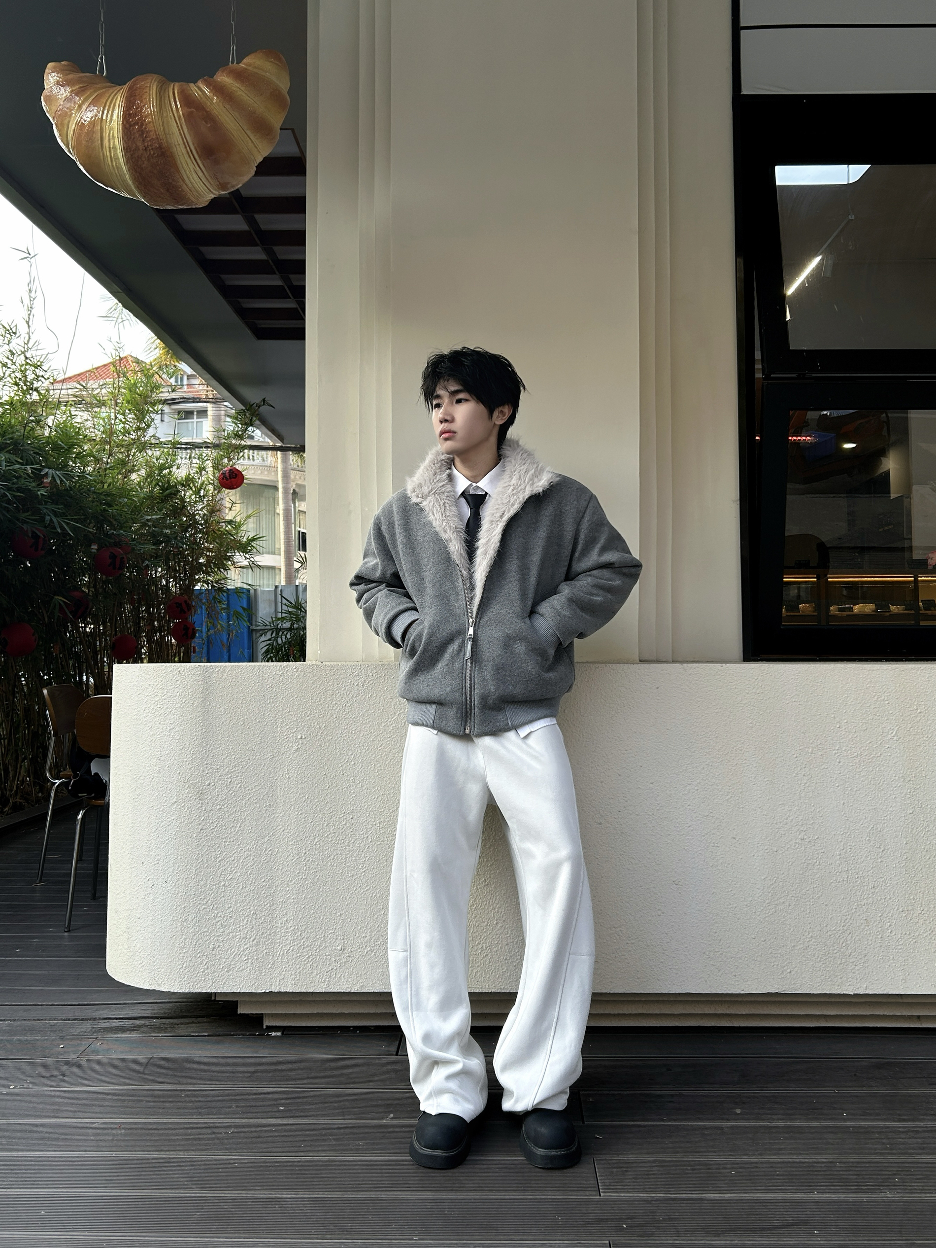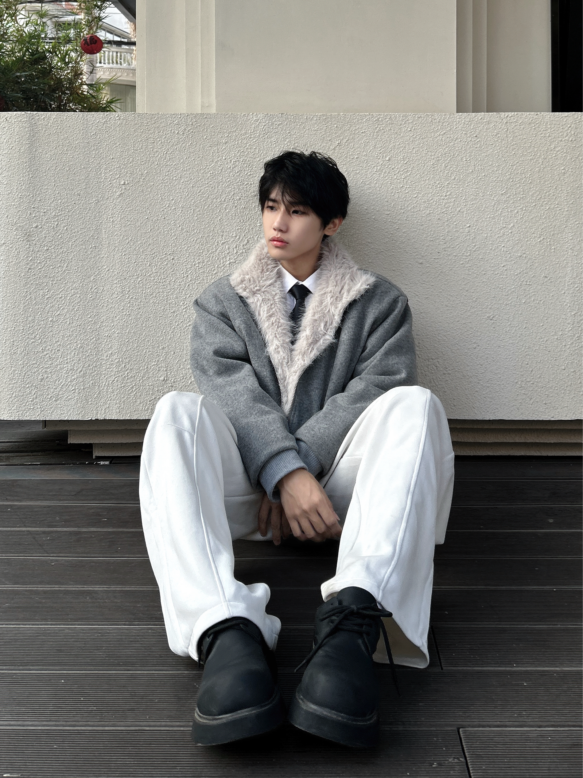 今天的阳光刚好 饱和度拉满的暖冬里一件灰色坐山雕外套成了全场焦点 毛绒领口的温暖与高级灰的冷感碰撞 内搭一件简单的白衬衫 再系上一条领带 瞬间就把松弛感和精致感平衡得恰到好处 下身搭配一条白色clean fit休闲裤 与上身的浅灰形成柔和过渡 再踩一双黑色厚底鞋,利落又不沉闷。