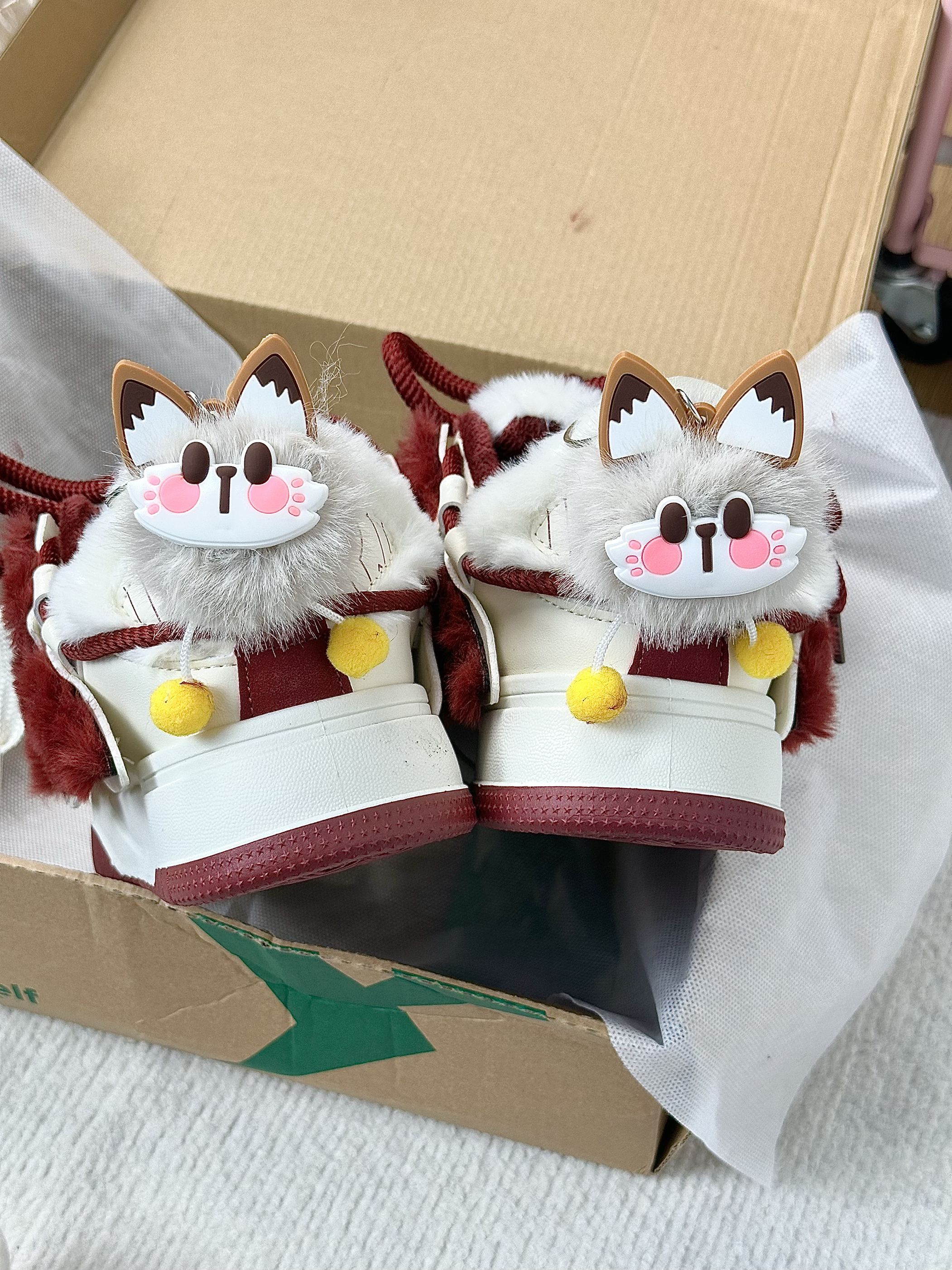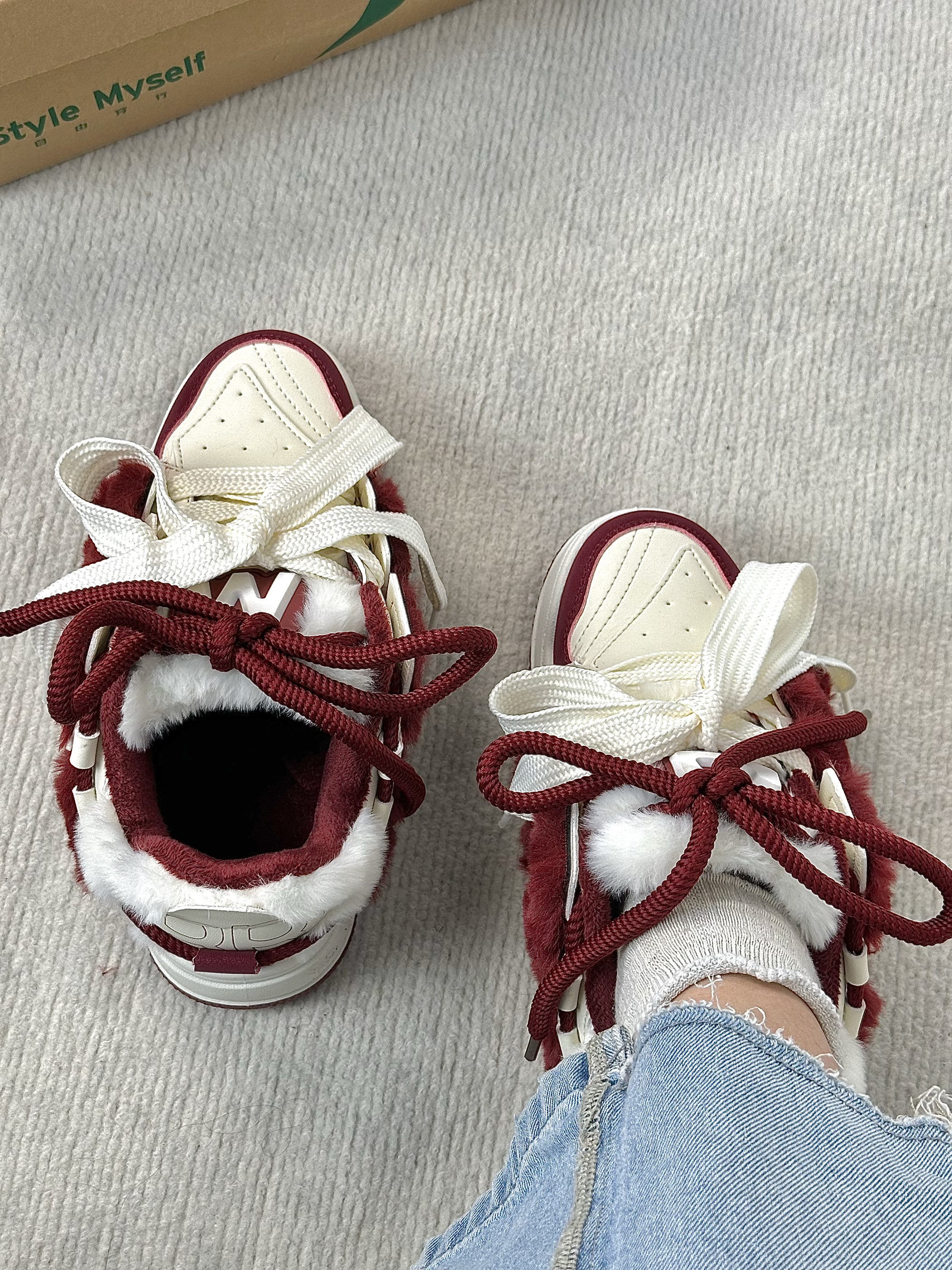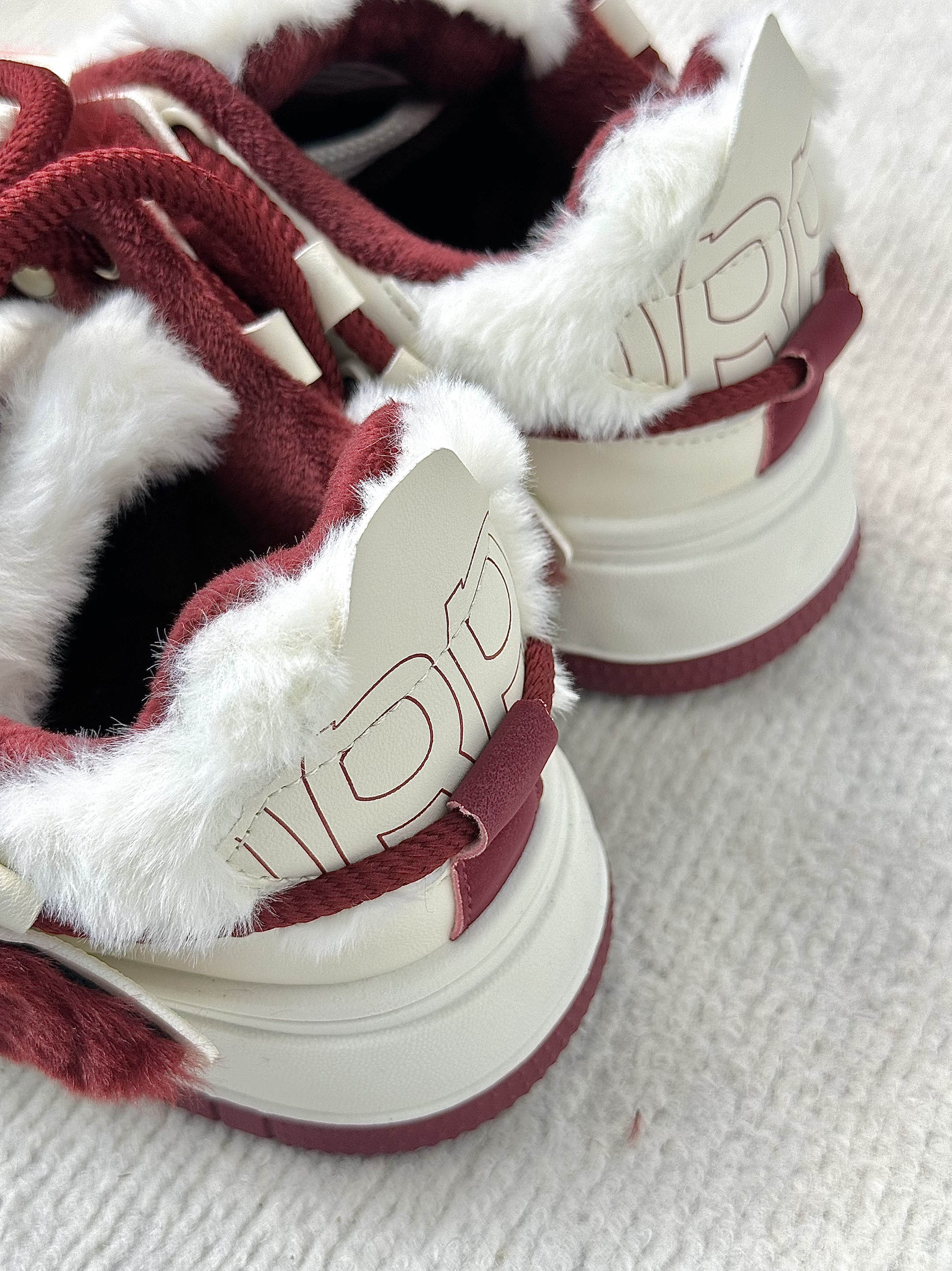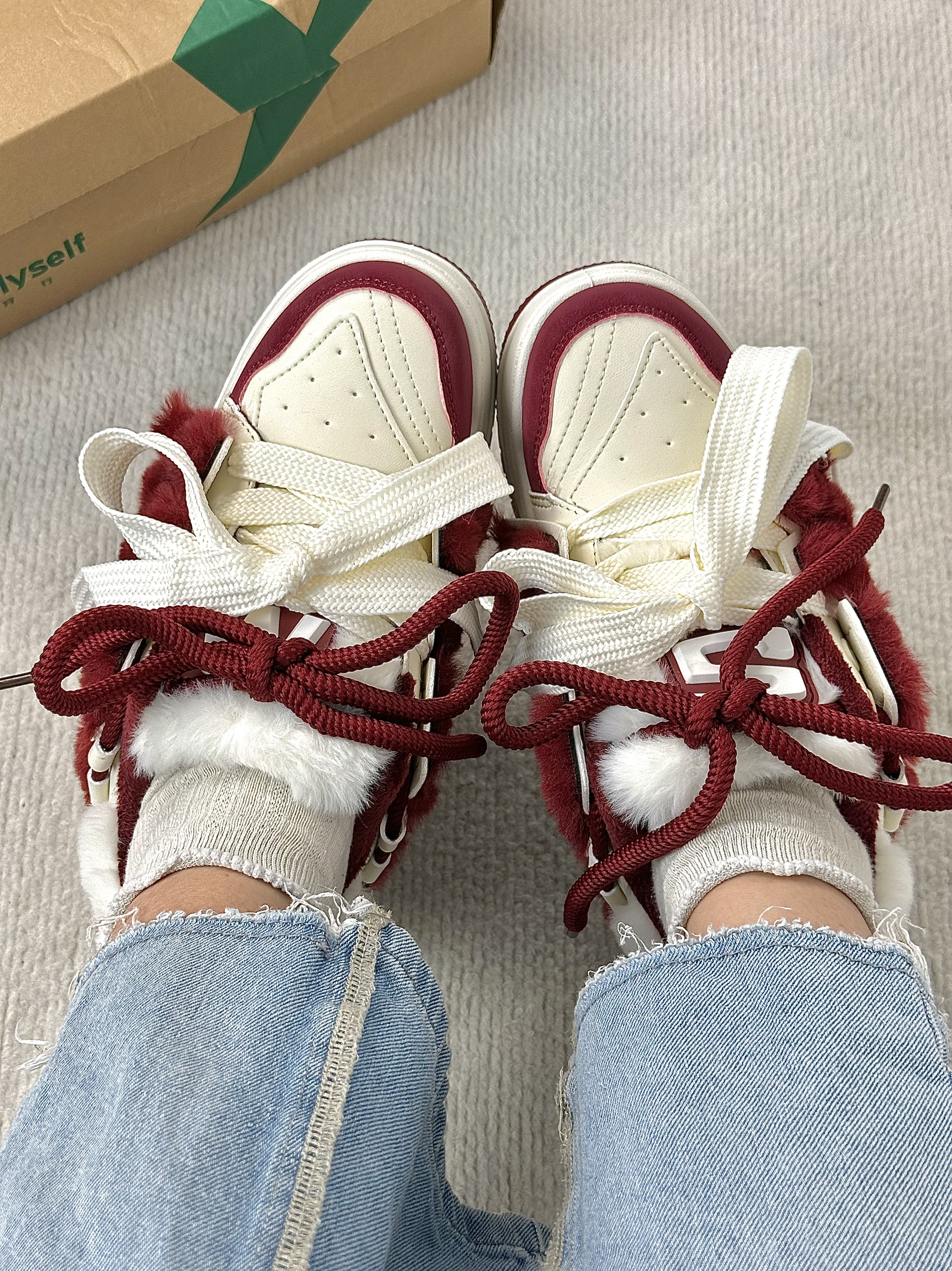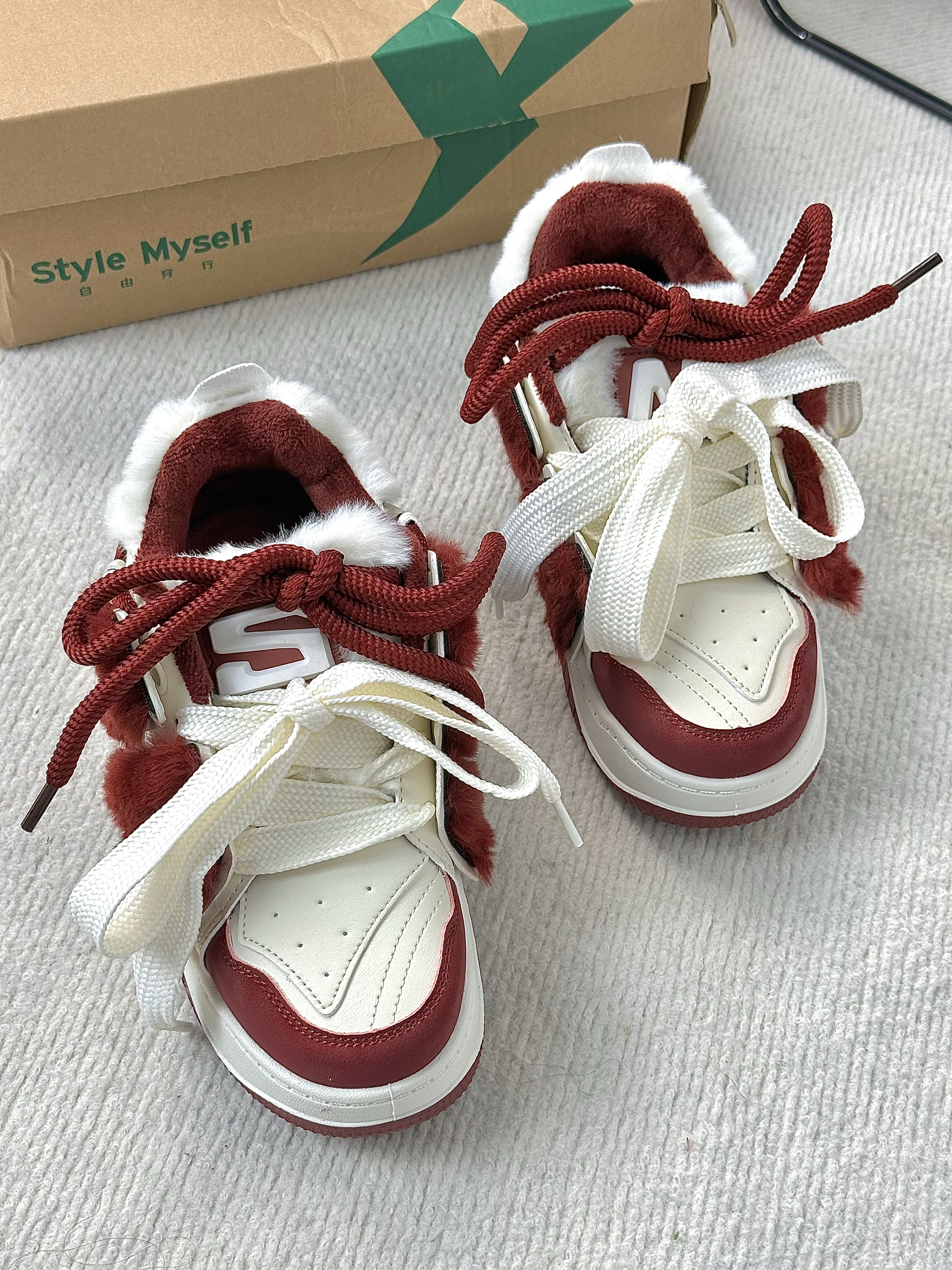 真的要被这双毛茸茸板鞋阔爱鼠了!甜酷感拉满,一眼冬天,一眼新年🧧 软乎乎绒面裹住整个鞋身,看着就超暖的好嘛~ 结合经典板鞋版型,上脚意外轻盈不笨重,是乖乖的又带点小个性的氛围。 最爱这个双鞋带细节:酒红圆绳+米白扁带,不同颜色+材质叠搭,层次感瞬间到位。 内里也做了加绒!冬天怕冻jio的女生真的会懂~ 不过毛绒较多,雨雪天尽量别穿,避免绒面结块哦。 尺码小提示:瘦脚姐妹建议选小半码更贴脚。