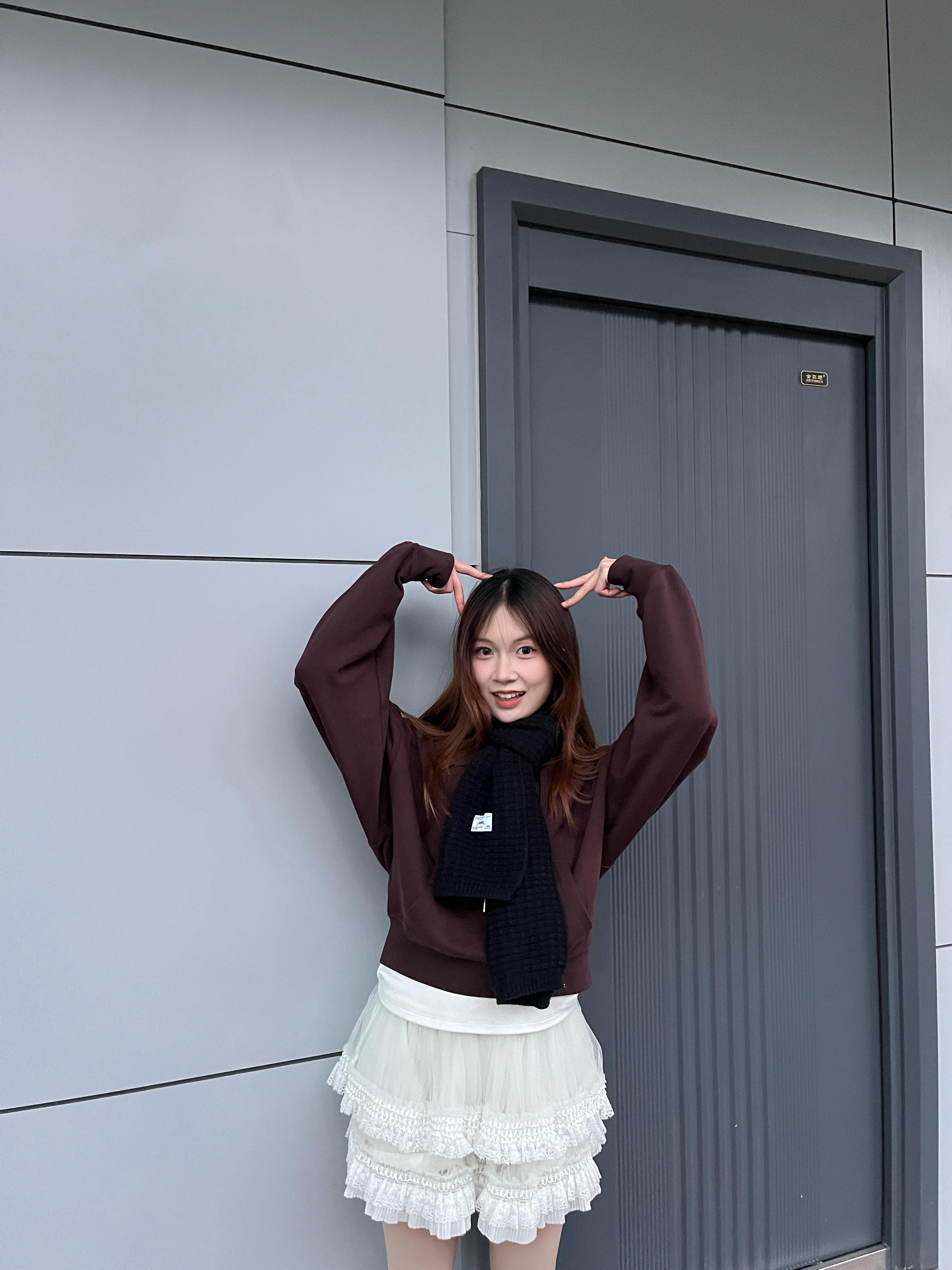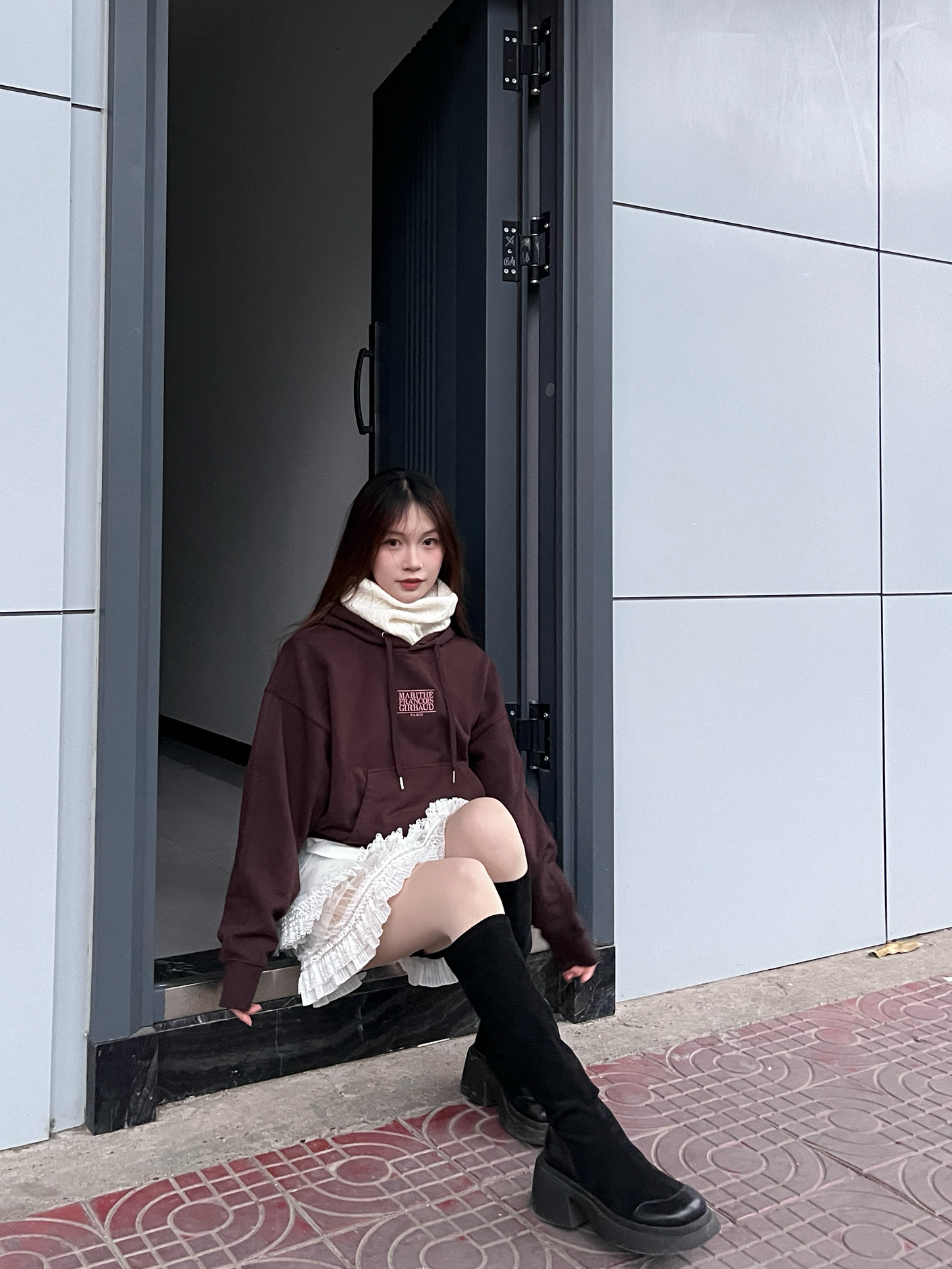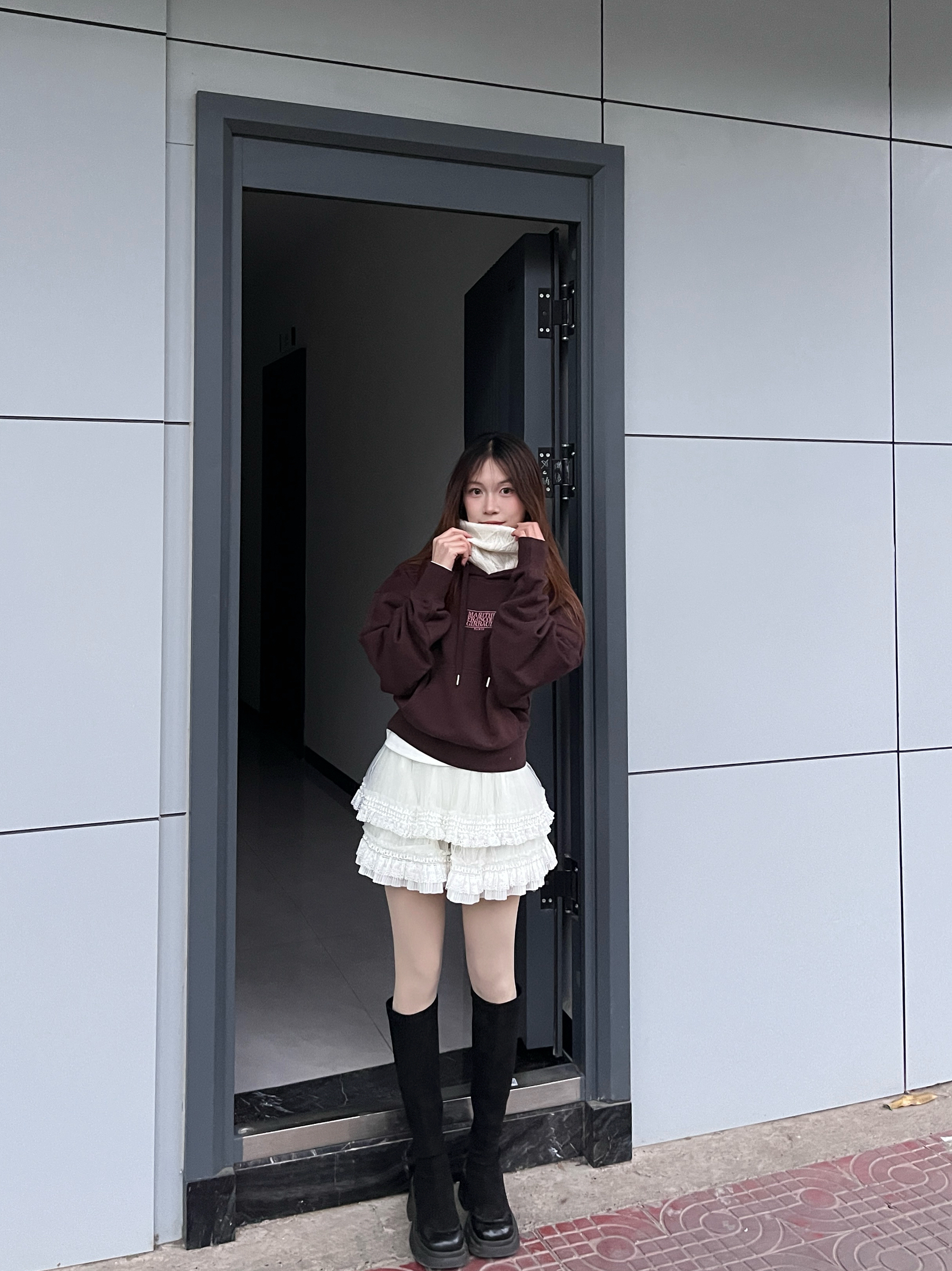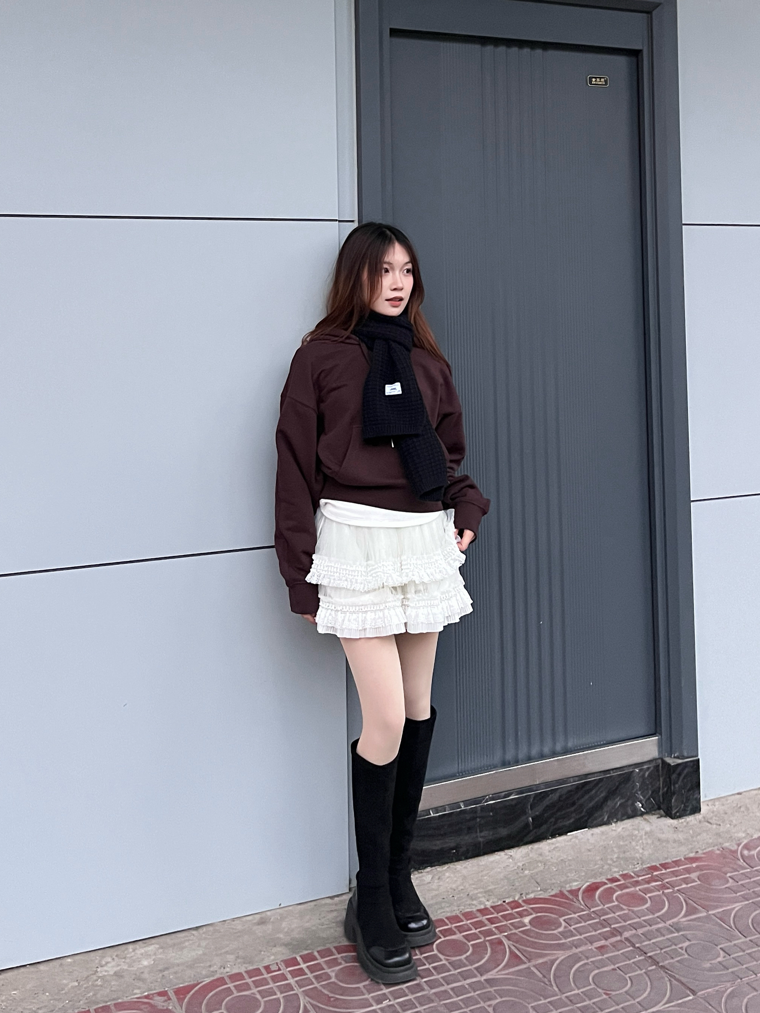 深棕色短款卫衣利落显比例,搭配白色蕾丝蛋糕裙,柔美的裙装中和了卫衣的休闲感。黑色长靴拉高腿部线条,添了几分酷飒,简约的搭配却碰撞出甜酷交织的风格,不管是日常出行还是打卡拍照都很合适。