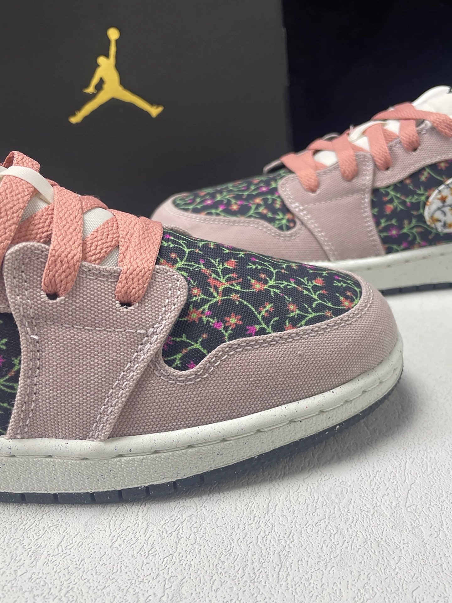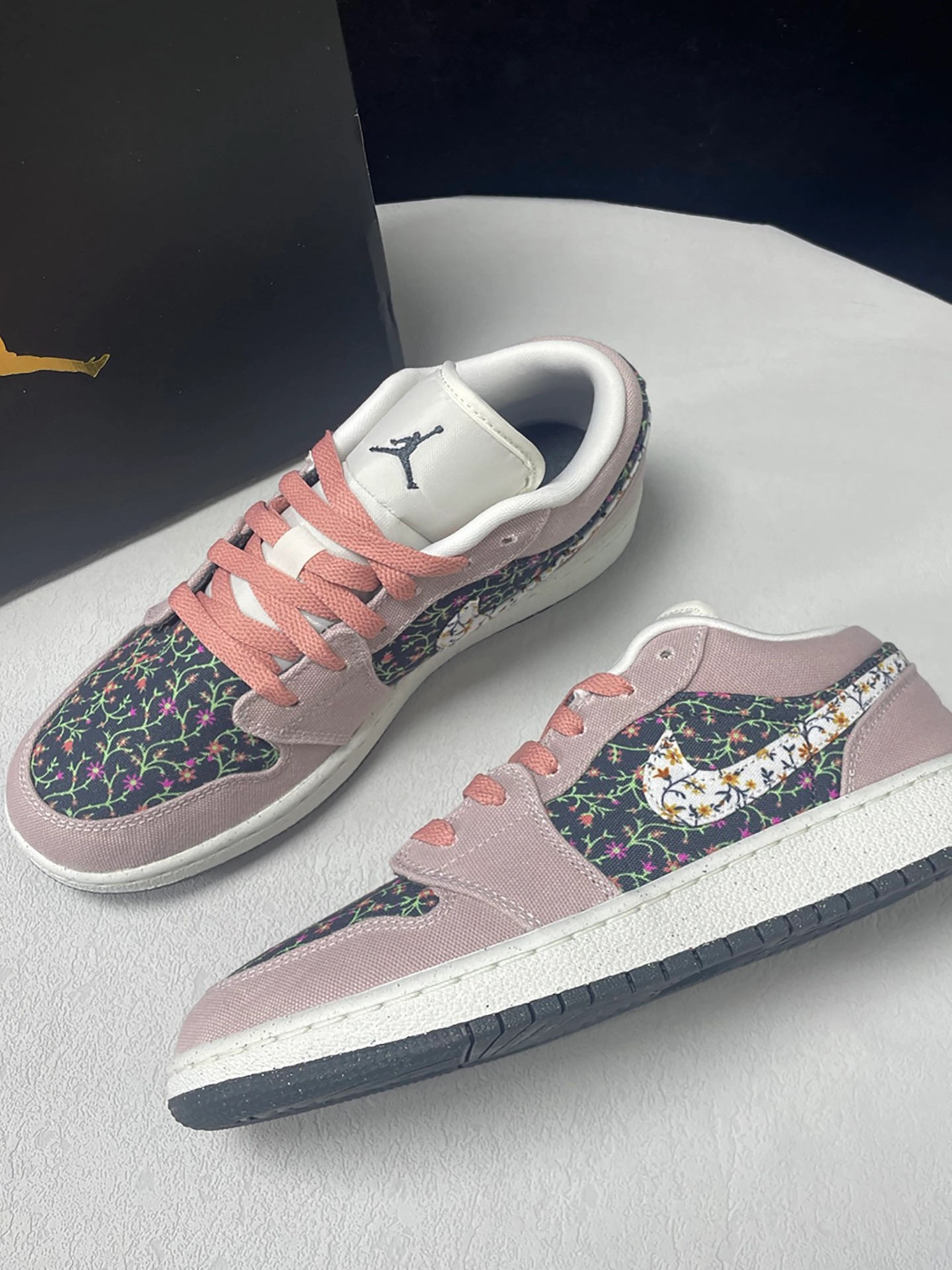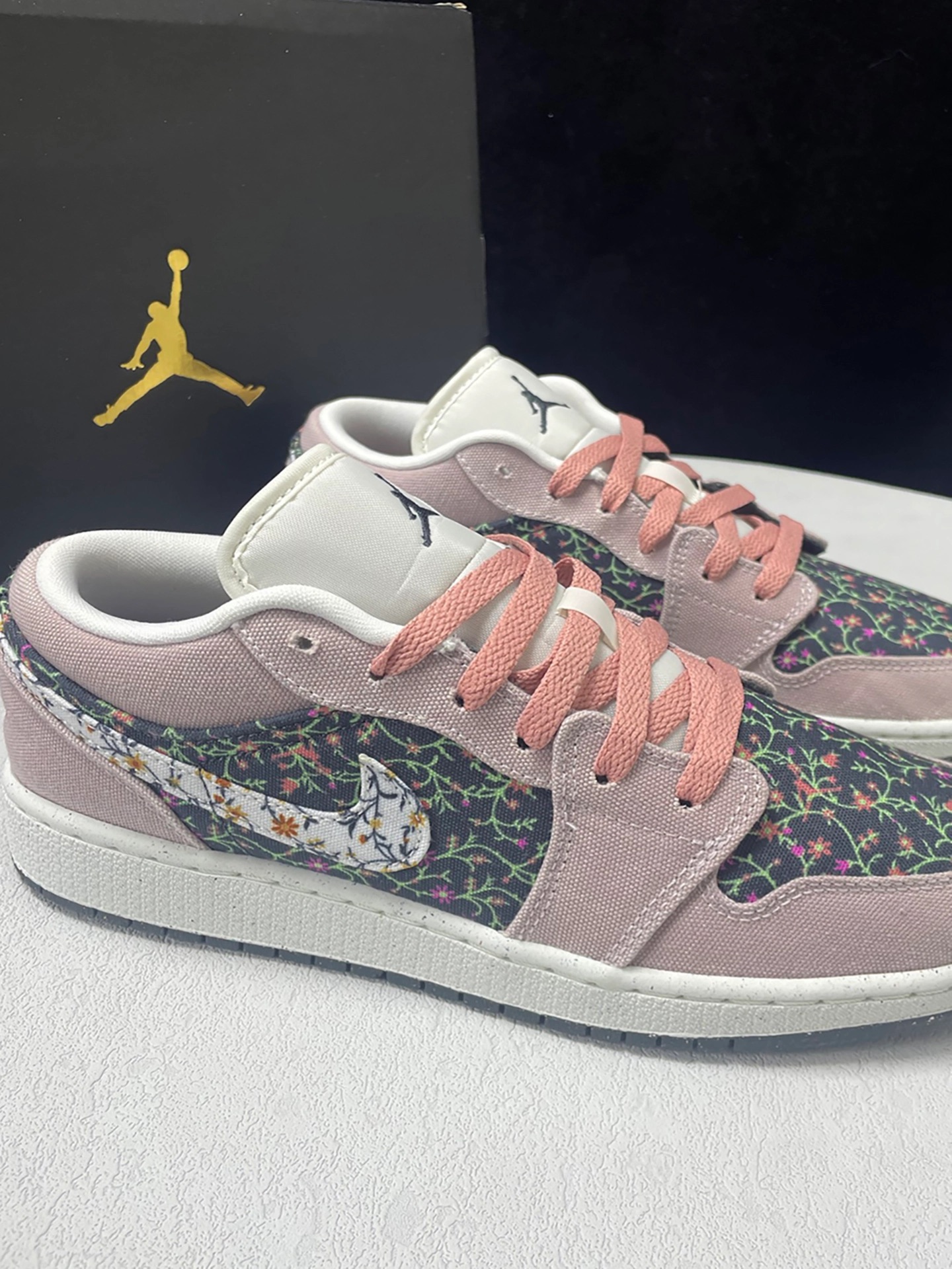 谁懂啊‼️ 新拆的AJ1 Low花卉款直接爱住💕~ 白粉主调+鞋身小花朵🌸,织物面料软乎乎还透气,上脚贴合脚型~ 昨天穿它去操场散步🐾,搭浅灰运动服+牛仔直筒裤,同学路过说“你这鞋好有春天感✨”,我心里偷乐~走了半小时脚也没酸,日常穿超合适~ 小建议:码数按平时选✅,搭配工装裤/牛仔裤都好看,通勤或游玩都适配~ 喜欢的宝快安排上呀🥰!