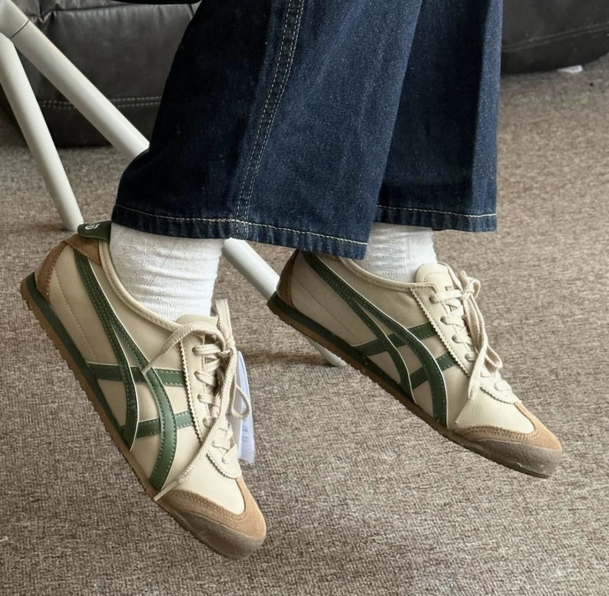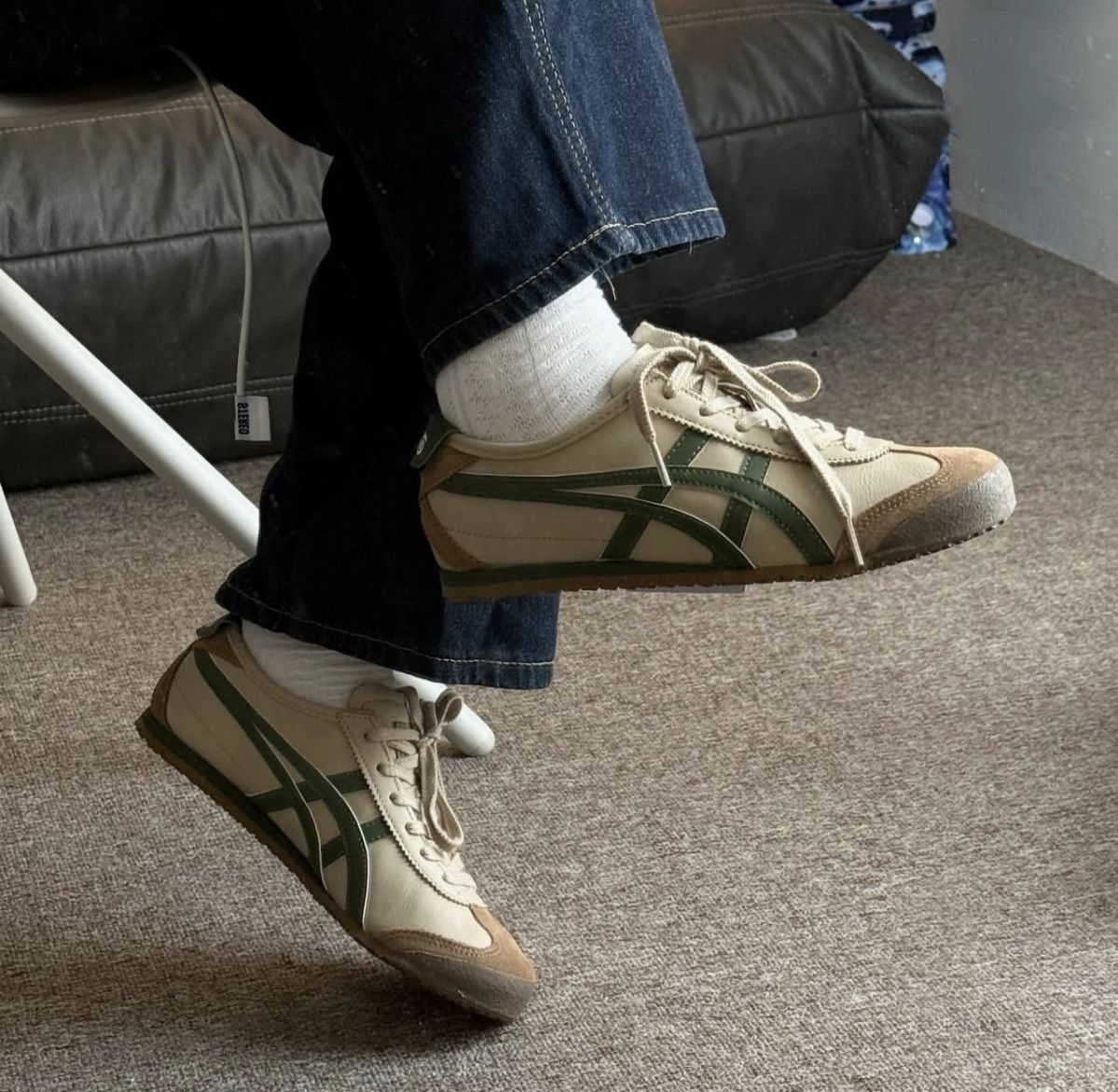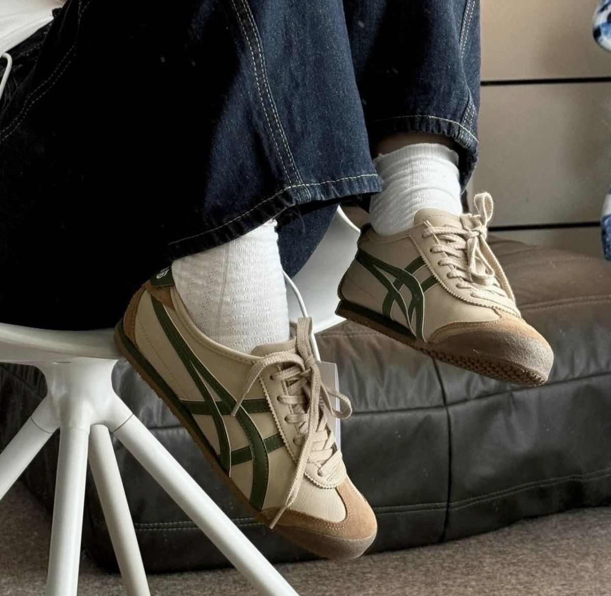 经典的MEXICO 66鞋型搭配米白+抹茶绿的撞色设计,帆布与皮质拼接的鞋身,自带做旧的复古质感。标志性的虎爪纹线条利落,生胶大底踩出软糯脚感,搭配牛仔裤、工装裤都能轻松拿捏日系cityboy风格。 从街头到日常,这双鬼塚虎既保留了品牌的经典基因,又以清新的配色打破沉闷,是复古鞋控的必入款。